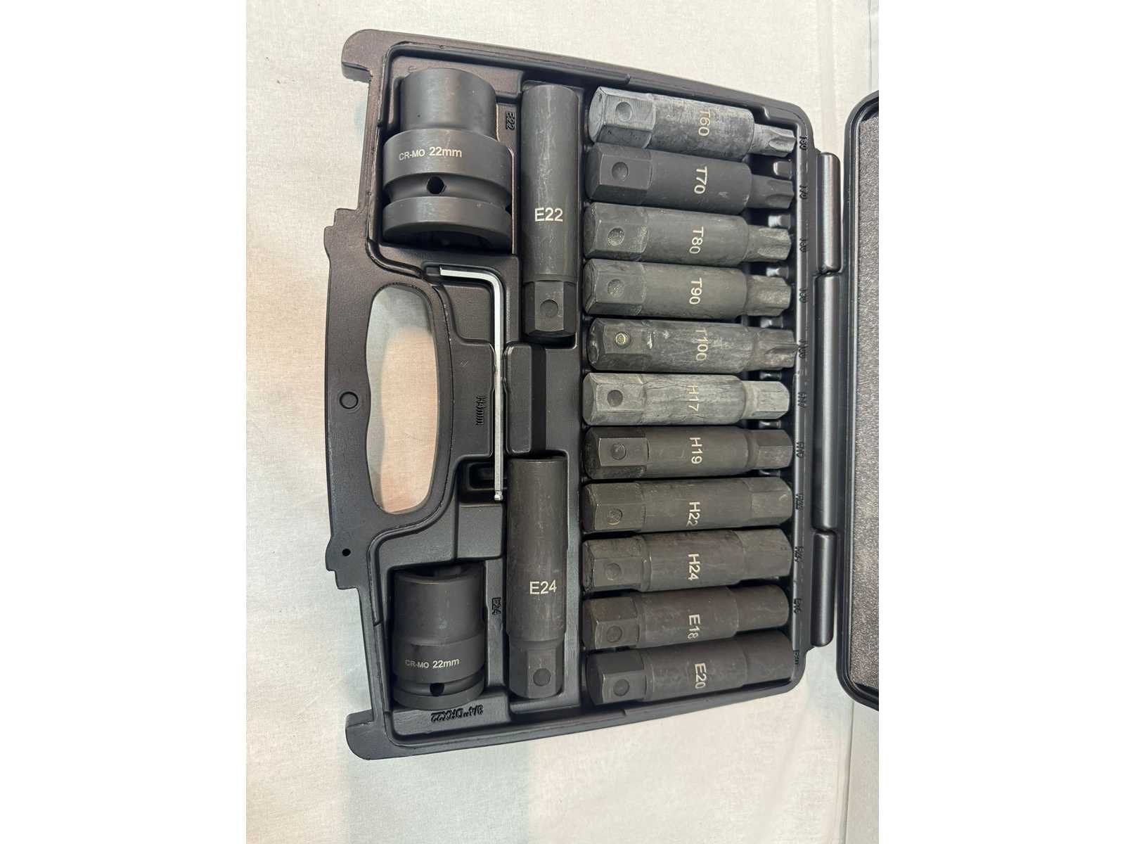 13 bits met 22 mm zeskantaandrijving, geschikt voor zware toepassingen TX-profielen: TX60, TX70, TX80, TX90, TX100 Binnenzeskant: 17, 19, 22, 24 mm E-profielen: E18, E20, E22, E24 Bithouders: 3/4" en 1" aandrijving Haakse schroevendraaier Met koffer: true
