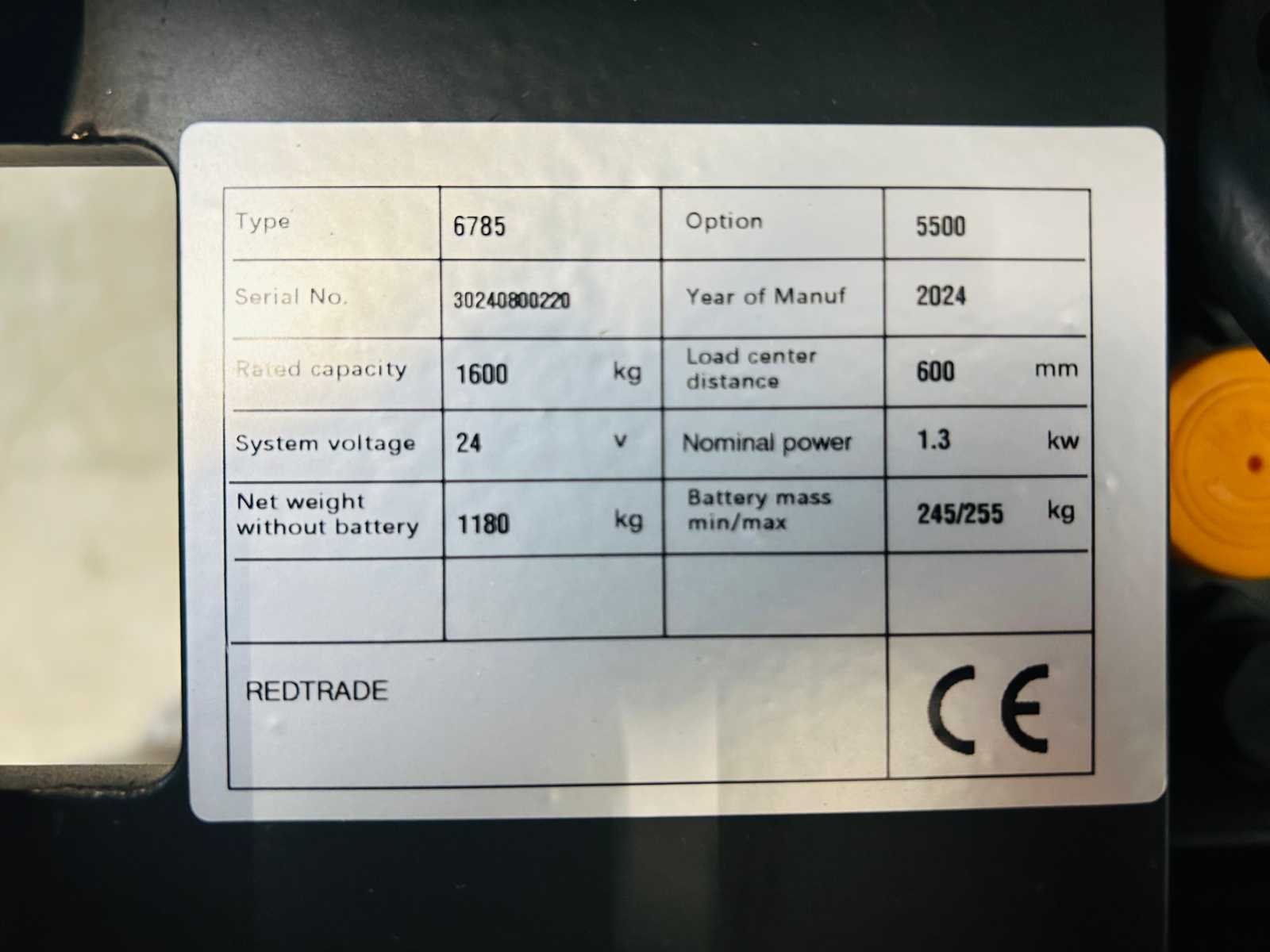 Dubbele frontrollers; noodstop; codeslot; handleiding; batterij indicator; 6785 Merk: Noblelift Type: PSE16L55 Bouwjaar: 2024 Hefvermogen: 1600kg Hefhoogte: 5500mm Lepellengte: 1140mm Afgelezen urenstand: 0 Eigen gewicht: 1400kg Minimale doorrijhoogte: 2420mm Totale afmeting L: 1820mm Totale afmeting Breedte: 820mm Totale afmeting Hoogte: 2420mm Meerij stapelaar: true Accu lader: true