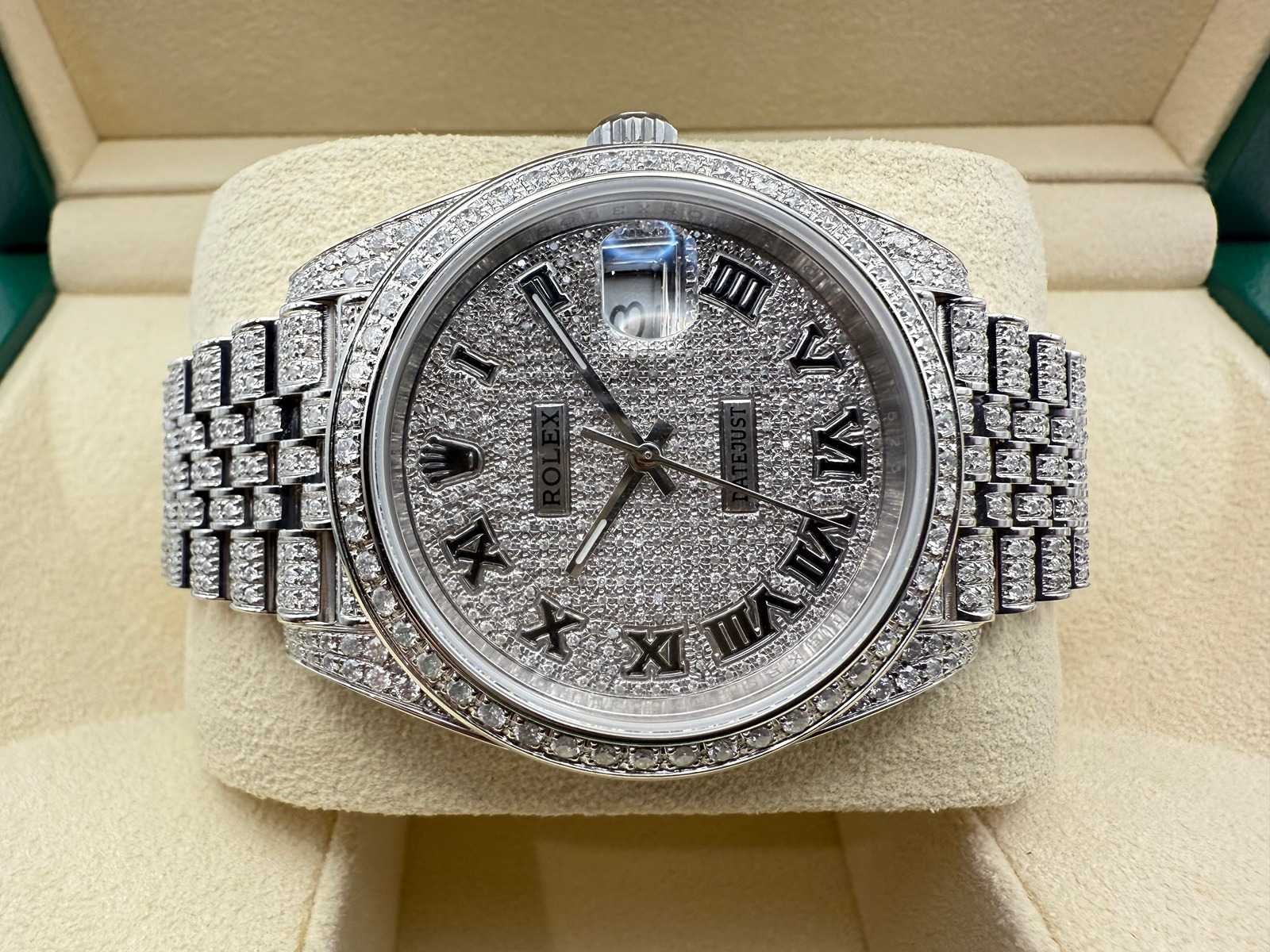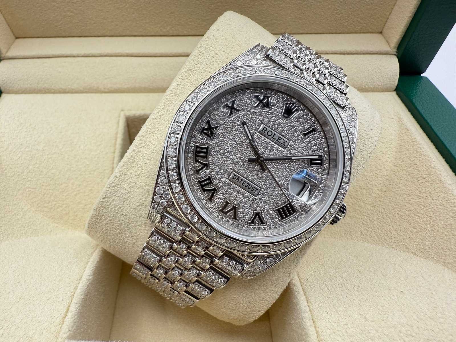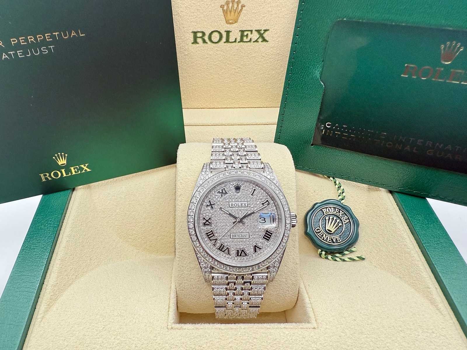 Rolex Datejust 41mm “Iced Out” – Fully Set with Diamonds This breathtaking Rolex Datejust 41mm, completely covered in diamonds, including the dial, is in brand-new and unworn condition. Often referred to as “iced out,” this stunning timepiece is a true statement of luxury. It comes as a full set, including the original Rolex box, booklets, warranty card holder, Rolex guarantee card, and tag. Key features: Model: Rolex Datejust 41mm Condition: Brand new, unworn Full diamond setting: Case, bracelet, and dial are fully set with diamonds Full set: Includes box, papers, warranty card, and Rolex tag This exceptional piece is a rare find, offering unmatched elegance and a striking appearance, perfect for collectors or anyone seeking a truly unique luxury watch. Merk: Rolex Model: Datejust Bouwjaar: 2022 Referentienummer: 126300 Materiaal kast: Steel / Diamonds Materiaal horlogeband: Steel / Diamonds Jubilee Materiaal sluiting: Steel / Diamonds Wijzerplaat: Diamonds Kastmaat: 41 mm