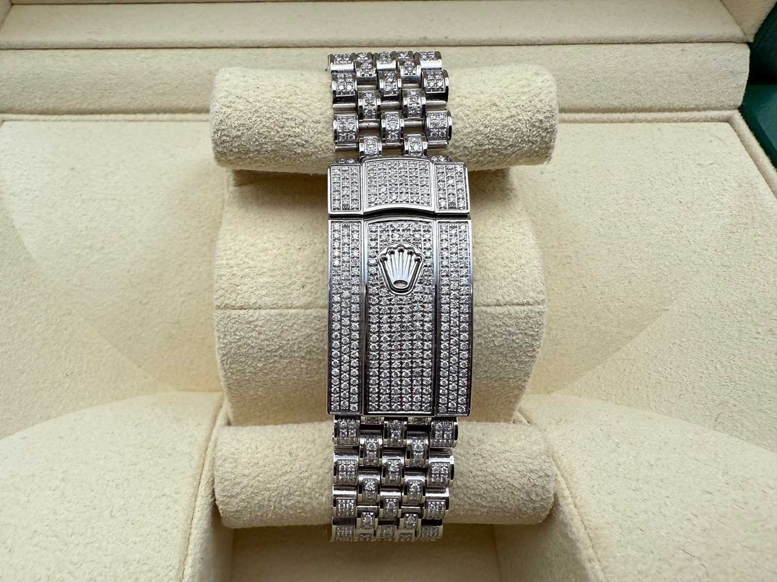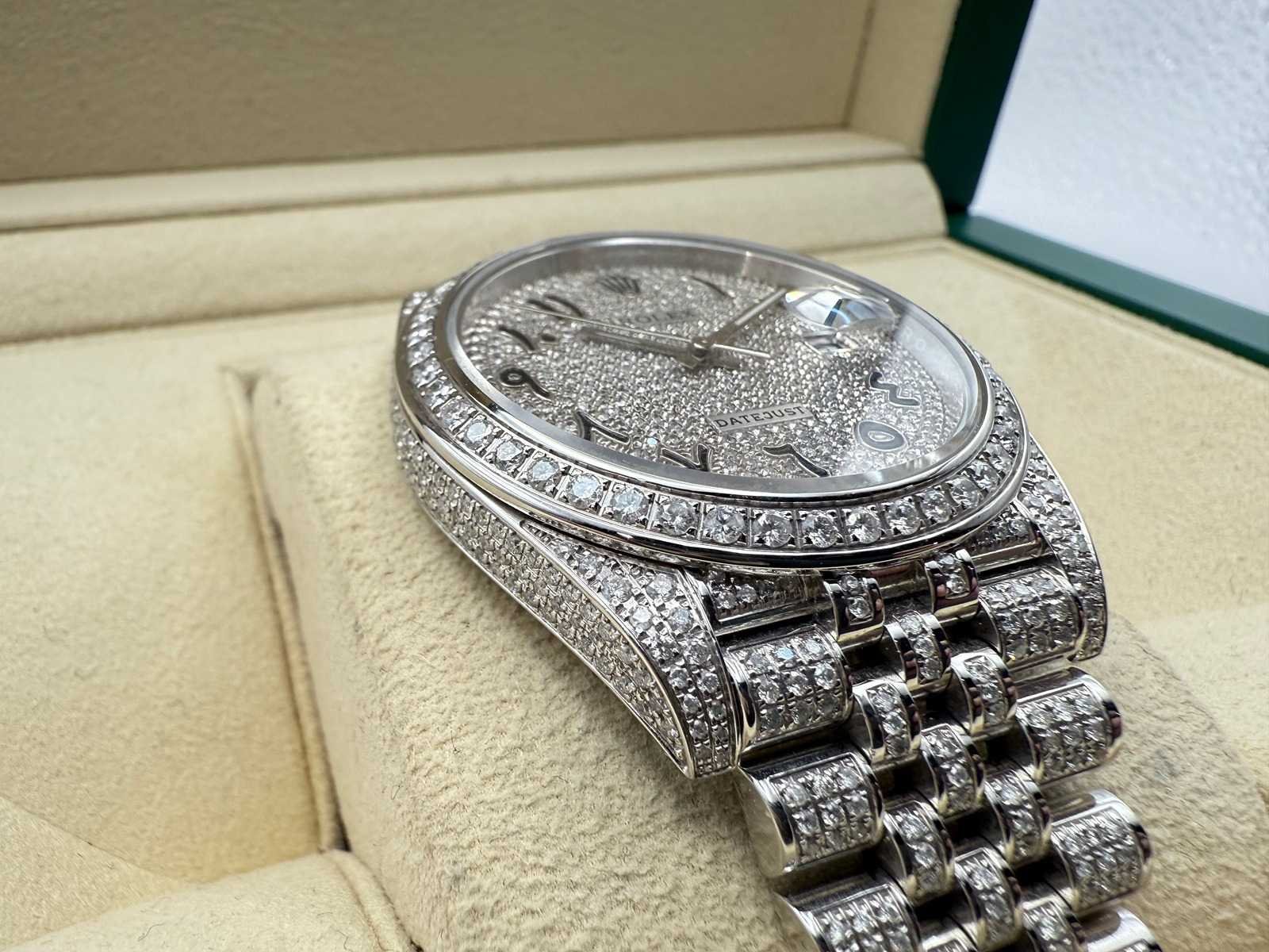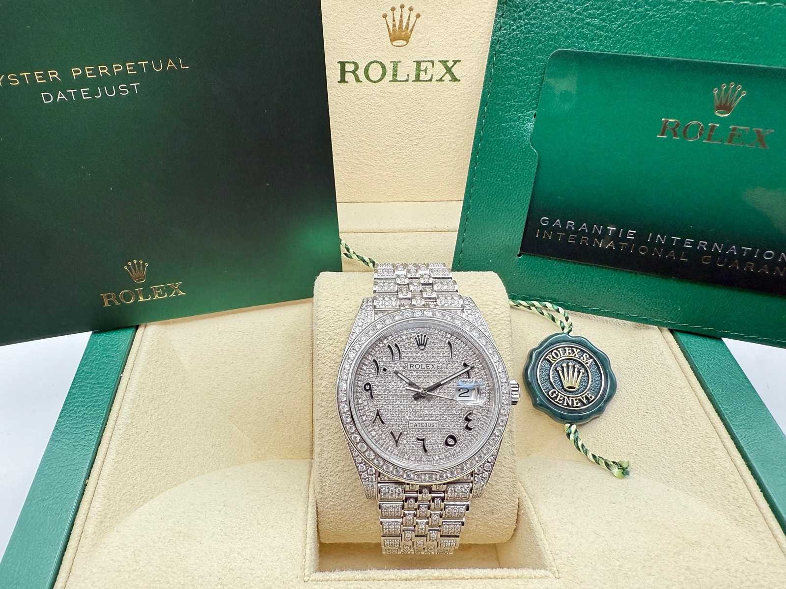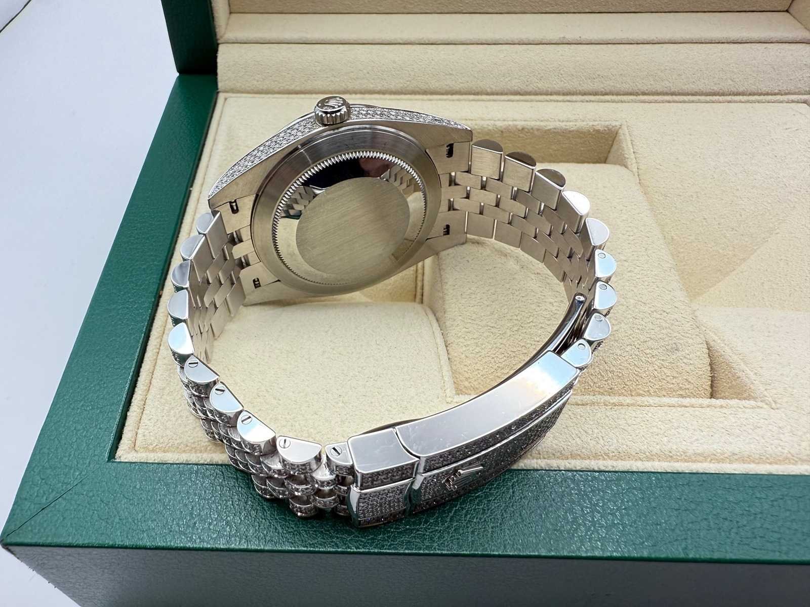 Rolex Datejust 41mm “Iced Out” – Fully Set with Diamonds This breathtaking Rolex Datejust 41mm, completely covered in diamonds, including the dial, is in brand-new and unworn condition. Often referred to as “iced out,” this stunning timepiece is a true statement of luxury. It comes as a full set, including the original Rolex box, booklets, warranty card holder, Rolex guarantee card, and tag. Key features: Model: Rolex Datejust 41mm Condition: Brand new, unworn Full diamond setting: Case, bracelet, and dial are fully set with diamonds Full set: Includes box, papers, warranty card, and Rolex tag This exceptional piece is a rare find, offering unmatched elegance and a striking appearance, perfect for collectors or anyone seeking a truly unique luxury watch. Merk: Rolex Model: Datejust Bouwjaar: 2022 Referentienummer: 126300 Materiaal kast: Steel / Diamonds Materiaal horlogeband: Steel / Diamonds Materiaal sluiting: Steel / Diamonds Wijzerplaat: Diamonds Kastmaat: 41 mm