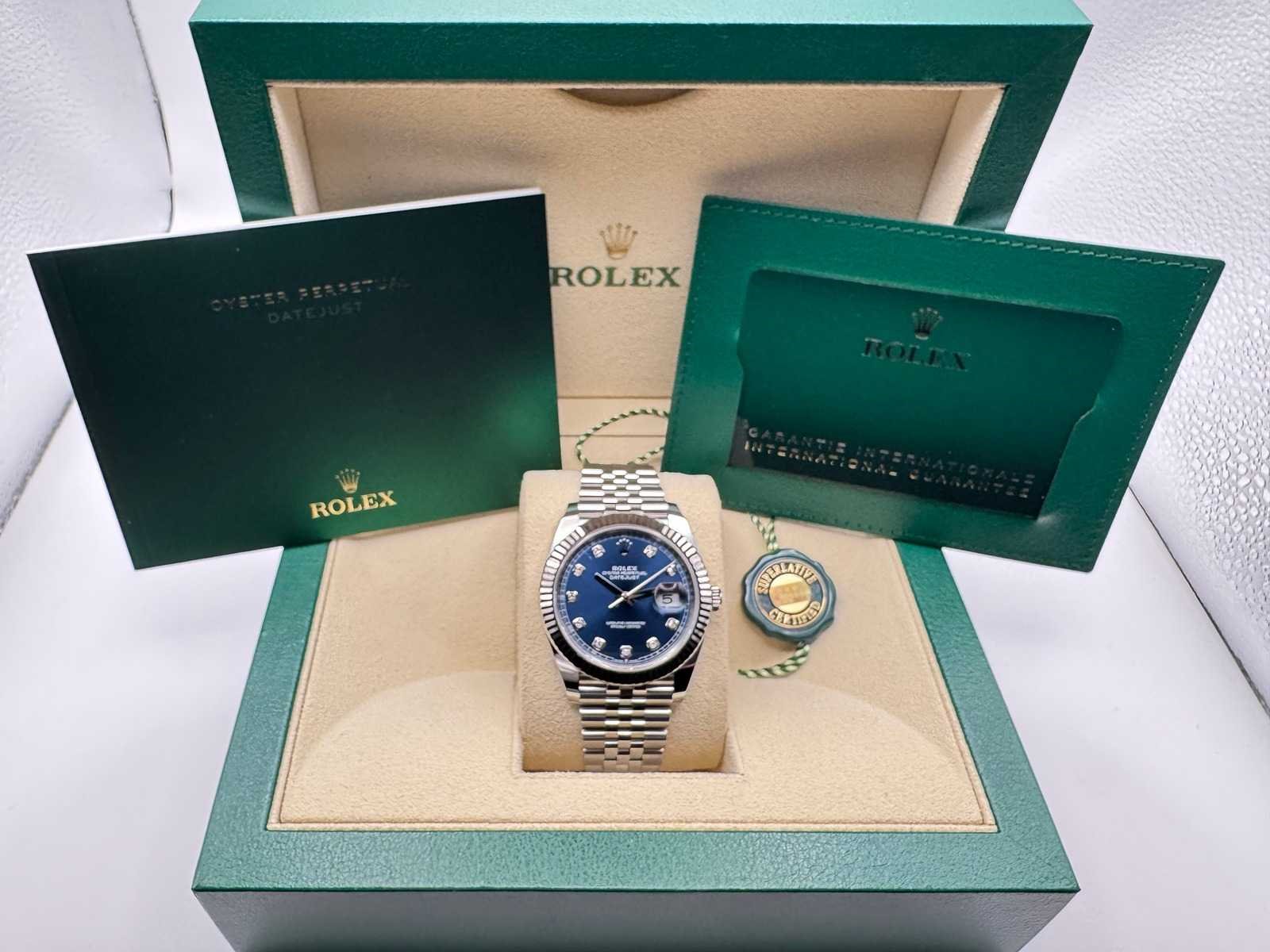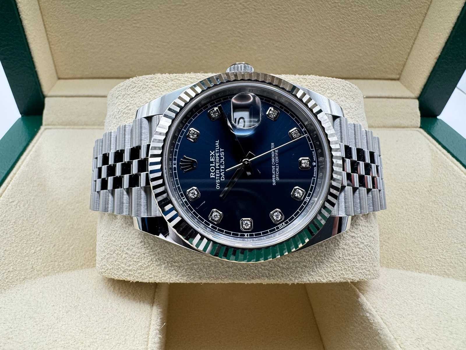 Condition: Brand new, unworn Set: Full set – includes original box, papers, Rolex warranty card, booklets, leather pouch, and Rolex tag Model: Datejust 41 (126334), 41mm Oystersteel case with white gold fluted bezel Features: Blue dial with diamond hour markers, Jubilee bracelet, automatic movement, 70-hour power reserve Warranty: Full 5-year international Rolex warranty Merk: Rolex Model: Datejust 41 Bouwjaar: 2025 Referentienummer: 126334 Materiaal kast: Steel Materiaal horlogeband: Steel Jubilee Fluted Materiaal sluiting: Steel Wijzerplaat: Blue Diamond Dot Kastmaat: 41 mm