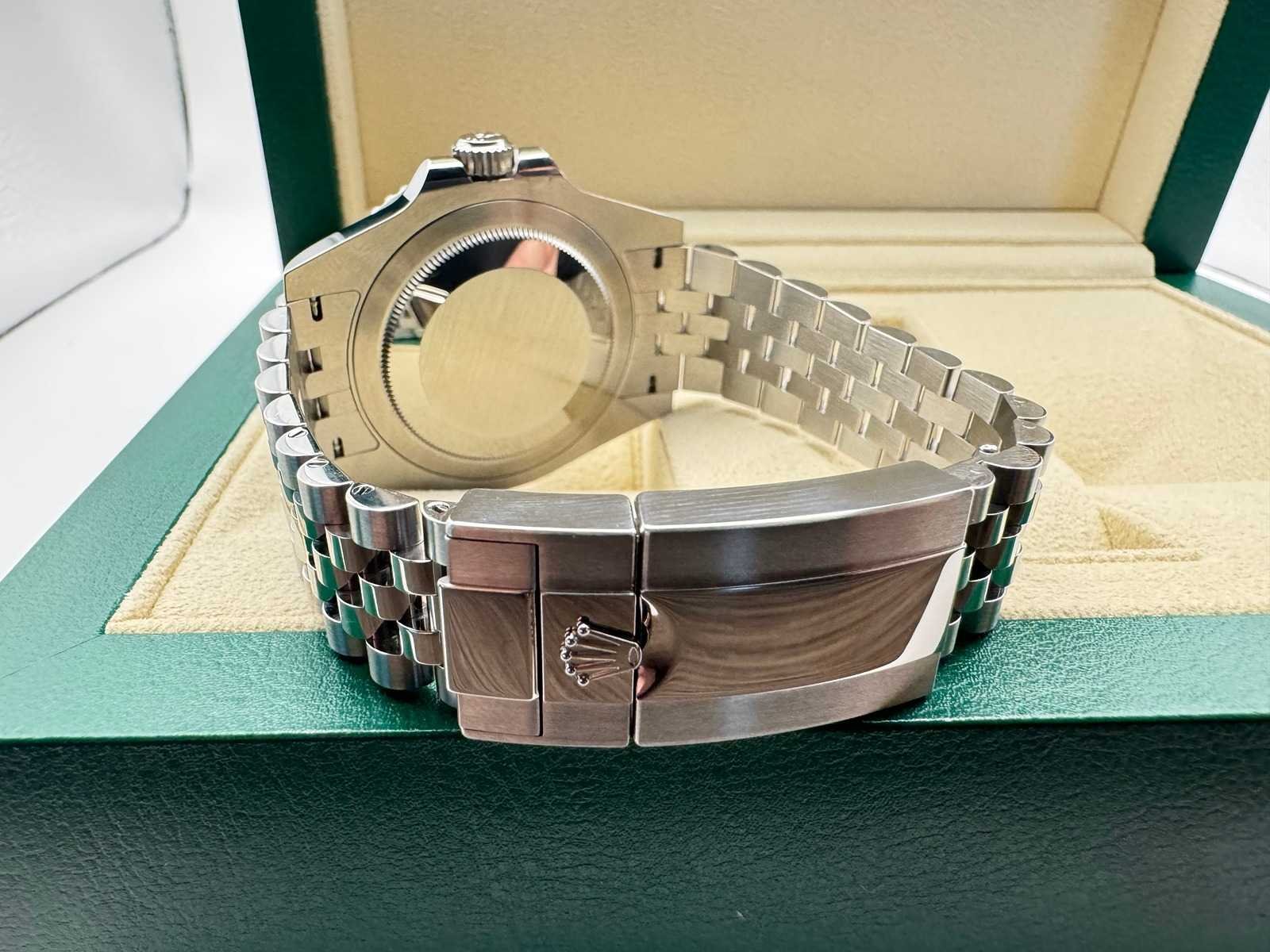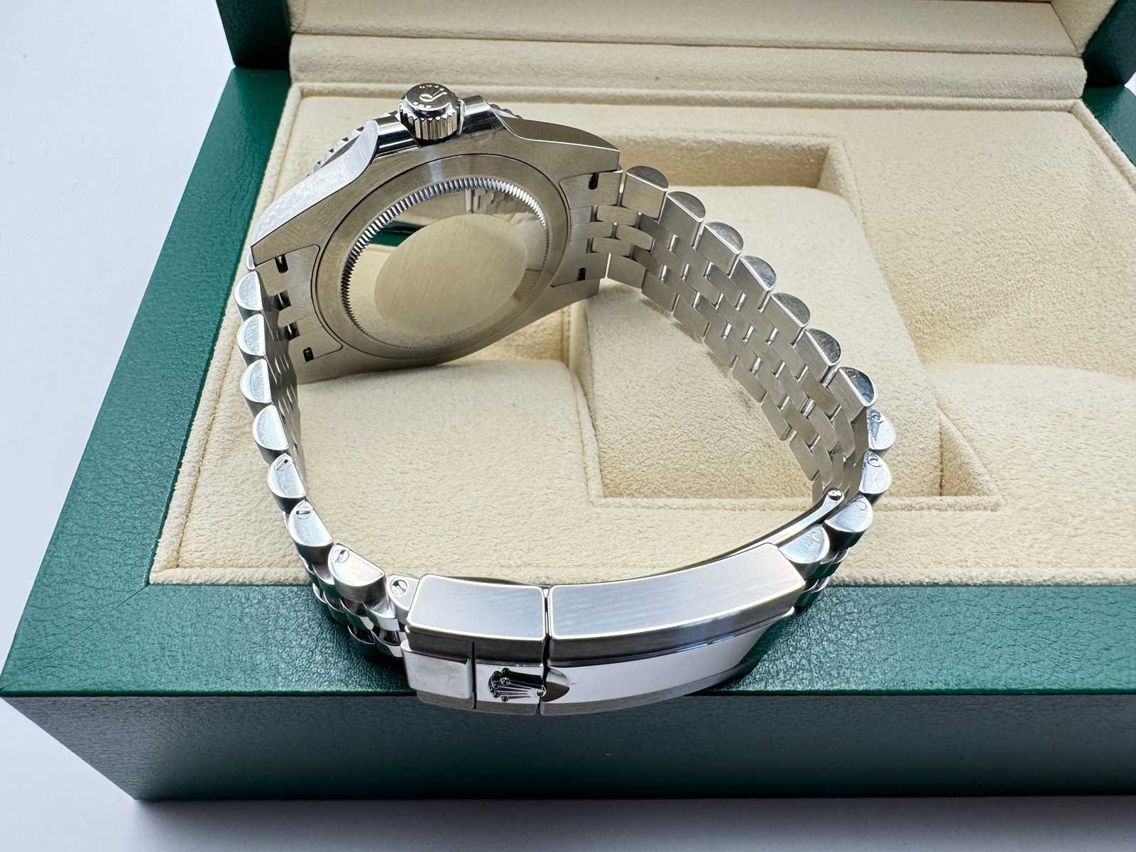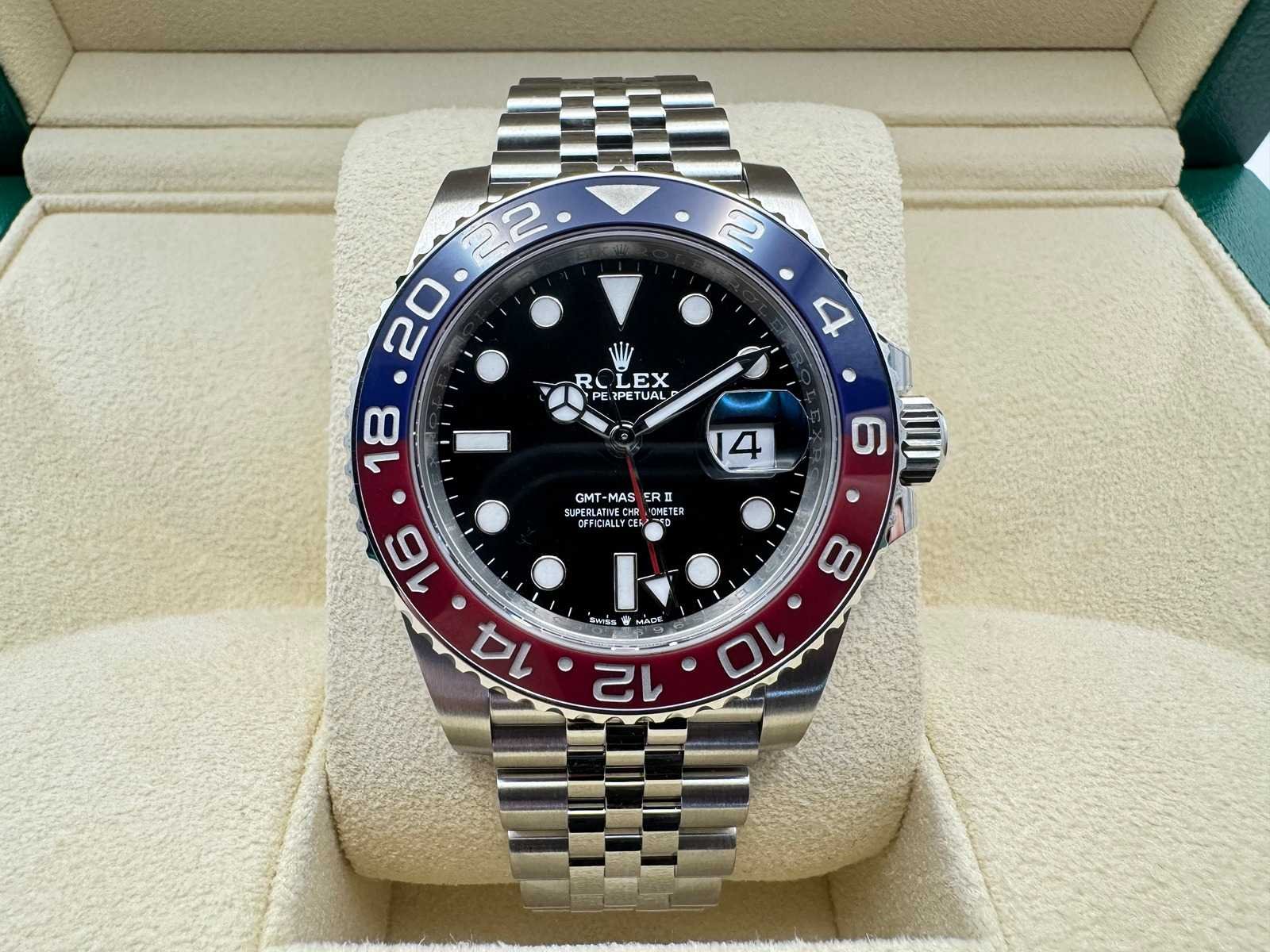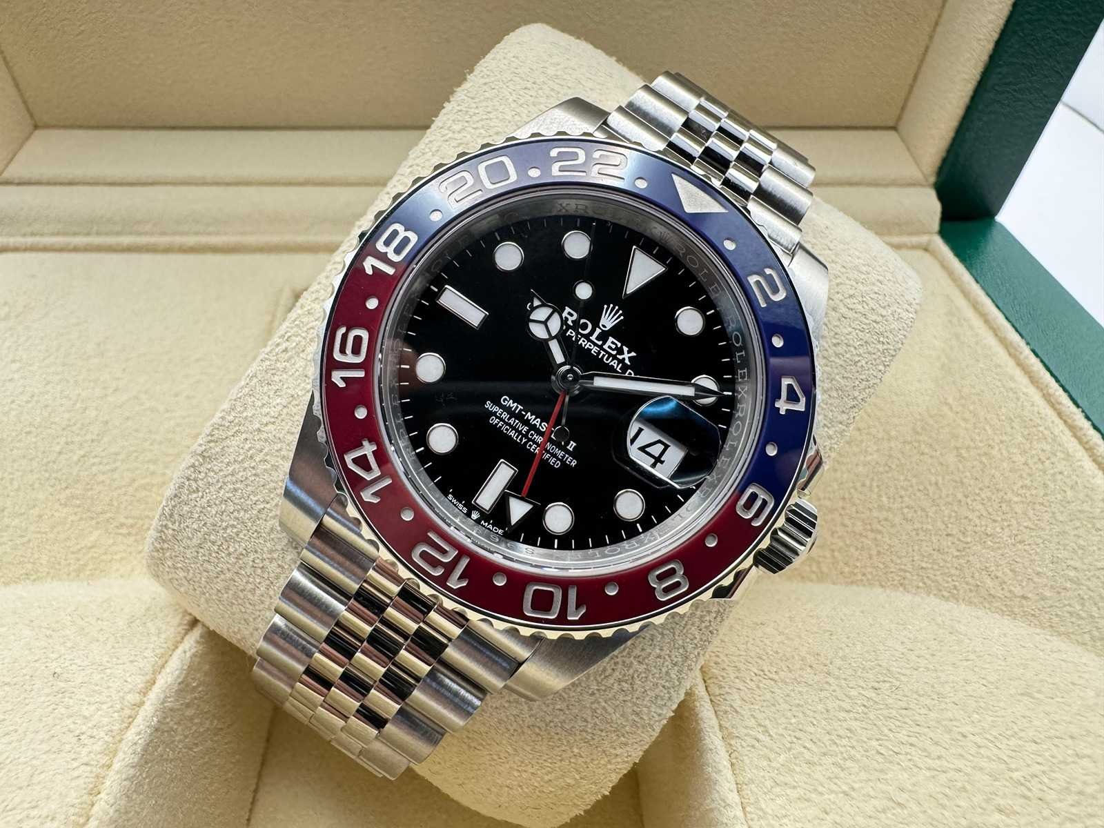 Rolex GMT-Master II 126720BLRO "Pepsi" Introducing the Rolex GMT-Master II 126720BLRO, a versatile timepiece from 2024 known for its timeless appeal and functional features. Key Features: Design and Materials: Case: 40mm Oystersteel case with a bidirectional rotatable bezel featuring a blue and red Cerachrom insert. Dial: Classic black dial with luminous hour markers and hands for optimal visibility. Crystal: Scratch-resistant sapphire crystal with Cyclops lens over the date. Movement: Caliber: Rolex Calibre 3285, a precise self-winding mechanical movement. Power Reserve: Approximately 70 hours. Bracelet: Material: Jubilee bracelet in Oystersteel with Oysterlock folding safety clasp. Additional Features: Water Resistance: Waterproof to 100 meters (330 feet), suitable for various water activities. Dual Time Zone Function: Features a GMT hand for tracking two time zones simultaneously. Warranty: International Rolex warranty until 2029, ensuring reliability and peace of mind. The Rolex GMT-Master II 126720BLRO combines classic design with practical functionality, making it an excellent choice for both travelers and watch Merk: Rolex Model: GMT-Master II Bouwjaar: 2025 Referentienummer: 126710BLRO Materiaal kast: Steel Materiaal horlogeband: Steel Jubilee Materiaal sluiting: Steel Wijzerplaat: Black Kastmaat: 40 mm