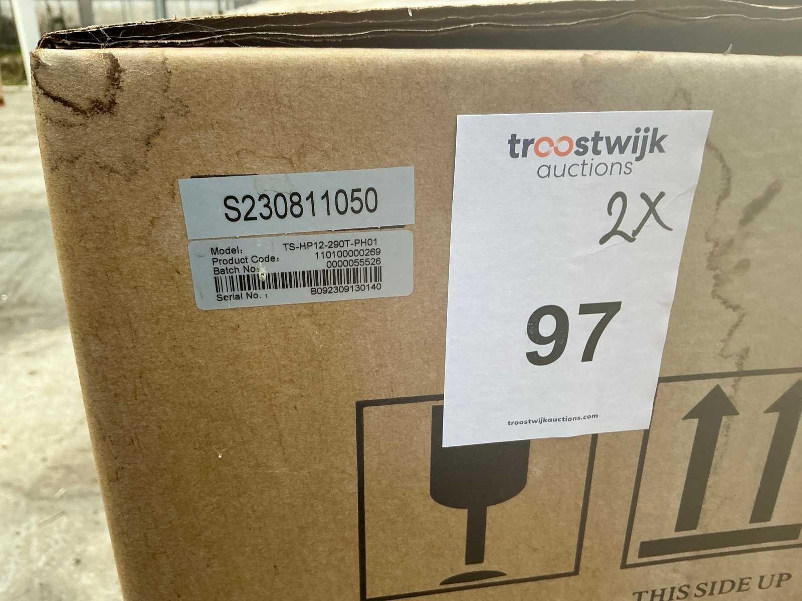Serienummers: B092309130140 en B092309130052. Dit betreft verpakte units. R290 refrigerant gas Energy Class: A++++ Heating + Cooling + Hot Water Full DC inverter compressor and fan motor Max outlet temperature: 70 O Wifi smart control Inverter water pump inside Modbus RS485 Full DC Inverter Technology Merk: Thuisstroom Model: TS-HP12-290T-PH01 Kleur: Zwart Gewicht: 175kg Lengte: 141cm Breedte: 52cm Hoogte: 96cm Materiaal: Metaal