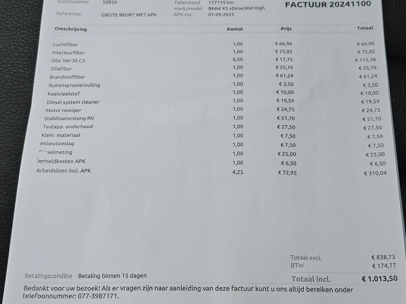 Let op! Voor Nederlandse kopers en kopers van buiten de EU komt de Rest-BPM bovenop het biedbedrag. De Rest-BPM bedraagt € 3304 en is niet inbegrepen in de totaalprijs bij het bieden. De totaalprijs is dus exclusief BPM. Deze regeling geldt uitsluitend voor kopers binnen Nederland en kopers buiten de EU. Voor kopers binnen de EU wordt een borg gevraagd die gelijk is aan de BPM. De Rest-BPM wordt na de correcte registratie van het voertuig in het vestigingsland binnen de EU per bank aan de koper teruggestort. Voor verdere informatie over BPM kunt u de veilinginformatie raadplegen, welke bovenaan de homepage van onze website te vinden is. Indien u vragen heeft over de BPM-regeling, kunt u contact opnemen met onze klantenservice en/of de belastingdienst. Kenteken: KG-554-B Merk: BMW Model: X5 Type: xDrive30d High Executive Bouwjaar: 2016 Afgelezen kilometerstand: 190579km Cilinderinhoud: 2993cc Vermogen (kW): 190kW Brandstof: Diesel Chassisnummer: WBAKS410000R80285 Laadvermogen: 0kg NAP status: Logisch Datum eerste toelating: 2016-09-07 Datum eerste toelating (NL): 2016-09-07 APK vervaldatum: 2026-09-07 Vermogen (pk): 259hp Aandrijving: Start en rijdt Aantal zitplaatsen: 5 Kleur: zwart Transmissie: Automaat Emissieklasse: 6 Aantal deuren: 4 Aantal sleutels: 1 Ledig gewicht: 2045kg Bruto BPM (NL): 16519€ Aantal cilinders: 6 Carrosserie: stationwagen Carfax Link: https://was.carfax.eu/v0/api/ccdid/5100016408/svc/201/vinreg/KG554B/checksum/eyJhbGciOiJIUzI1NiIsInR5cCI6IkpXVCJ9.eyJleHAiOjE3NjcwMjA4ODJ9.7nrAKk3e_BcHq9fX1qVE-kPJdTIM5JK5amr-ujjf9OM Start en rijdt: Start and drive startinformatie : Start en rijdt
