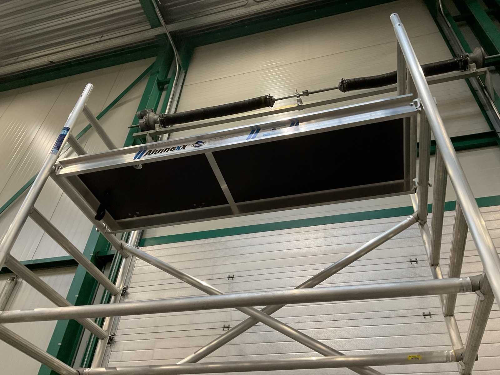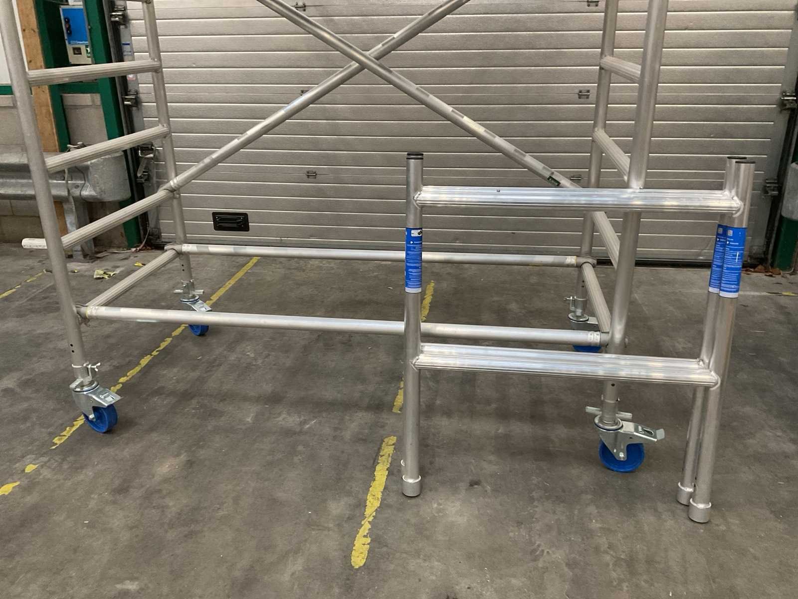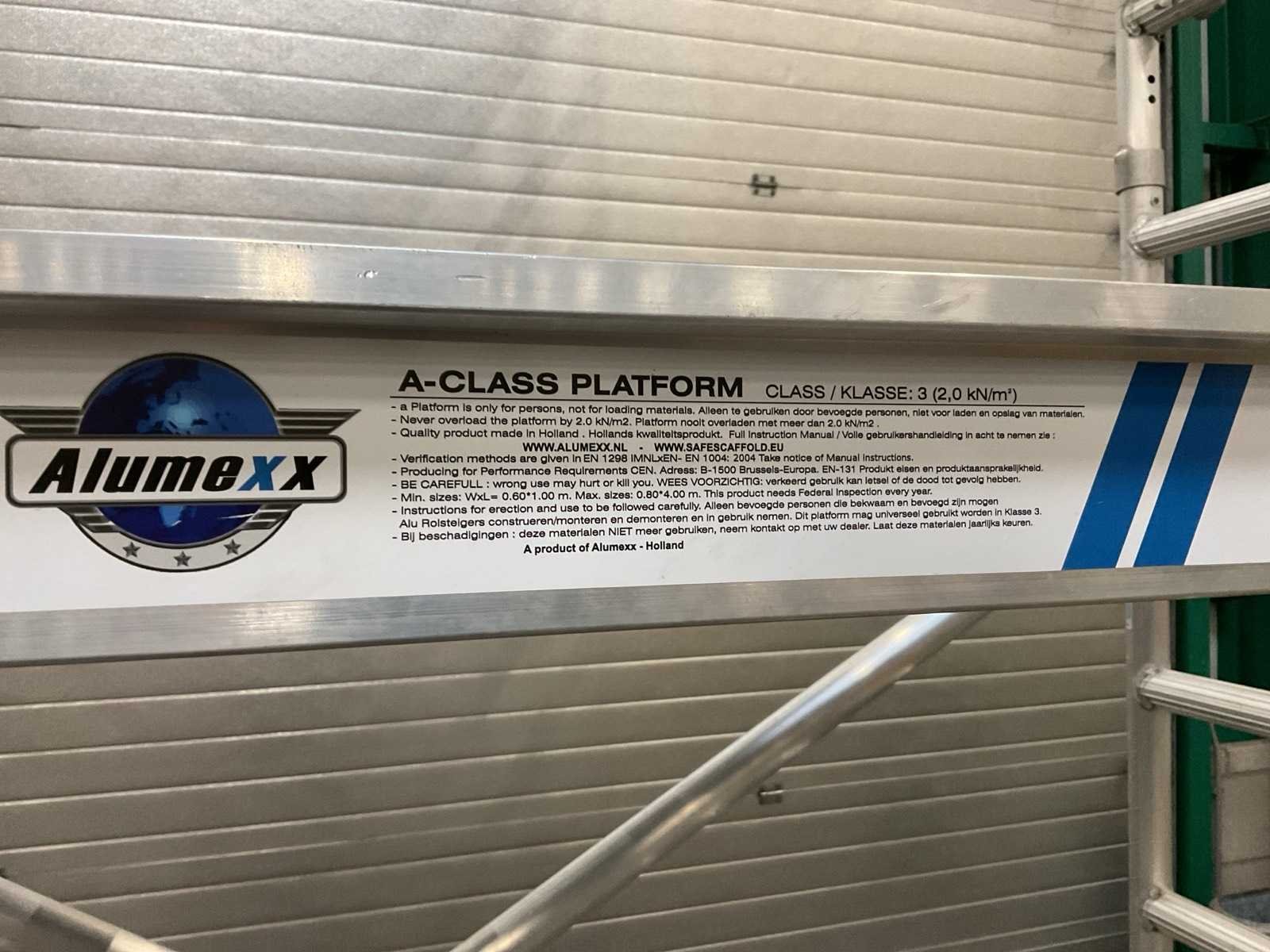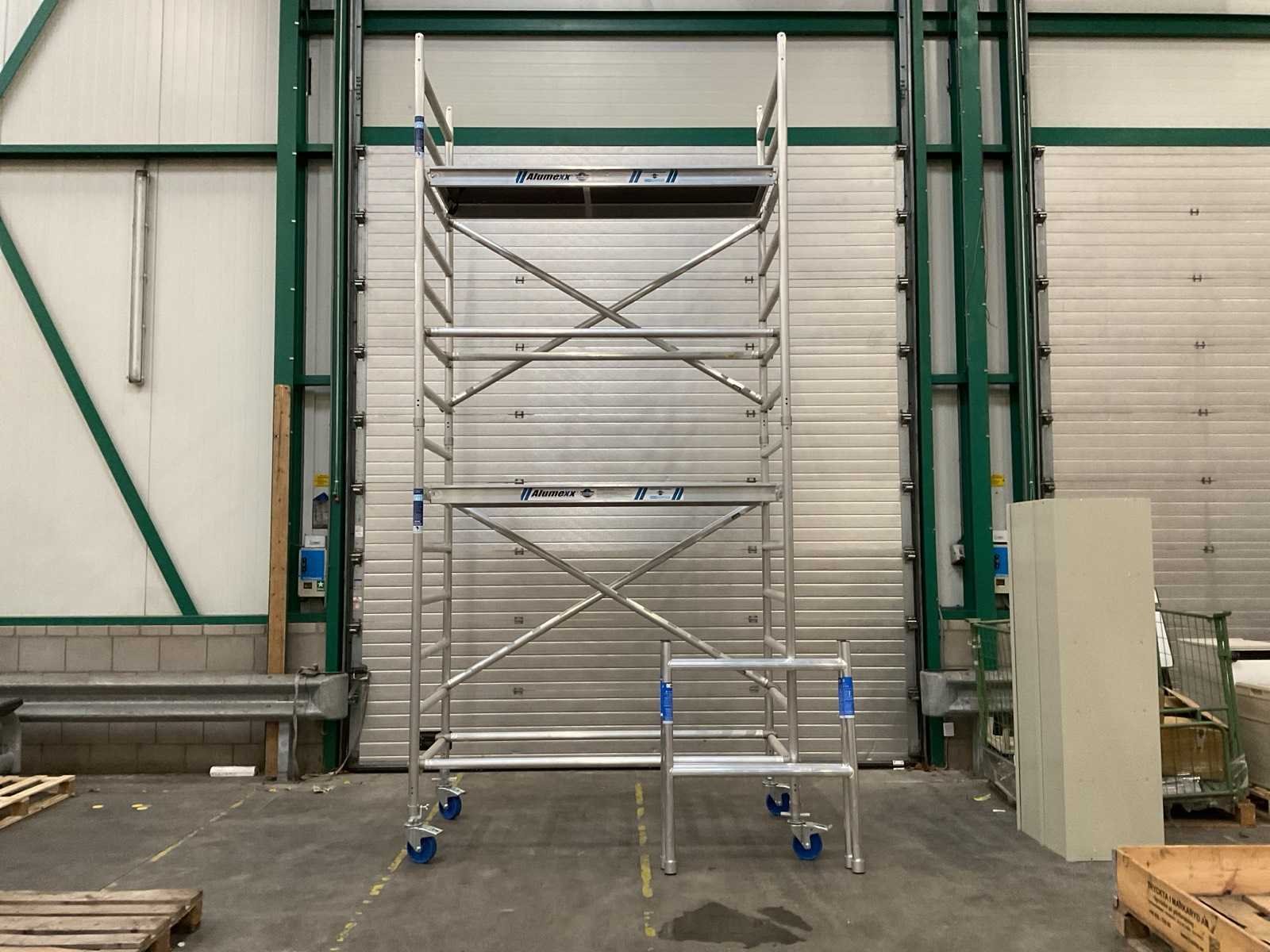 Bestaande uit: 4x opbouwframe, H195xB95cm, 2x opbouwframe, H109xB95cm, 4x geremd wiel op spindel, 2x loopplank (w.v. 1x met luik), L182xB60cm, 4x horizontaal schoor en 4x diagonaal schoor. Merk: Alumexx Aantal wielen: 4