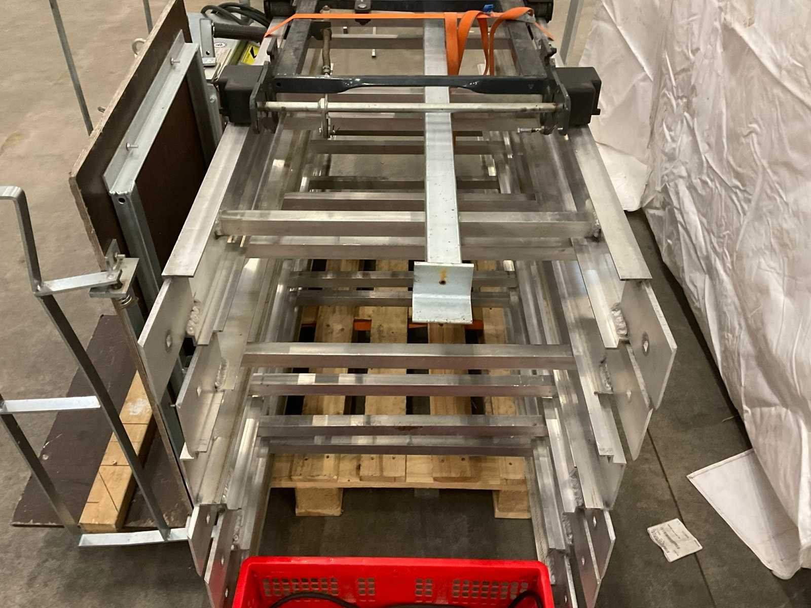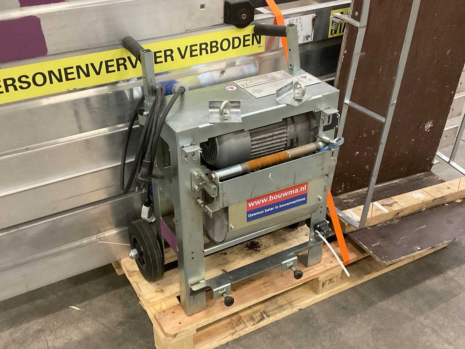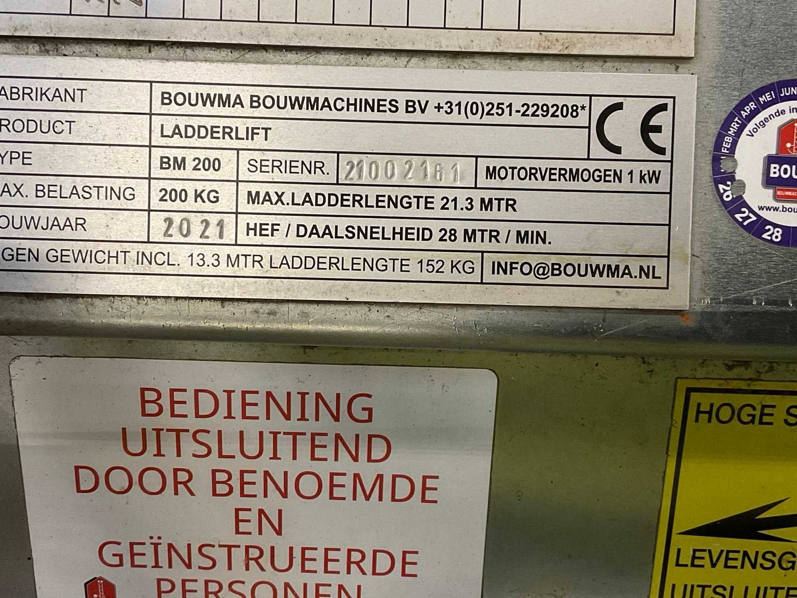 6 aluminium ladderelementen van 2 meter 1 aluminium ladderelement van 1 meter 1 topstuk met kabelschijf 0.3 meter 1 afneembare drukknopbediening en bovenafslag Ø 6 mm gegalvaniseerde hijskabel 1 universeel plateau met demontabele kanthekken 1 aluminium knikstuk, verstelbaar van 22-45°- lengte 1 meter 1 verstelbare middensteun 1 motorunit met een hefvermogen van 200 kg Merk: Bouwma Type: BM 200 Bouwjaar: 2021 Max. belasting: 200kg Hefhoogte: 13.3m
