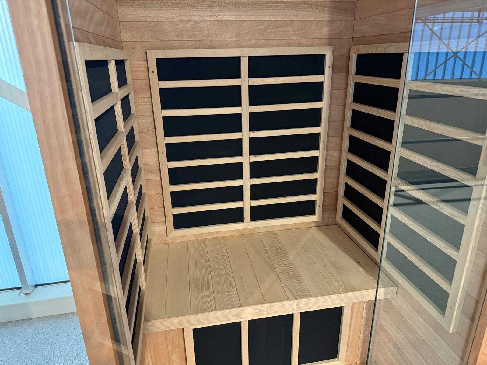 Ongebruikt in doos; Funda Mahogany – Infrarood sauna – 1-persoons; Luxe mahoniehouten sauna met korte-, midden- en langegolfstraling voor diepe warmte en ontspanning; Keramische stralers; Muziekinstallatie met twee speakers en Bluetooth; Totaal vermogen 1530W; Aansluiting 230V; Eigen gewicht 162 kg. Merk: Funda Model: Mahogany Gewicht: 162kg Lengte: 100cm Breedte: 90cm Hoogte: 190cm Materiaal: Mahonie hout