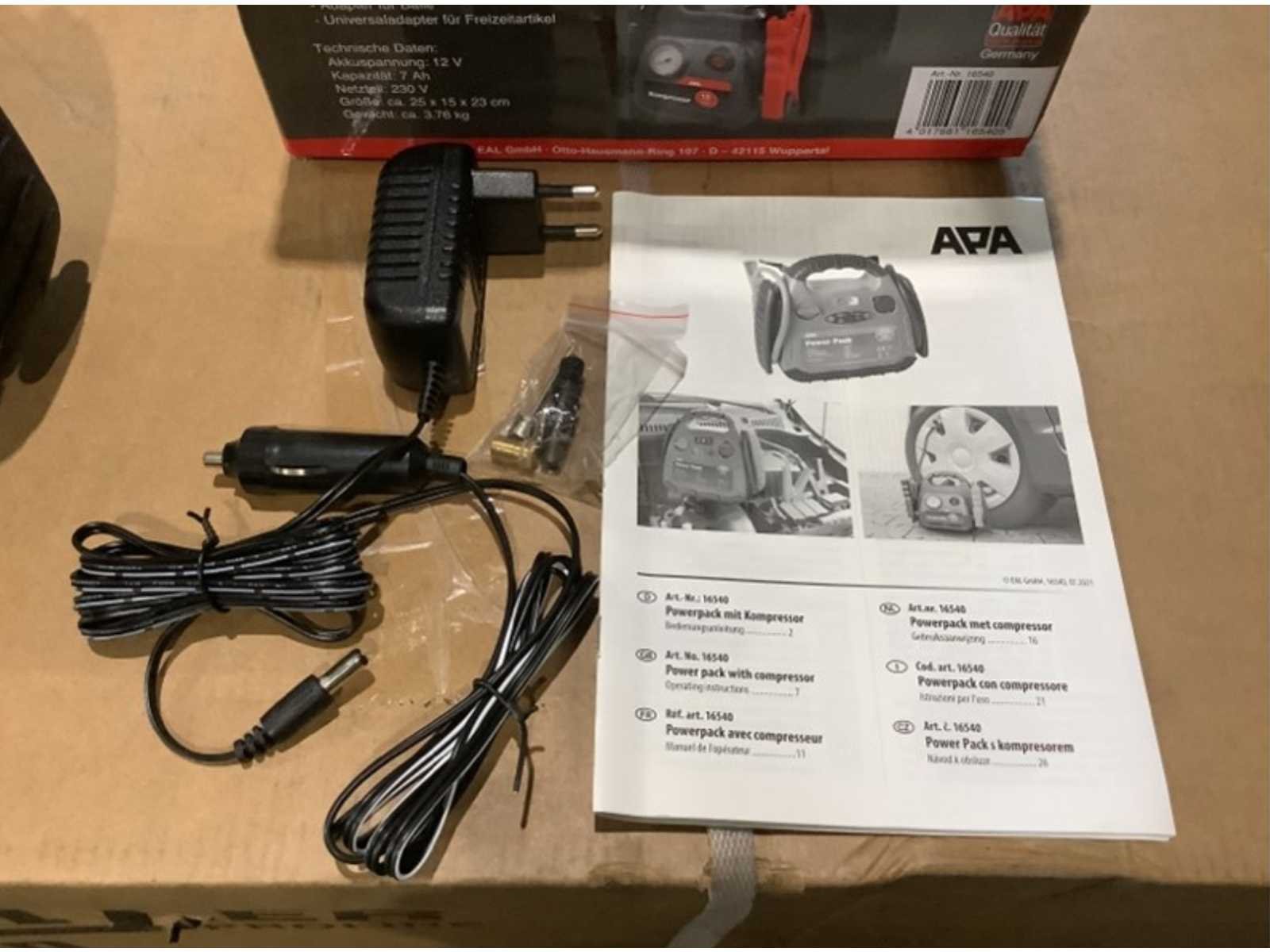 250/500A; voorzien van 230 Volt netadapter + 12 Volt lader; handleiding; ongebruikt in doos Merk: APA Type: Power Pack 250A Spanning: 12V Met starthulpfunctie: true Aansluiting: 230V