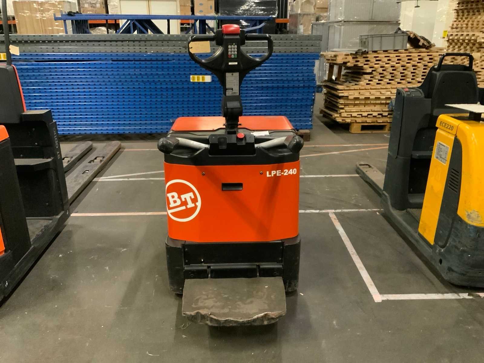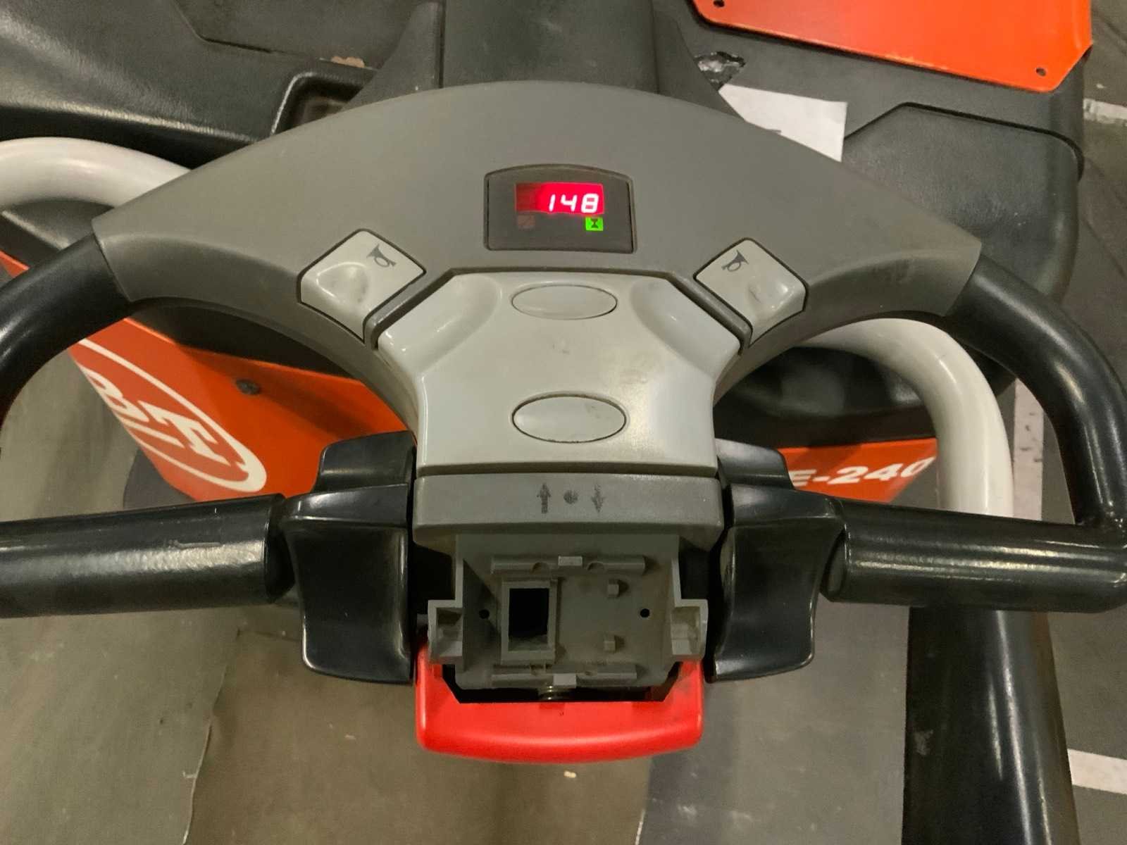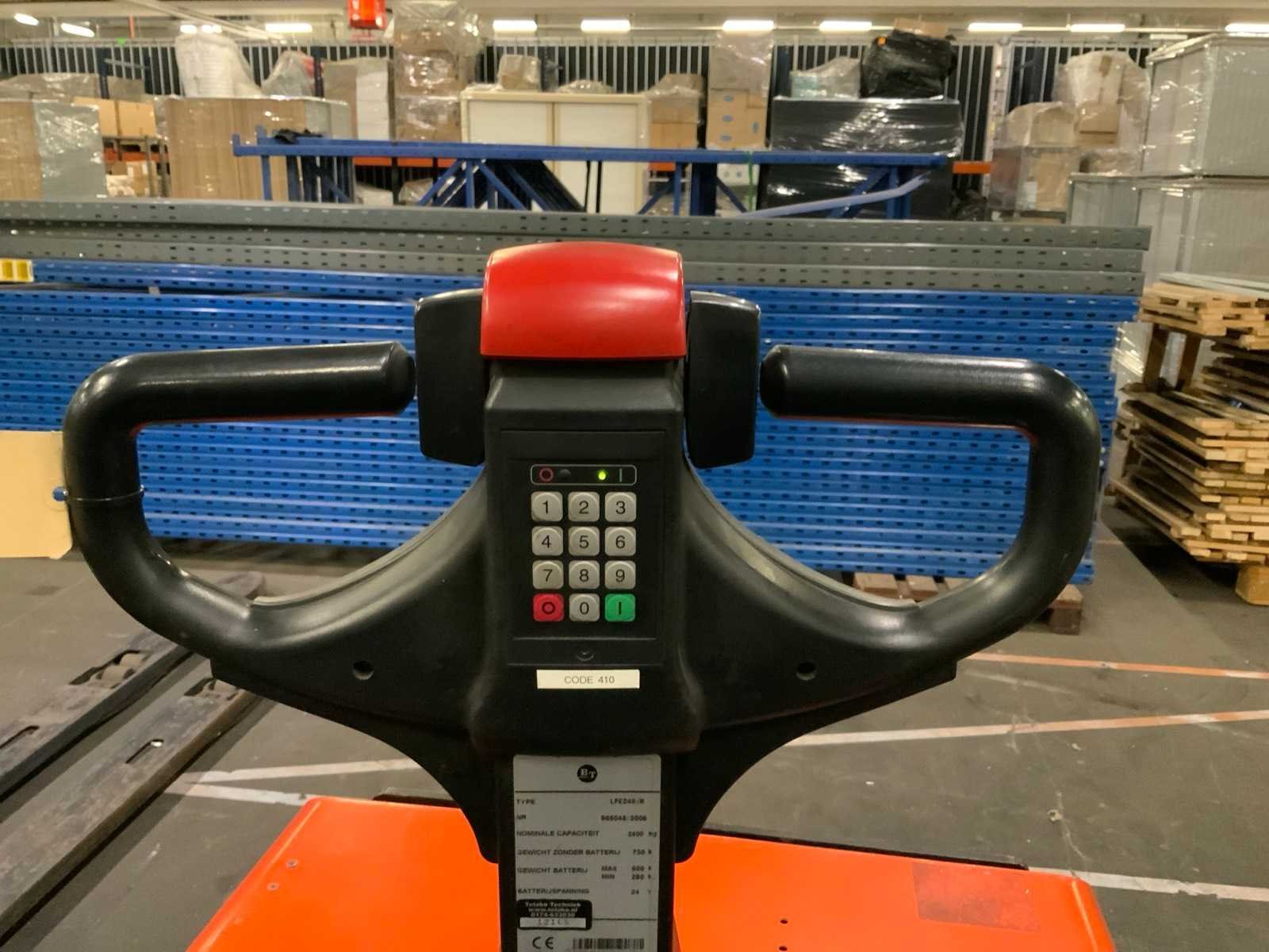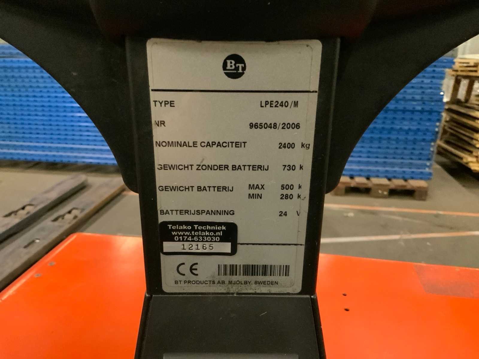 Merk: BT Type: LPE240 / M Bouwjaar: 2006 Serienummer: 965048 Hefvermogen: 2400kg Lepellengte: 1150mm Eigen gewicht: 1196kg Totale afmeting L: 2500mm Totale afmeting Breedte: 800mm Totale afmeting Hoogte: 1530mm