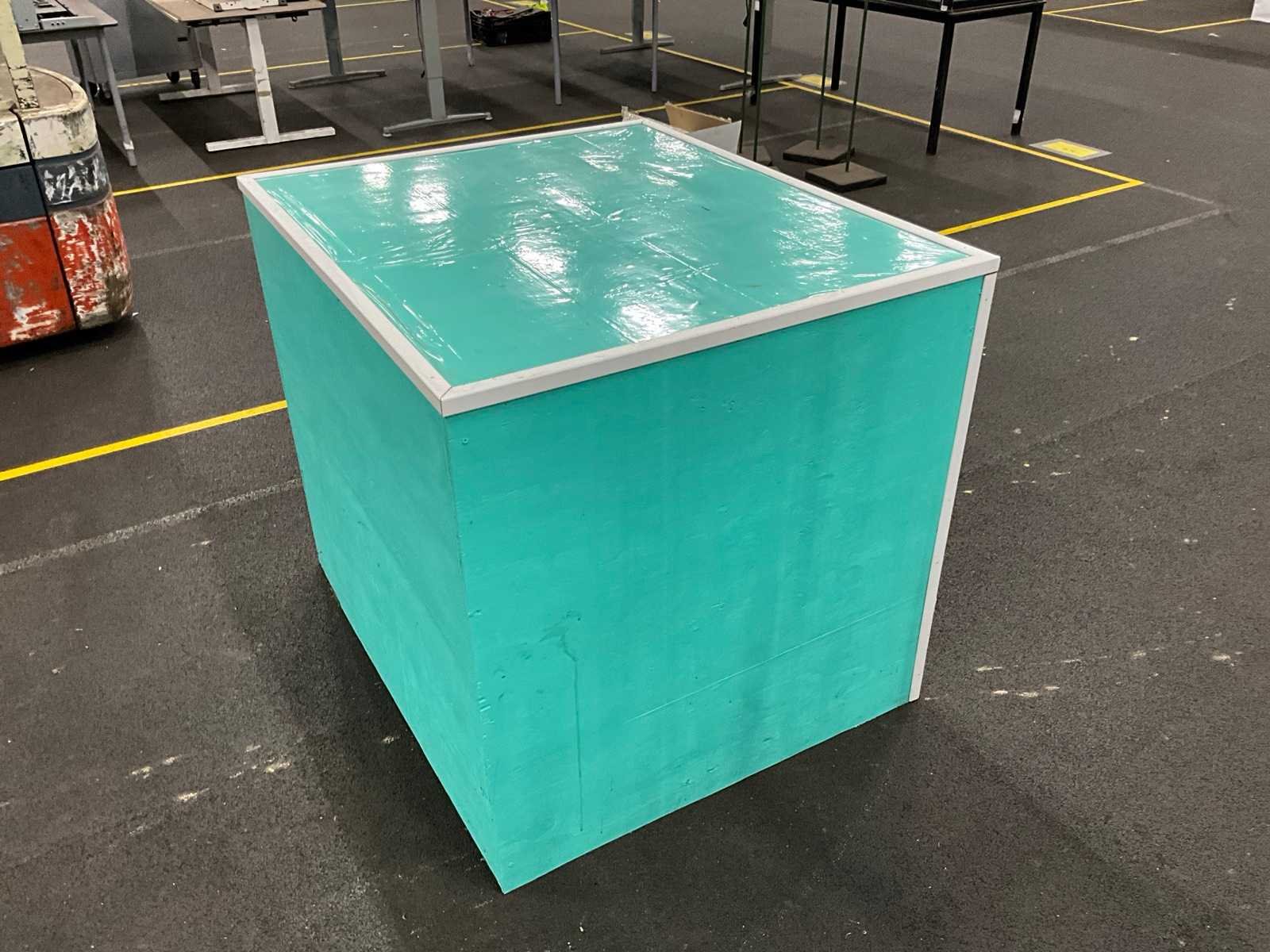 Let op, alleen de werkplekken: zonder schermen, printers, computers, scanners, kabels, toetsenborden; Kleur: Lichtblauw Lengte: 101cm Breedte: 118cm Hoogte: 101cm Materiaal: Hout