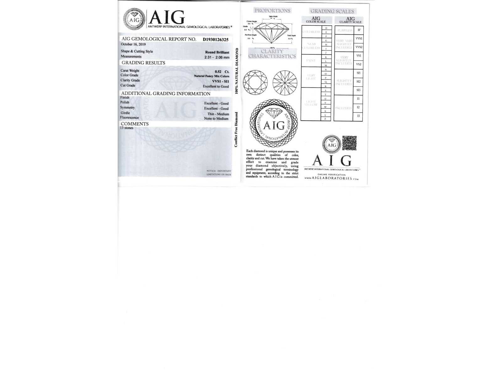 Samenvatting van gegevens Diamant - 0.52 carat briljant geslepen diamant (gecertificeerd) Diamant: Natuurlijk; Aantal: 13 stuks; Slijpvorm: Briljant geslepen; Gewicht (carat): 0.52 carat; Kleur: Natural fancy mix colours; Zuiverheid: VVS1-SI1; Certificaat: AIG; Certificaat nummer: D1930126325; Conditie: Nieuw; Verpakking: Edelsteendoos; Toelichting: De kwaliteit is overgenomen van het rapport behorend bij item. De waardebepaling is een beoordeling van een gecertificeerde diamantair, gebaseerd op consumentenprijzen.; Consumentenprijs: € 2.640,- Within 14 days Voornaamste diamant: Natuurlijk Kleur diamant: Natural fancy mix colours Gewicht diamant: 0.52ct Slijpvorm diamant: Briljant geslepen Zuiverheidsgraad diamant: VVS1-SI1 Certificaat: AIG