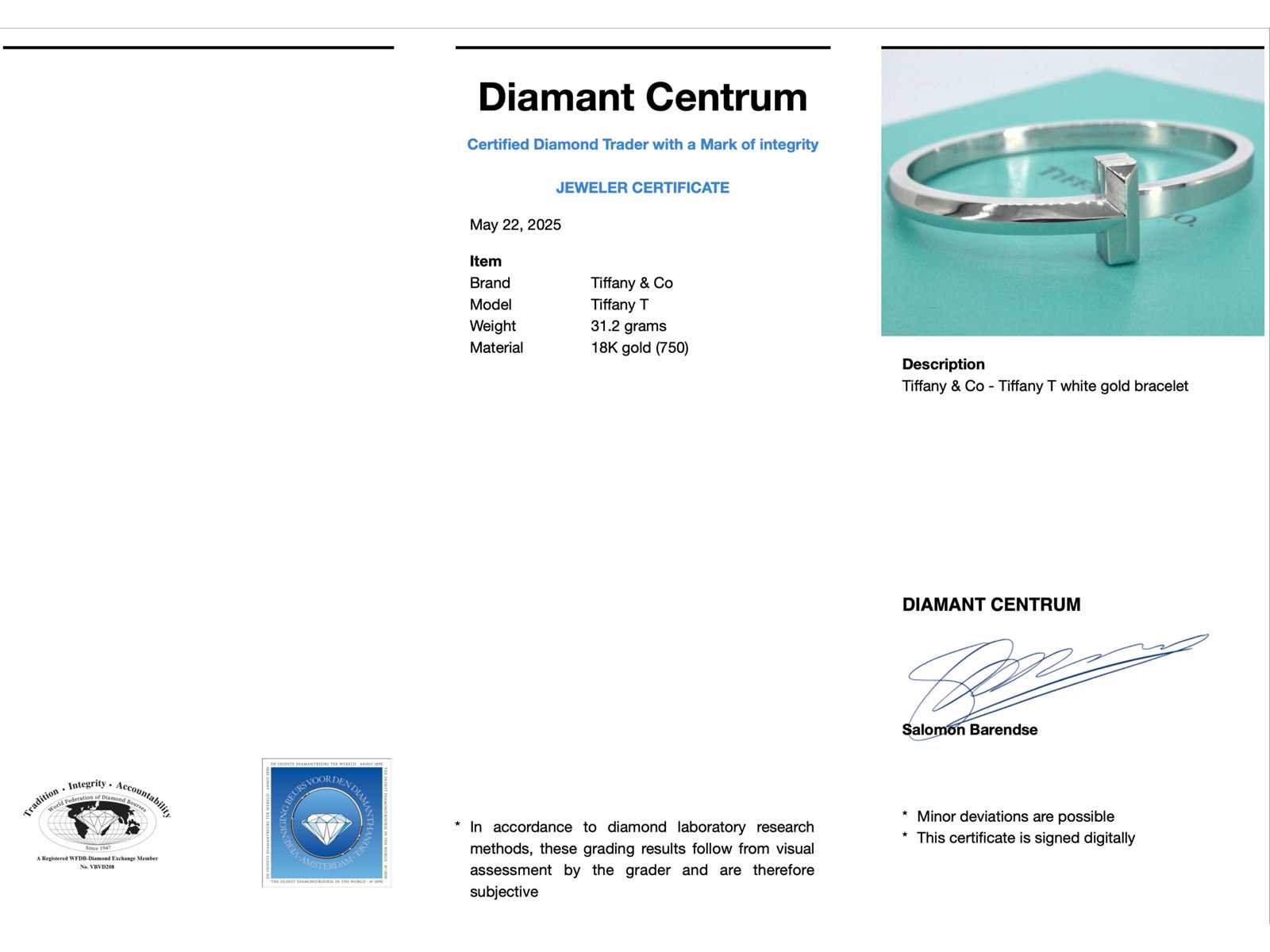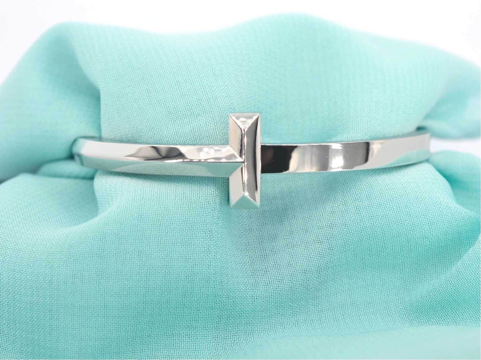 Samenvatting van gegevens Tiffany & Co - Tiffany T witgouden armband Juweel: Armband; Merk: Tiffany & Co; Model: Tiffany T; Gewicht: 31.2 gram; Materiaal: 18K goud (750); Conditie: Zo goed als nieuw; Verpakking: Originele sieradendoos; Toelichting: De kwaliteit is overgenomen van het rapport behorend bij item. De waardebepaling is een beoordeling van een gecertificeerde diamantair, gebaseerd op consumentenprijzen.; Extra informatie: Komt met originele doos en papieren.; Consumentenprijs: € 8.700,- Within 14 days Materiaal: Goud Totaal gewicht: 31.2g Keurmerk: 750