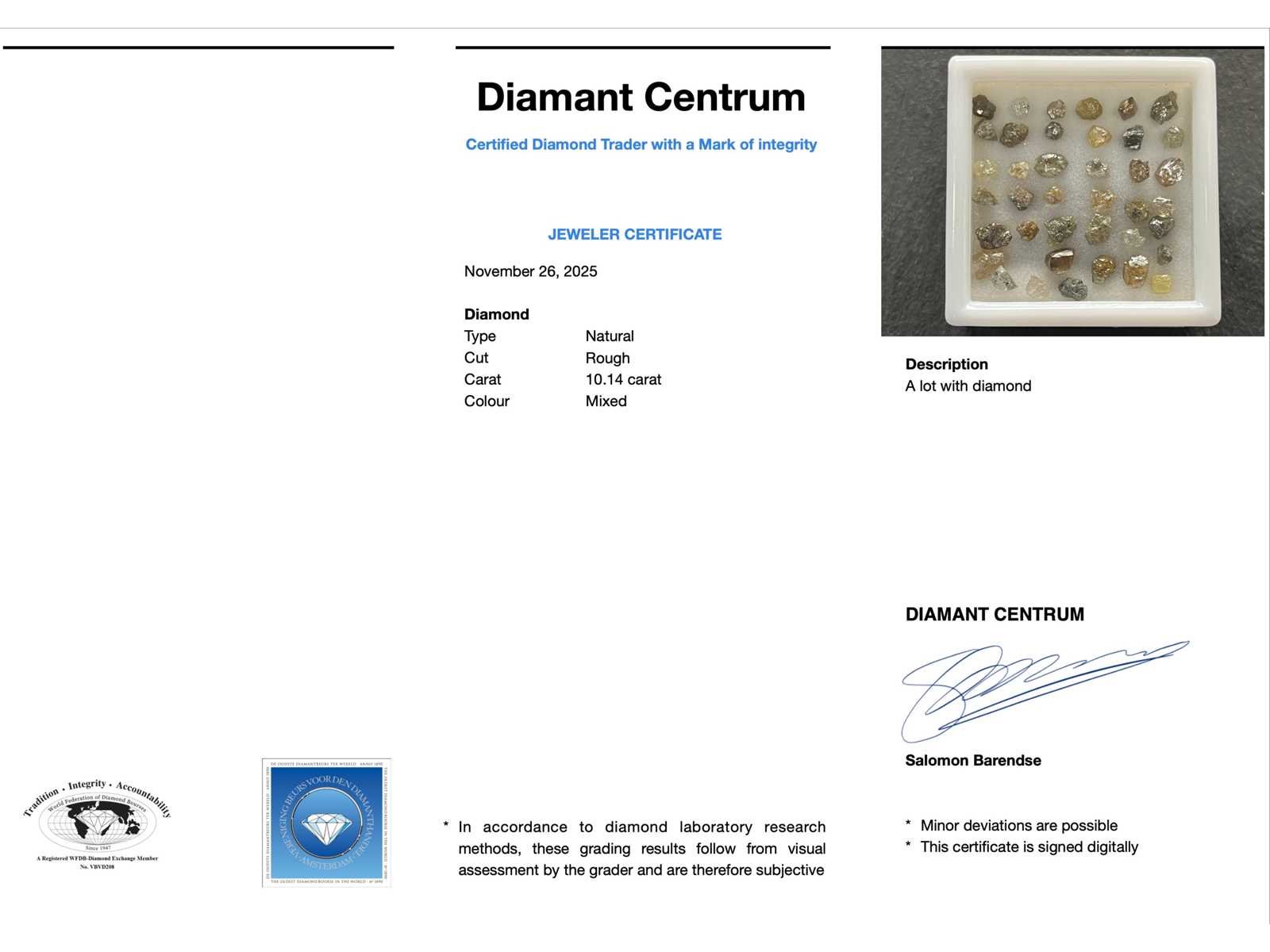 Samenvatting van gegevens Diamant - 10.14 carat ruwe diamant van top kwaliteit Diamant: Natuurlijk; Aantal: 38 stuks; Slijpvorm: Ruw; Gewicht (carat): 10.14 carat; Kleur: Mixed; Conditie: Nieuw; Verpakking: Edelsteendoos; Toelichting: De kwaliteit is overgenomen van het rapport behorend bij item. De waardebepaling is een beoordeling van een gecertificeerde diamantair, gebaseerd op consumentenprijzen.; Consumentenprijs: € 4.460,- Within 14 days Voornaamste diamant: Natuurlijk Kleur diamant: Mixed Gewicht diamant: 10.14ct Slijpvorm diamant: Ruw
