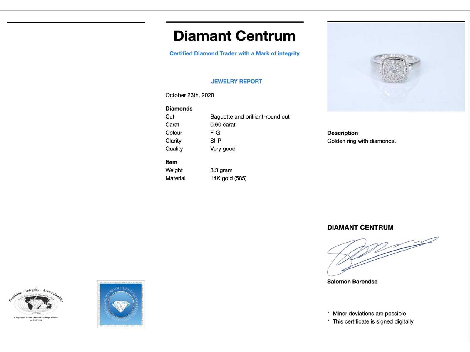Samenvatting van gegevens Witgouden entourage ring met diamanten Diamant: Natuurlijk; Slijpvorm: Briljant, baguette en rond geslepen; Gewicht (carat): 0.60 carat; Kleur: F-G; Zuiverheid: SI-P; Slijpkwaliteit: Zeer mooi; Juweel: Ring; Gewicht: 3.3 gram; Ringmaat (op maat gemaakt*): 54 (17.25 mm); Materiaal: 14 karaat (585); Conditie: Nieuw; Verpakking: Luxe sieradendoos; Toelichting: De kwaliteit is overgenomen van het rapport behorend bij item. De waardebepaling is een beoordeling van een gecertificeerde diamantair, gebaseerd op consumentenprijzen.; Consumentenprijs: € 2.695,- Within 14 days Voornaamste diamant: Natuurlijk Gewicht diamant: 0.60ct Totaal gewicht: 3.3g Keurmerk: 585 Kleur diamant: F-G Slijpvorm diamant: Briljant, baguette en rond geslepen Slijpkwaliteit diamant: Zeer mooi Zuiverheidsgraad diamant: SI-P