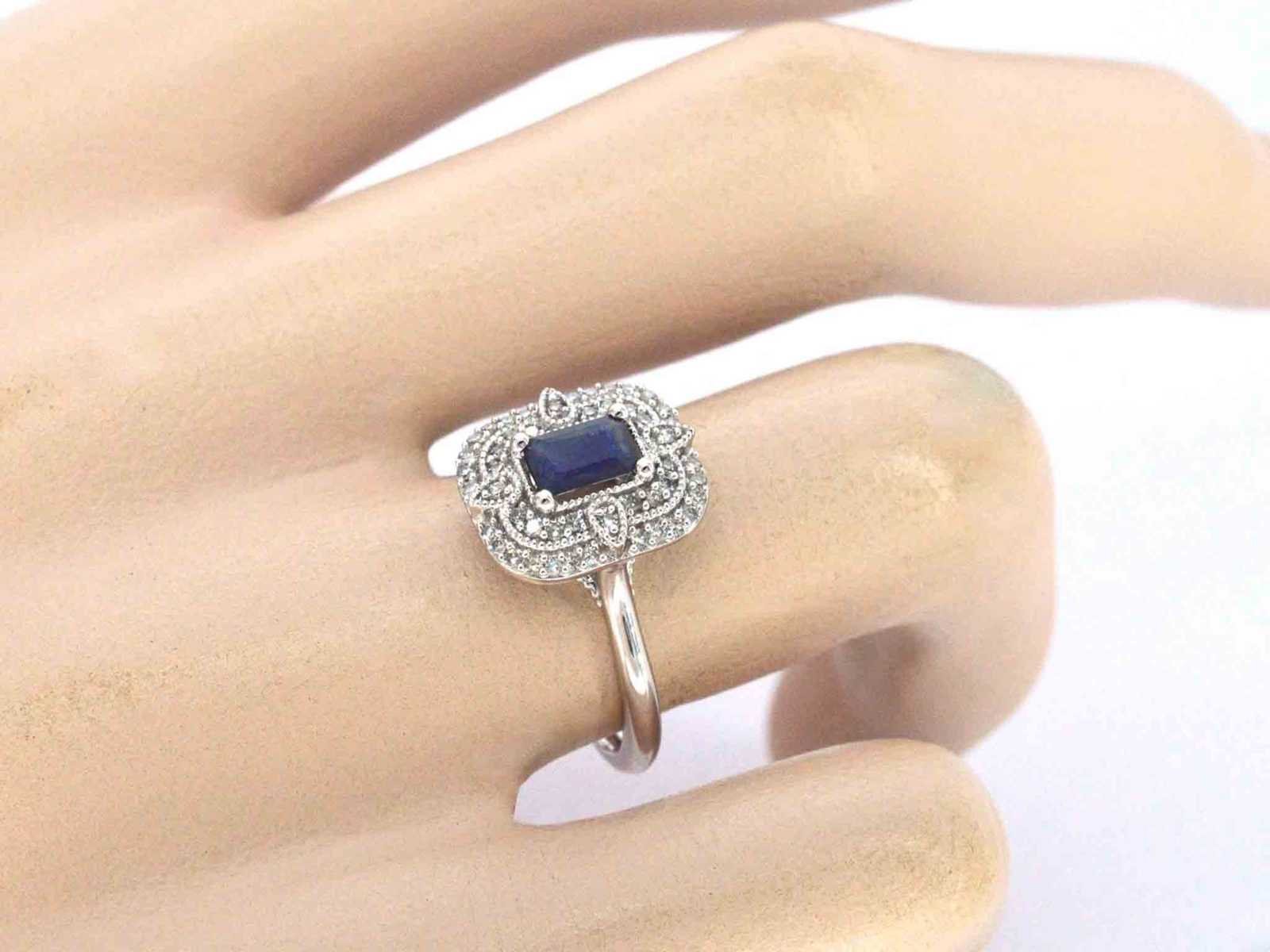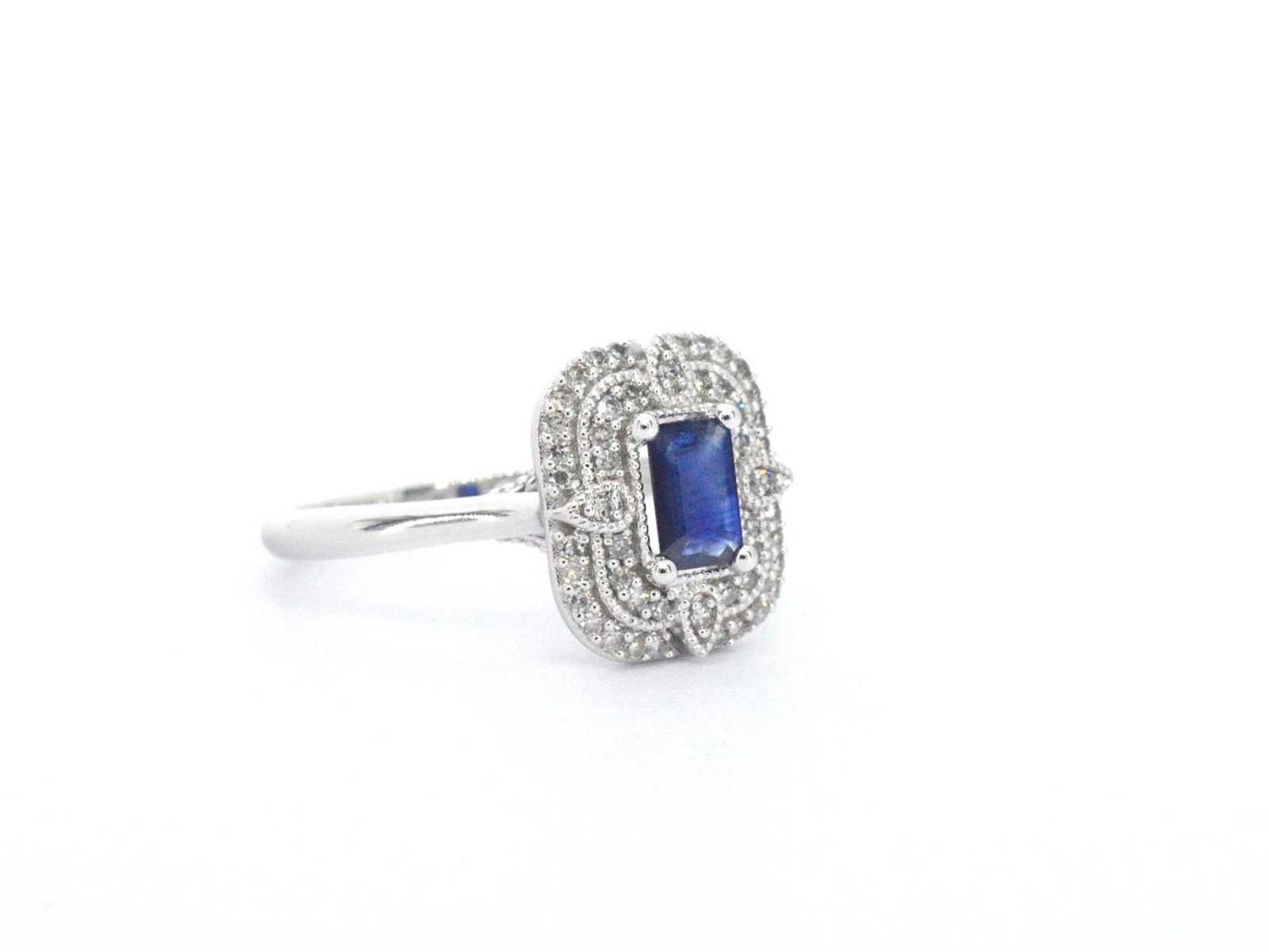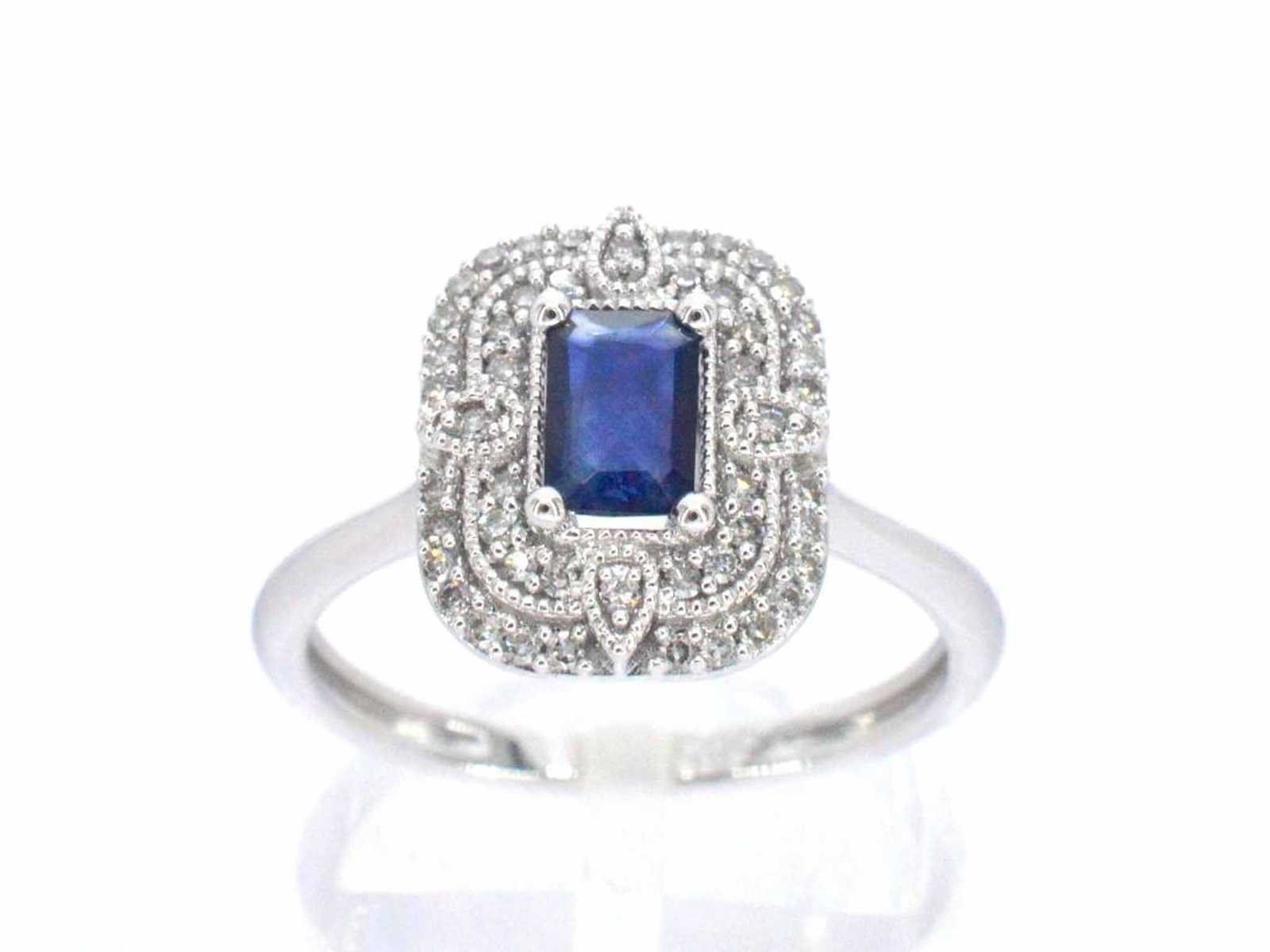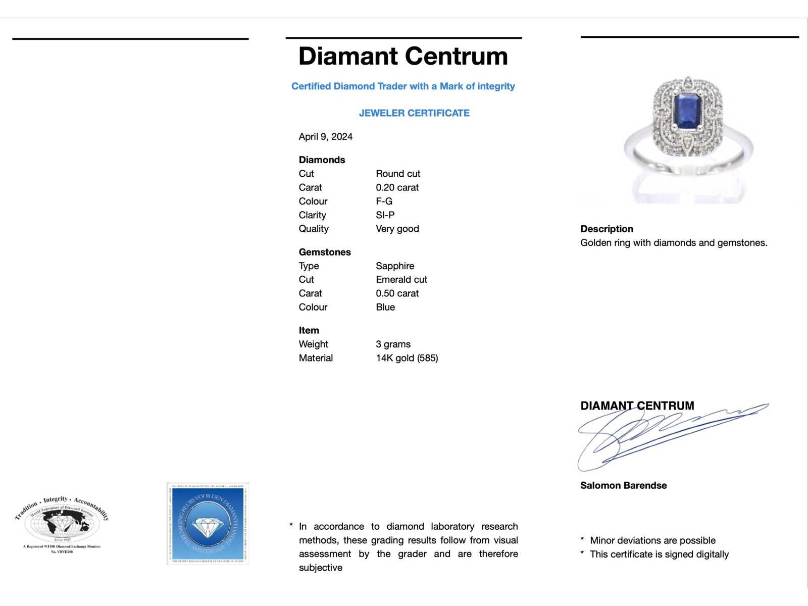 Samenvatting van gegevens Witgouden design ring met een saffier en diamanten Diamant: Natuurlijk; Slijpvorm: Rond geslepen; Gewicht (carat): 0.20 carat; Kleur: F-G; Zuiverheid: SI-P; Slijpkwaliteit: Zeer mooi; Edelsteen: Saffier; Slijpvorm: Emerald geslepen; Gewicht (carat): 0.50 carat; Kleur: Blauw; Juweel: Ring; Gewicht: 3 gram; Ringmaat (op maat gemaakt*): 54 (17.25 mm); Materiaal: 14 karaat (585); Conditie: Nieuw; Verpakking: Luxe sieradendoos; Toelichting: De kwaliteit is overgenomen van het rapport behorend bij item. De waardebepaling is een beoordeling van een gecertificeerde diamantair, gebaseerd op consumentenprijzen.; Consumentenprijs: € 2.083,- Within 14 days Voornaamste diamant: Natuurlijk Gewicht diamant: 0.20ct Edelsteen: Saffier Totaal gewicht: 3g Keurmerk: 585 Kleur diamant: F-G Slijpvorm diamant: Rond geslepen Slijpkwaliteit diamant: Zeer mooi Zuiverheidsgraad diamant: SI-P Kleur edelsteen: Blauw Slijpvorm edelsteen: Emerald geslepen