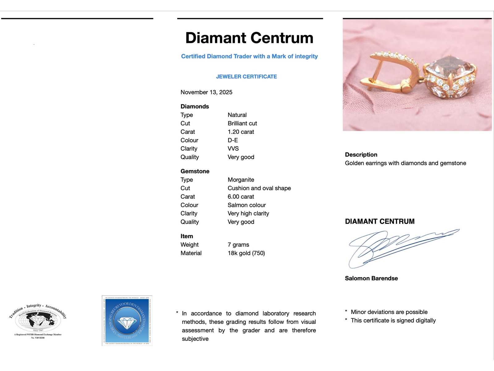 Samenvatting van gegevens House of Pertijs - rosegouden oorbellen met diamant en edelsteen Diamant: Natuurlijk; Aantal: ca. 60 stuks; Slijpvorm: Briljant geslepen; Gewicht (carat): 1.20 carat; Kleur: D-E; Zuiverheid: VVS; Slijpkwaliteit: Excellent; Edelsteen: Morganiet; Aantal: 10 stuks; Slijpvorm: kussen en ovaal vorm; Gewicht (carat): 6.00 carat totaal; Kleur: Zalm kleur; Zuiverheid: Zeer hoge zuiverheidsgraad; Slijpkwaliteit: Heel mooi; Juweel: Oorbellen; Gewicht: 7 gram; Materiaal: 18K goud (750); Conditie: Zo goed als nieuw; Verpakking: Luxe sieradendoos; Toelichting: De kwaliteit is overgenomen van het rapport behorend bij item. De waardebepaling is een beoordeling van een gecertificeerde diamantair, gebaseerd op consumentenprijzen.; Consumentenprijs: € 12.000,- Within 14 days Materiaal: Goud Voornaamste diamant: Natuurlijk Kleur diamant: D-E Gewicht diamant: 1.20ct Slijpvorm diamant: Briljant geslepen Slijpkwaliteit diamant: Excellent Zuiverheidsgraad diamant: VVS Edelsteen: Morganiet Kleur edelsteen: Zalm kleur Slijpvorm edelsteen: kussen en ovaal vorm Slijpkwaliteit edelsteen: Heel mooi Zuiverheidsgraad edelsteen: Zeer hoge zuiverheidsgraad Totaal gewicht: 7g Keurmerk: 750