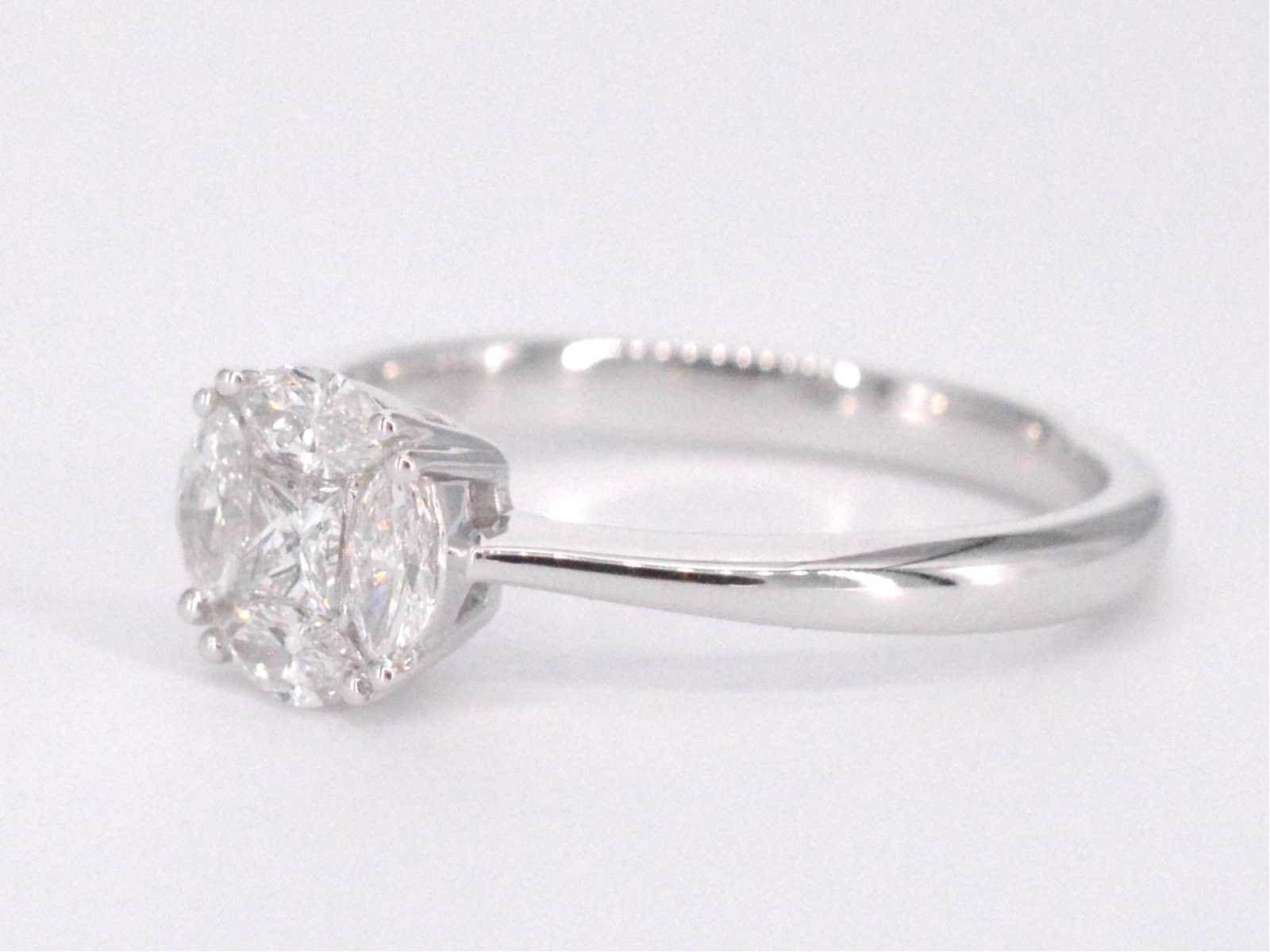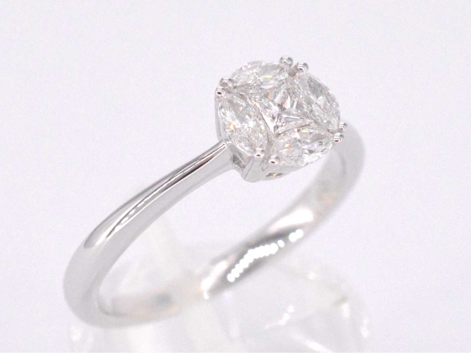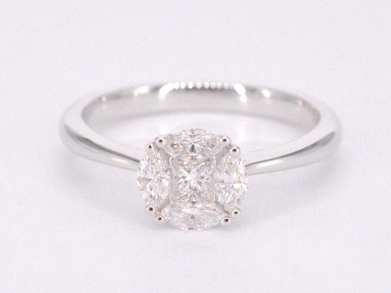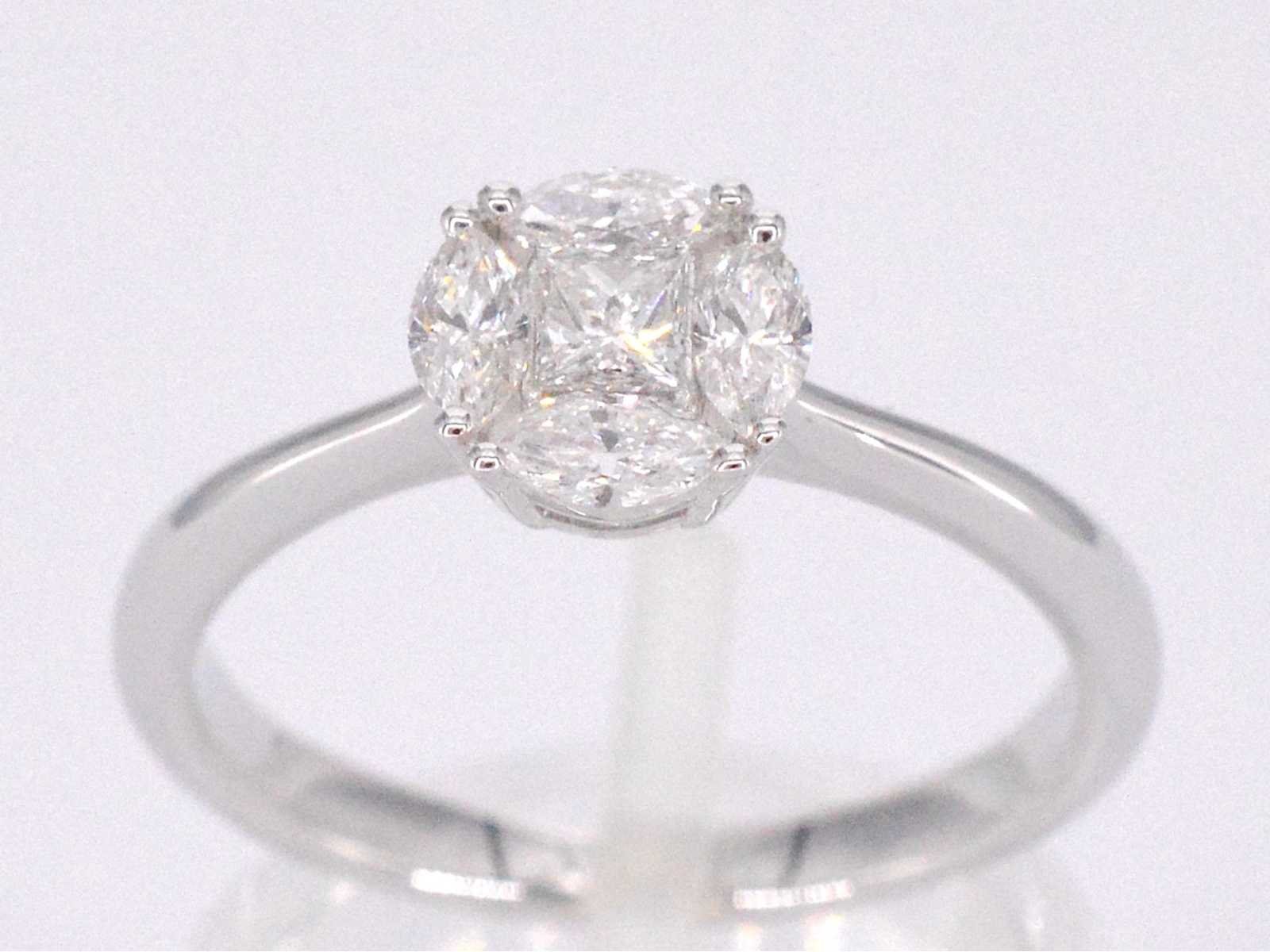 Samenvatting van gegevens Witgouden ring met prinses en marquise geslepen natuurlijke diamanten Diamant: Natuurlijk; Slijpvorm: Prinses en marquise geslepen; Gewicht (carat): 0.60 carat; Kleur: F-G; Zuiverheid: VS; Slijpkwaliteit: Zeer mooi; Juweel: Ring; Gewicht: 3 gram; Ringmaat (op maat gemaakt*): 53 (17 mm); Materiaal: 18K goud (750); Conditie: Nieuw; Verpakking: Luxe sieradendoos; Toelichting: De kwaliteit is overgenomen van het rapport behorend bij item. De waardebepaling is een beoordeling van een gecertificeerde diamantair, gebaseerd op consumentenprijzen.; Consumentenprijs: € 6.300,- Within 14 days Materiaal: Goud Voornaamste diamant: Natuurlijk Gewicht diamant: 0.60ct Totaal gewicht: 3g Keurmerk: 750 Kleur diamant: F-G Slijpvorm diamant: Prinses en marquise geslepen Slijpkwaliteit diamant: Zeer mooi Zuiverheidsgraad diamant: VS