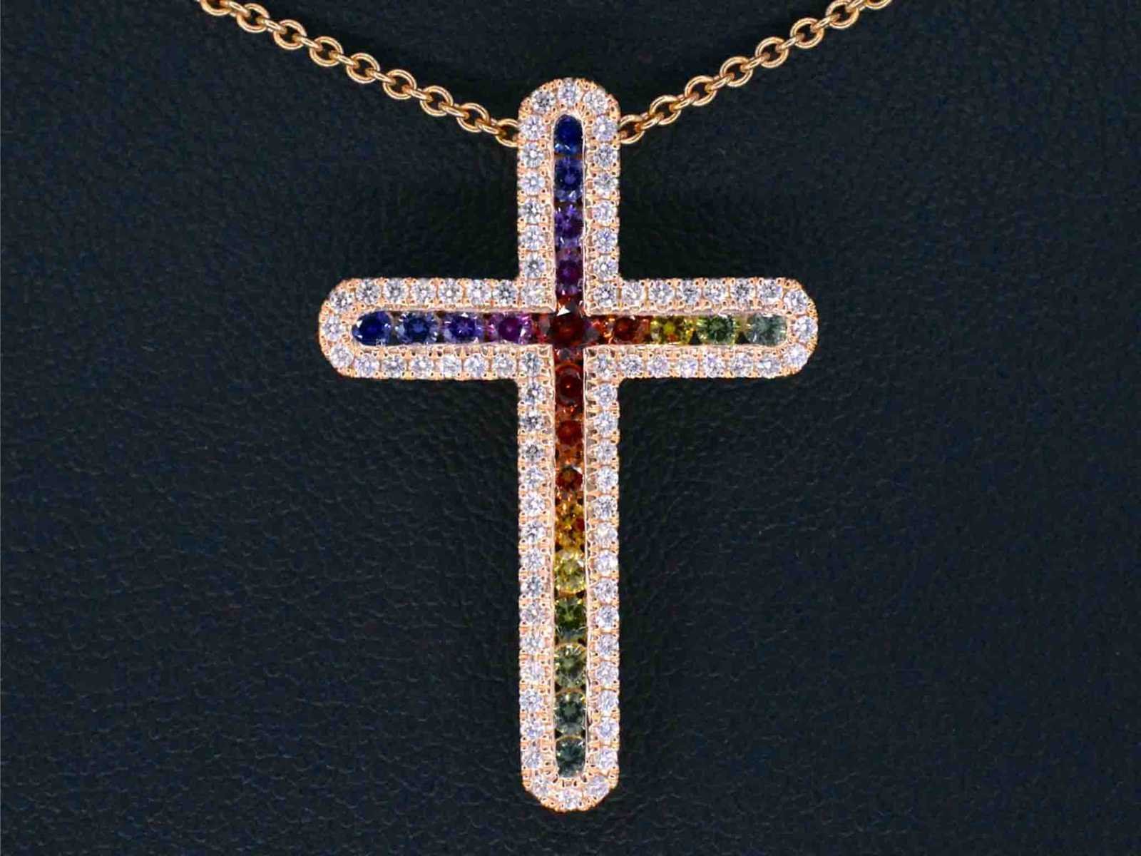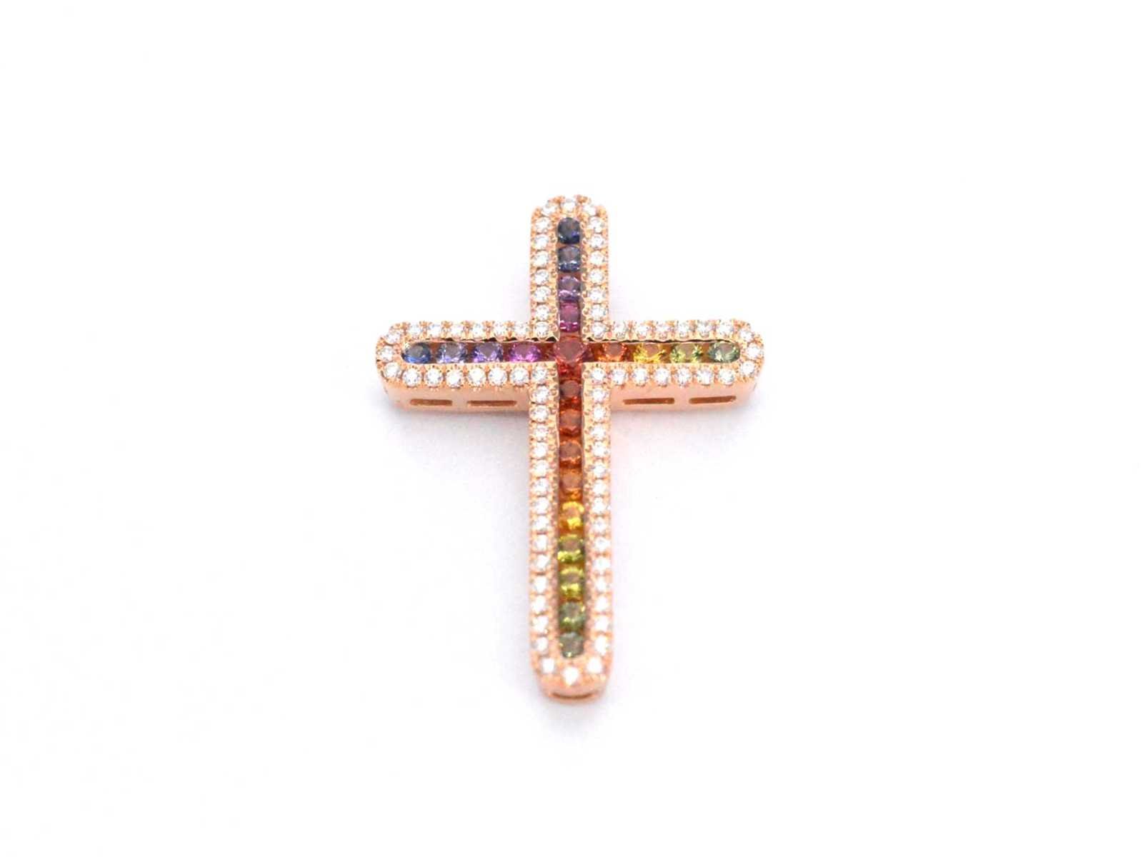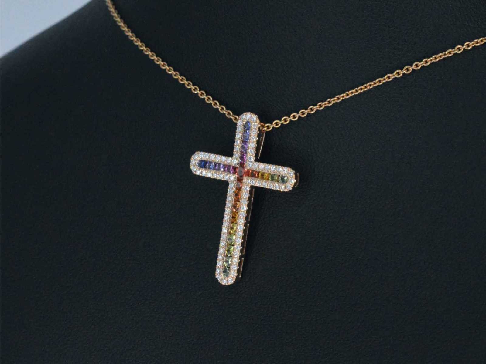 Samenvatting van gegevens Gouden kruishanger met diamanten en edelstenen Diamant: Natuurlijk; Aantal: 80 stuks; Slijpvorm: Briljant geslepen; Gewicht (carat): 0.40 carat; Kleur: F-G; Zuiverheid: VS; Slijpkwaliteit: Zeer mooi; Edelsteen: Saffieren; Aantal: 22 stuks; Slijpvorm: Briljant geslepen; Gewicht (carat): 0.75 carat; Kleur: Multicolour; Slijpkwaliteit: Very good; Juweel: Hanger (excl. ketting); Gewicht: 3.8 gram; Afmetingen/lengte: 28 mm; Materiaal: 18K goud (750); Conditie: Nieuw; Verpakking: Luxe sieradendoos; Toelichting: De kwaliteit is overgenomen van het rapport behorend bij item. De waardebepaling is een beoordeling van een gecertificeerde diamantair, gebaseerd op consumentenprijzen.; Consumentenprijs: € 5.460,- Within 14 days Materiaal: Goud Voornaamste diamant: Natuurlijk Kleur diamant: F-G Gewicht diamant: 0.40ct Slijpvorm diamant: Briljant geslepen Slijpkwaliteit diamant: Zeer mooi Zuiverheidsgraad diamant: VS Edelsteen: Saffieren Kleur edelsteen: Multicolour Slijpvorm edelsteen: Briljant geslepen Slijpkwaliteit edelsteen: Very good Totaal gewicht: 3.8g Keurmerk: 750