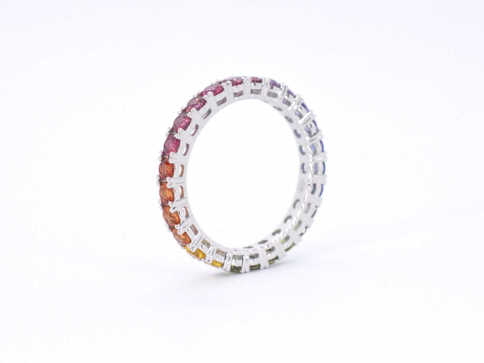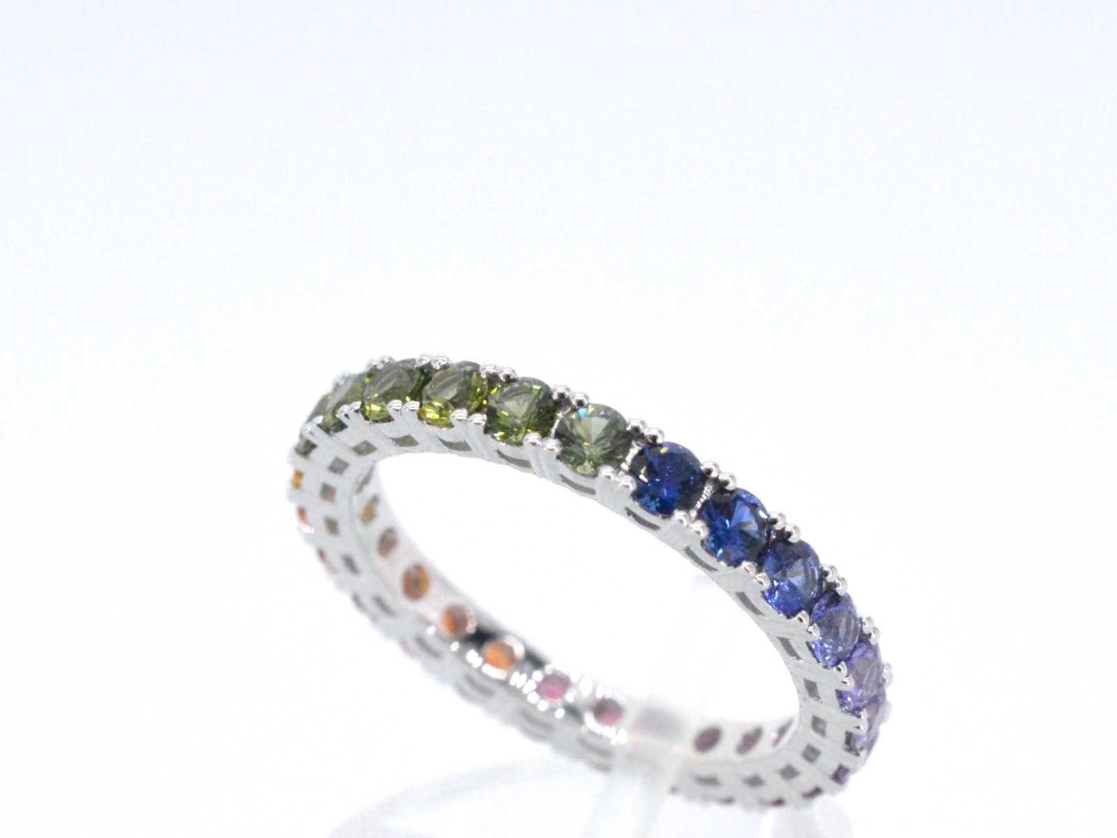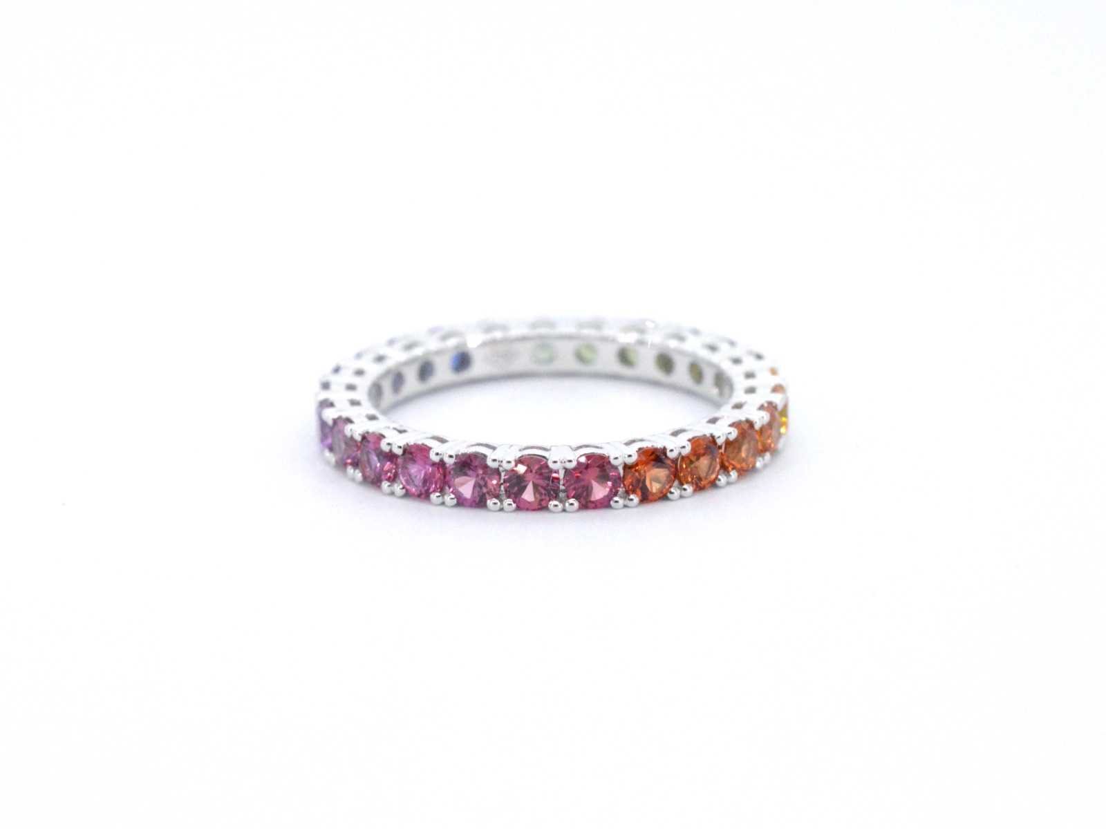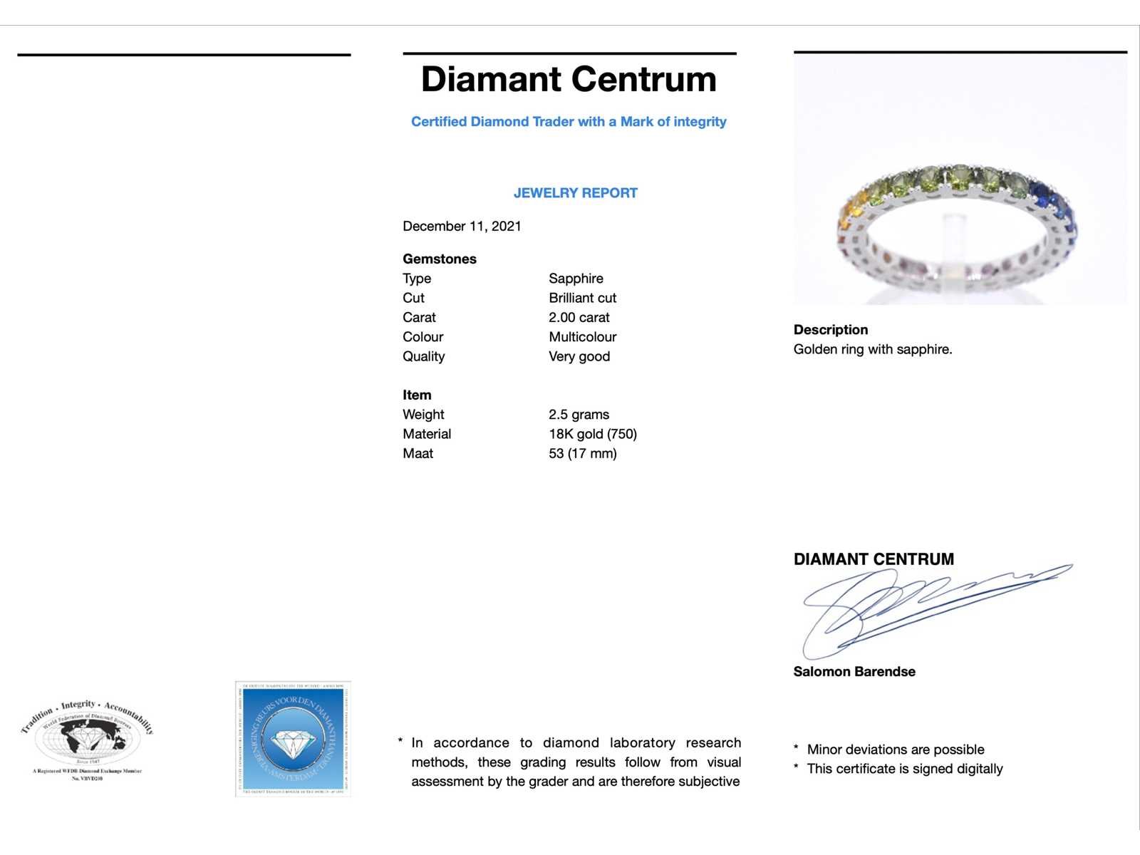 Samenvatting van gegevens Witgouden ring met multicolour saffieren Edelsteen: Saffieren; Aantal: 25 stuks; Slijpvorm: Briljant geslepen; Gewicht (carat): 2.00 carat; Kleur: Multicolour; Slijpkwaliteit: Very good; Juweel: Ring; Gewicht: 2.5 gram; Ringmaat (op maat gemaakt*): 53 (17 mm); Materiaal: 18K goud (750); Conditie: Nieuw; Verpakking: Luxe sieradendoos; Toelichting: De kwaliteit is overgenomen van het rapport behorend bij item. De waardebepaling is een beoordeling van een gecertificeerde diamantair, gebaseerd op consumentenprijzen.; Consumentenprijs: € 3.675,- Within 14 days Materiaal: Goud Edelsteen: Saffieren Totaal gewicht: 2.5g Keurmerk: 750 Kleur edelsteen: Multicolour Slijpvorm edelsteen: Briljant geslepen Slijpkwaliteit edelsteen: Very good