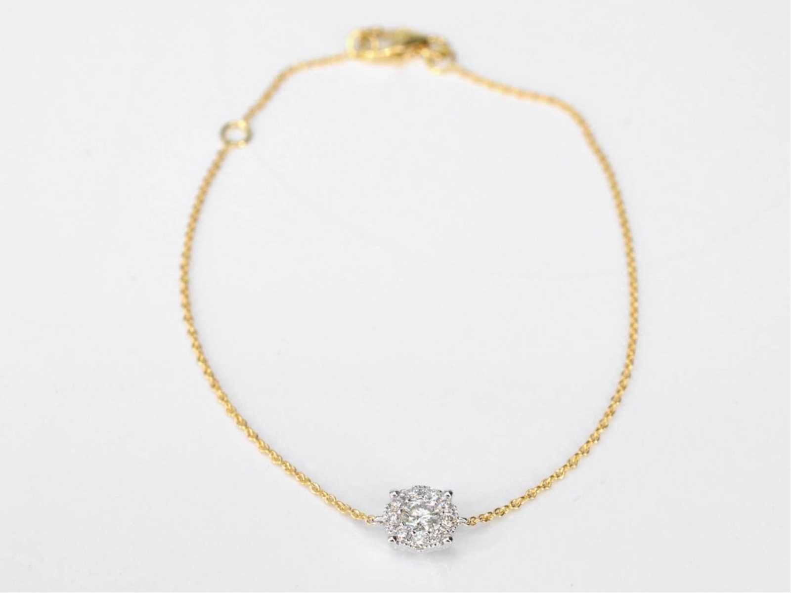 Samenvatting van gegevens Gouden armband met een diamanten bedel Diamant: Natuurlijk; Slijpvorm: Briljant geslepen; Gewicht (carat): 0.35 carat; Kleur: F-G; Zuiverheid: VS; Slijpkwaliteit: Zeer mooi; Juweel: Armband; Gewicht: 1.6 gram; Afmetingen/lengte: 16 - 18 cm (verstelbaar); Materiaal: 18K goud (750); Conditie: Nieuw; Verpakking: Luxe sieradendoos; Toelichting: De kwaliteit is overgenomen van het rapport behorend bij item. De waardebepaling is een beoordeling van een gecertificeerde diamantair, gebaseerd op consumentenprijzen.; Extra informatie: ook geschikt als enkelbandje; Consumentenprijs: € 3.360,- Within 14 days Materiaal: Goud Voornaamste diamant: Natuurlijk Kleur diamant: F-G Gewicht diamant: 0.35ct Slijpvorm diamant: Briljant geslepen Slijpkwaliteit diamant: Zeer mooi Zuiverheidsgraad diamant: VS Totaal gewicht: 1.6g Keurmerk: 750