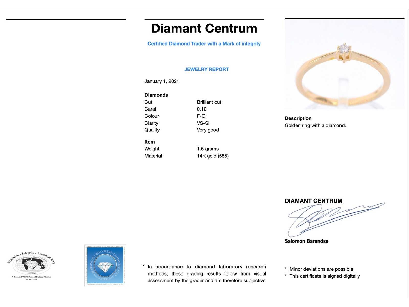 Samenvatting van gegevens Gouden ring solitaire met een briljant geslepen diamant Diamant: Natuurlijk; Aantal: 1 stuk; Slijpvorm: Briljant geslepen; Gewicht (carat): 0.10 carat; Kleur: F-G; Zuiverheid: VS-SI; Slijpkwaliteit: Zeer mooi; Juweel: Ring; Gewicht: 1.6 gram; Ringmaat (op maat gemaakt*): 54 (17.25 mm); Materiaal: 14 karaat (585); Conditie: Nieuw; Verpakking: Luxe sieradendoos; Toelichting: De kwaliteit is overgenomen van het rapport behorend bij item. De waardebepaling is een beoordeling van een gecertificeerde diamantair, gebaseerd op consumentenprijzen.; Consumentenprijs: € 1.418,- Within 14 days Voornaamste diamant: Natuurlijk Gewicht diamant: 0.10ct Totaal gewicht: 1.6g Keurmerk: 585 Kleur diamant: F-G Slijpvorm diamant: Briljant geslepen Slijpkwaliteit diamant: Zeer mooi Zuiverheidsgraad diamant: VS-SI