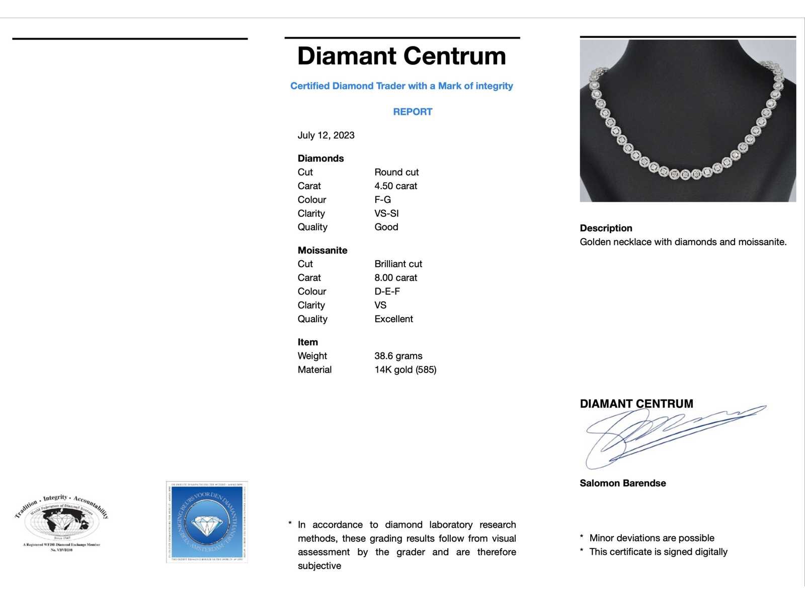 Samenvatting van gegevens Witgouden collier met diamanten en briljanten 12.50 carat Diamant: Natuurlijk; Aantal: 994 stuks; Slijpvorm: Rond geslepen; Gewicht (carat): 4.50 carat; Kleur: F-G; Zuiverheid: VS-SI; Slijpkwaliteit: mooi; Edelsteen: Moissaniet; Aantal: 71 stuks; Slijpvorm: Briljant geslepen; Gewicht (carat): 8.00 carat; Kleur: D-E-F; Zuiverheid: VS; Slijpkwaliteit: Excellent; Juweel: collier; Gewicht: 38.6 gram; Afmetingen/lengte: 46.5 cm; Materiaal: 14 karaat (585); Conditie: Nieuw; Verpakking: Luxe sieradendoos; Toelichting: De kwaliteit is overgenomen van het rapport behorend bij item. De waardebepaling is een beoordeling van een gecertificeerde diamantair, gebaseerd op consumentenprijzen.; Consumentenprijs: € 21.000,- Within 14 days Voornaamste diamant: Natuurlijk Kleur diamant: F-G Gewicht diamant: 4.50ct Slijpvorm diamant: Rond geslepen Slijpkwaliteit diamant: mooi Zuiverheidsgraad diamant: VS-SI Edelsteen: Moissaniet Kleur edelsteen: D-E-F Totaal gewicht: 38.6g Keurmerk: 585 Slijpkwaliteit edelsteen: Excellent Slijpvorm edelsteen: Briljant geslepen Zuiverheidsgraad edelsteen: VS