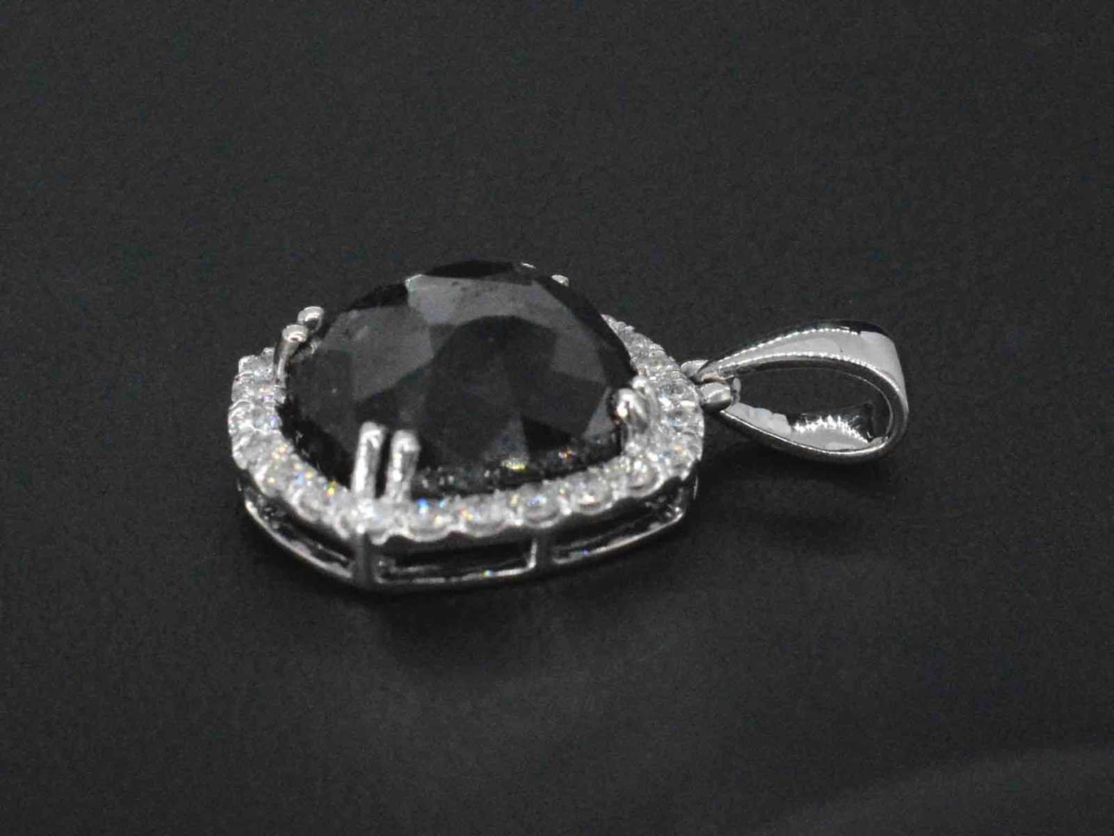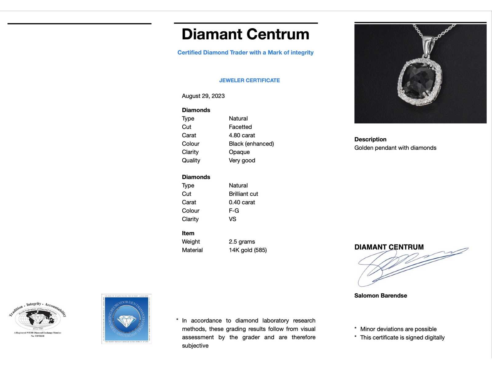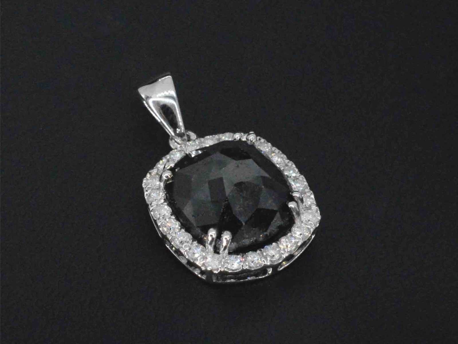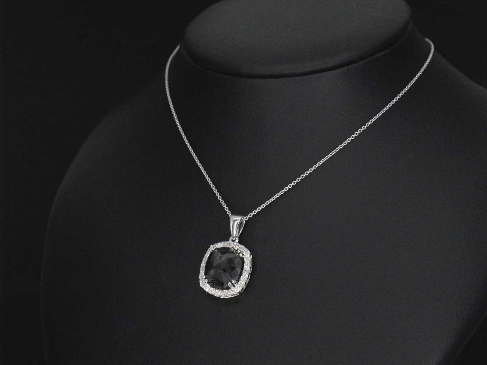 Samenvatting van gegevens Witgouden hanger met diamanten en een zwarte diamant van 4.80 carat Diamant: Natuurlijk; Aantal: 1 stuk; Slijpvorm: Gefacetteerd; Gewicht (carat): 4.80 carat; Kleur: Zwart (enhanced); Zuiverheid: Opaak; Slijpkwaliteit: Zeer mooi; Diamant (secundair): Witte diamant; Aantal diamanten: 23 stuks; Slijpvorm: Briljant geslepen; Gewicht (carat): 0.40 carat; Kleur: F-G; Zuiverheid: VS; Slijpkwaliteit: Very good; Juweel: Hanger (excl. ketting); Gewicht: 2.5 gram; Afmetingen/lengte: 21 x 14 mm; Materiaal: 14k goud (585); Conditie: Nieuw; Verpakking: Luxe sieradendoos; Toelichting: De kwaliteit is overgenomen van het rapport behorend bij item. De waardebepaling is een beoordeling van een gecertificeerde diamantair, gebaseerd op consumentenprijzen.; Extra informatie: Aan de oppervlakte van deze diamanten zitten nog natuurlijke kenmerken van ruwe diamant, dit kan voor een leek lijken op beschadigingen; Consumentenprijs: € 3.960,- Within 14 days Materiaal: Goud Voornaamste diamant: Natuurlijk Kleur diamant: Zwart (enhanced) Gewicht diamant: 4.80ct Slijpvorm diamant: Gefacetteerd Slijpkwaliteit diamant: Zeer mooi Zuiverheidsgraad diamant: Opaak Totaal gewicht: 2.5g Keurmerk: 585