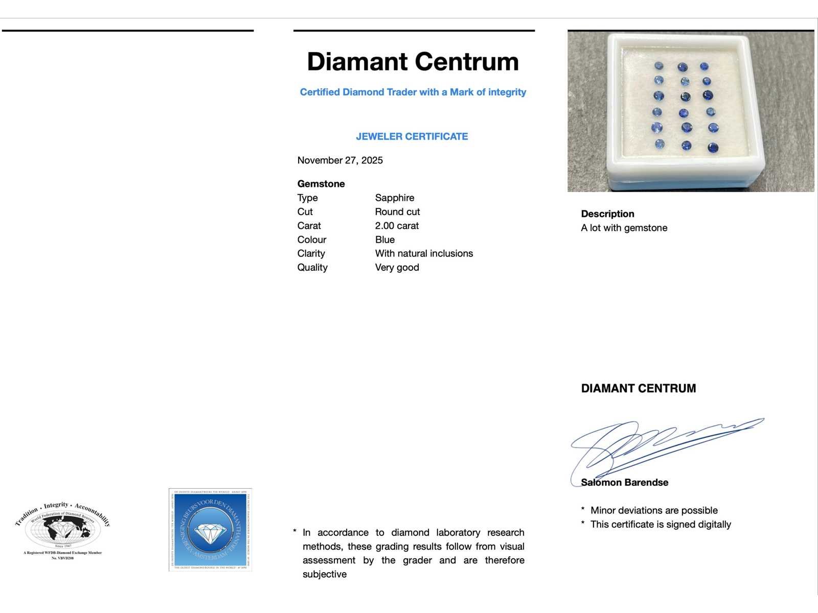 Samenvatting van gegevens Saffier - Mooie rond geslepen natuurlijke saffieren van hoge kwaliteit 2.00 carat Edelsteen: Saffier; Aantal: 18 stuks; Slijpvorm: Rond geslepen; Gewicht (carat): 2.00 carat; Kleur: Blauw; Zuiverheid: Met natuurlijke insluitsels; Slijpkwaliteit: Very good; Conditie: Nieuw; Verpakking: Edelsteendoos; Toelichting: De kwaliteit is overgenomen van het rapport behorend bij item. De waardebepaling is een beoordeling van een gecertificeerde diamantair, gebaseerd op consumentenprijzen.; Consumentenprijs: € 1.760,- Within 14 days Edelsteen: Saffier Kleur edelsteen: Blauw Slijpvorm edelsteen: Rond geslepen Slijpkwaliteit edelsteen: Very good Zuiverheidsgraad edelsteen: Met natuurlijke insluitsels