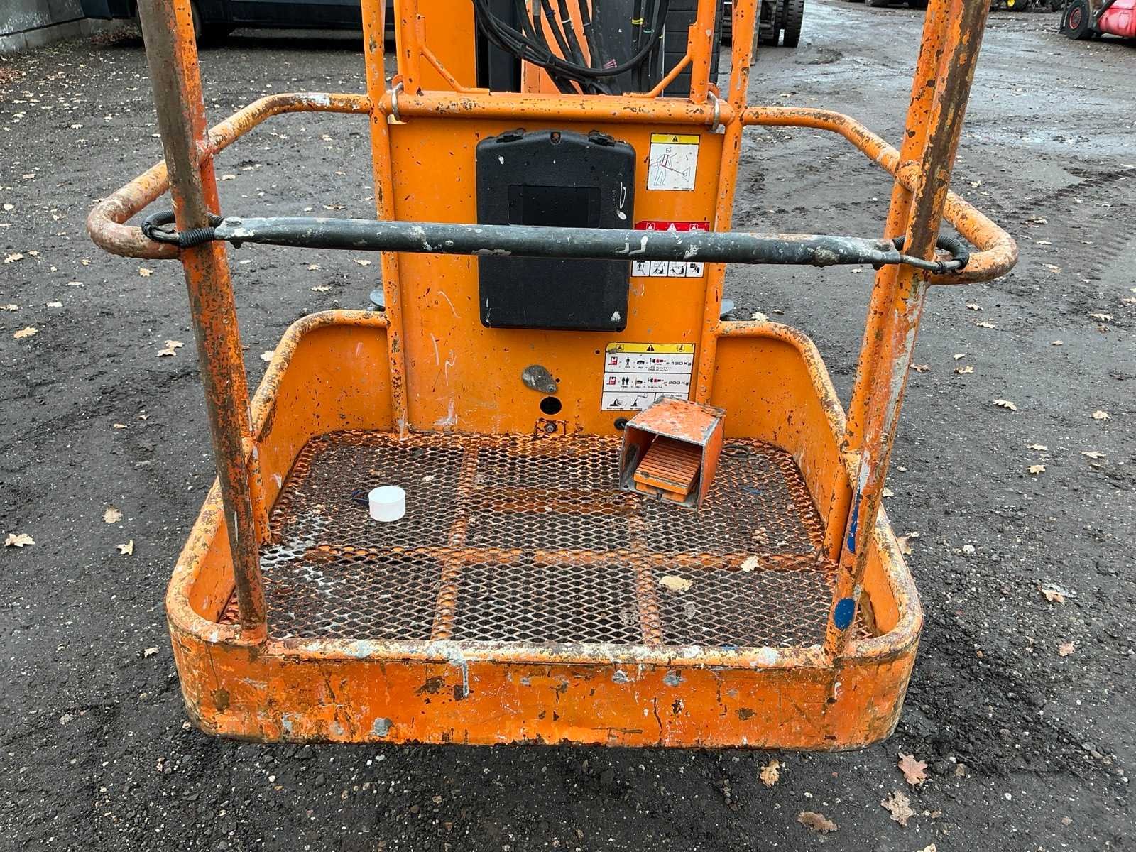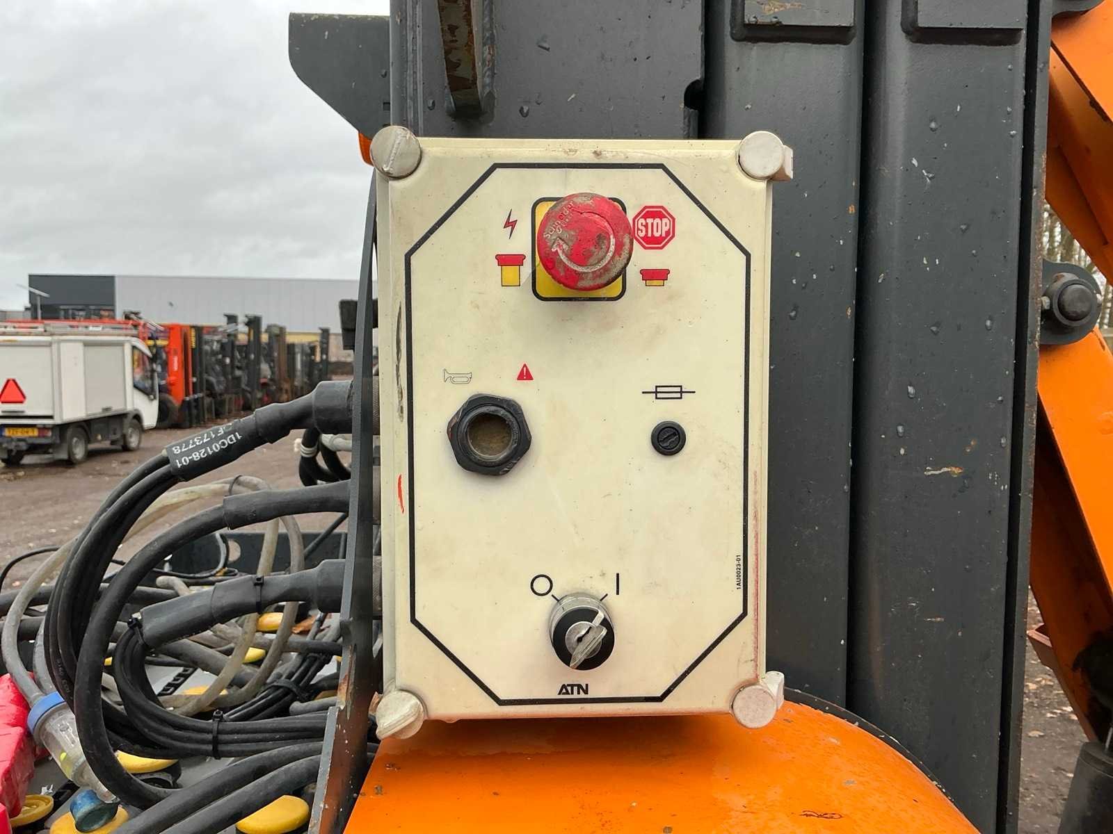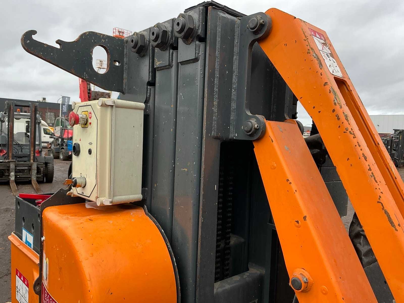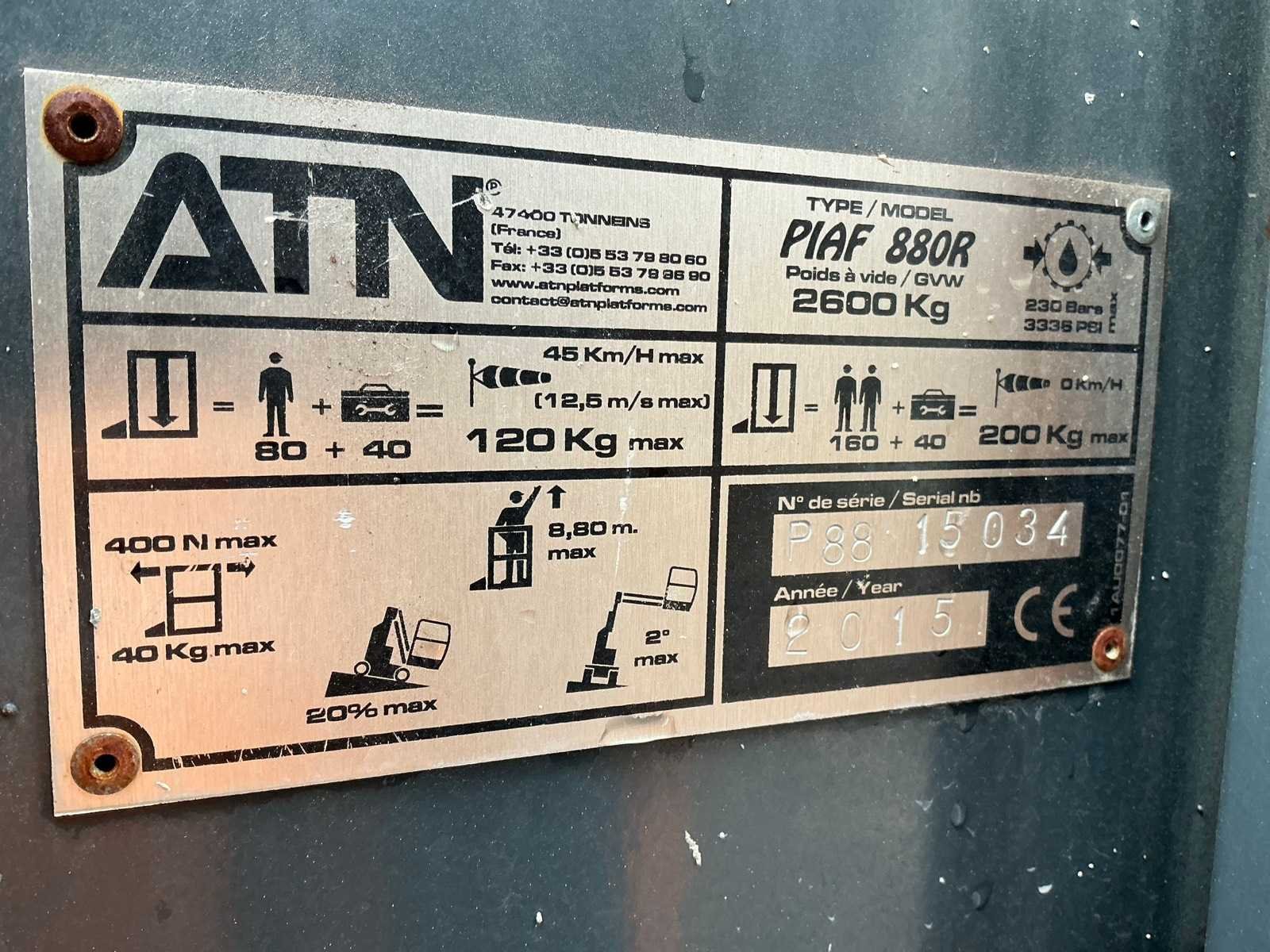 Let op; rijd langzaam, ingebouwde lader, roterende opbouw, 2 rijsnelheden, max hefhoogte 8800mm, max hefvermogen 120kg Merk: ATN Type: Piaf 880R Bouwjaar: 2015 Serienummer: P88 15034 Elektrisch: true Masthoogwerker: true Werkhoogte: 8800mm Horizontale rijkwijdte: 2300mm Plateau afm. l: 800mm Plateau afm. b: 1000mm Platform capaciteit: 120kg Accu lader: true Afgelezen urenstand: 748 Totale afmeting L: 2850mm Totale afmeting Breedte: 1020mm Totale afmeting Hoogte: 2000mm