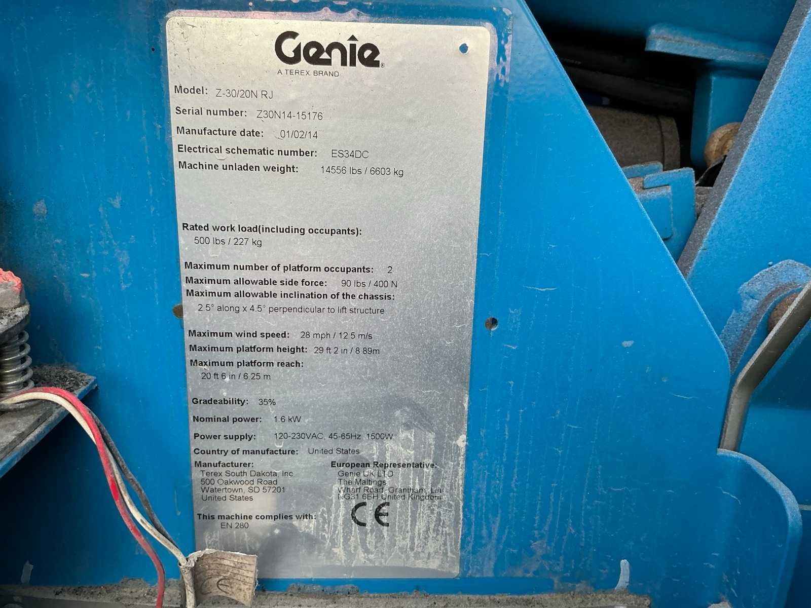 Let op; accu’s zijn slecht, roterende opbouw, roterende werkbak, roterende Jip, 2 delig telescoop mast, Merk: Genie Type: Z30/20N RJ Bouwjaar: 2014 Serienummer: Z30N14-15176 Elektrisch: true Motorvermogen (kW): 1.6kW Telescoop hoogwerker: true Knikarm hoogwerker: true Werkhoogte: 8900mm Horizontale rijkwijdte: 6250mm Plateau afm. l: 760mm Plateau afm. b: 1170mm Platform capaciteit: 230kg Accu lader: true Afgelezen urenstand: 334 Eigen gewicht: 6603kg Totale afmeting L: 5500mm Totale afmeting Breedte: 1200mm Totale afmeting Hoogte: 2100mm