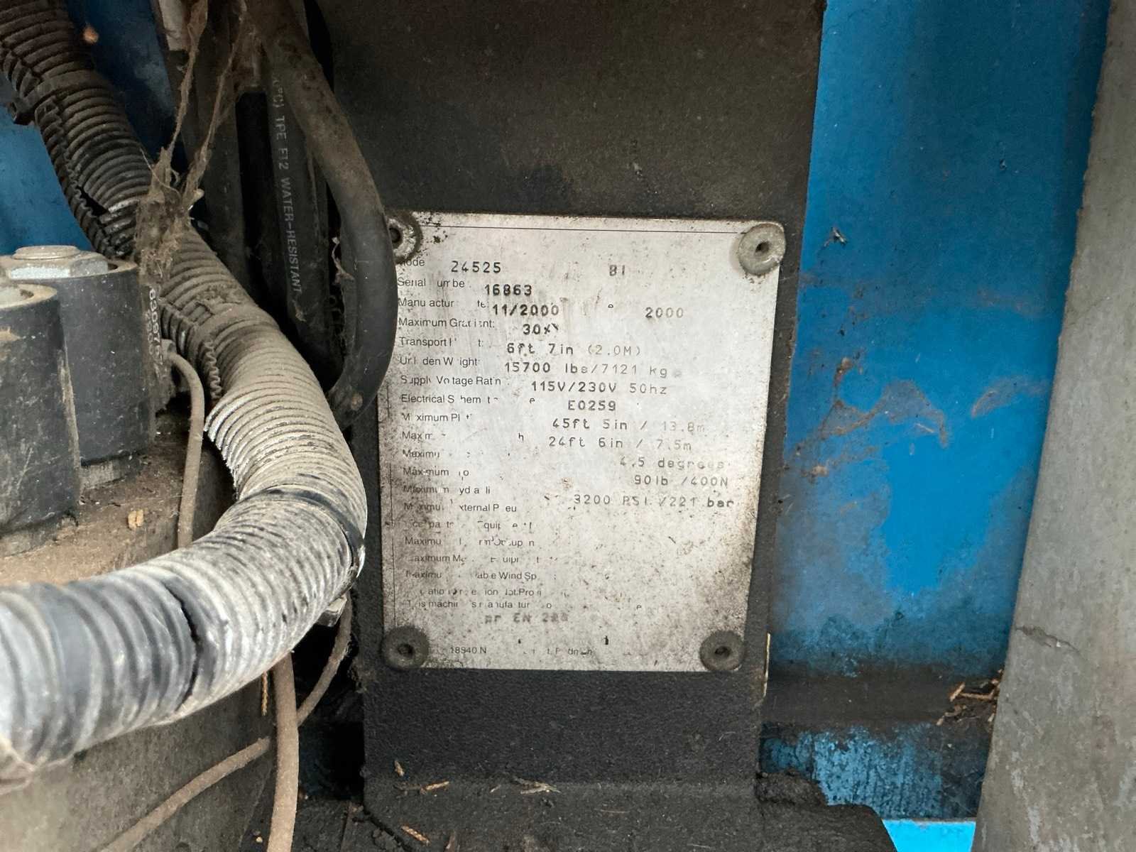 Ingebouwde lader 48V, Roterende opbouw, roterende werkbak, 2 delige telescoop mast, Merk: Genie Type: Z45 Bouwjaar: 2000 Serienummer: 16863 Elektrisch: true Knikarm hoogwerker: true Werkhoogte: 13800mm Horizontale rijkwijdte: 7500mm Plateau afm. l: 750mm Plateau afm. b: 1800mm Platform capaciteit: 230kg Eigen gewicht: 7121kg Totale afmeting L: 5500mm Totale afmeting Breedte: 1800mm Totale afmeting Hoogte: 2000mm