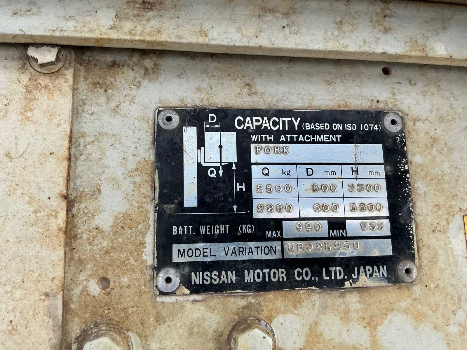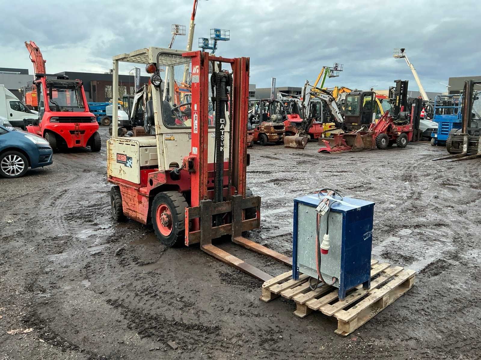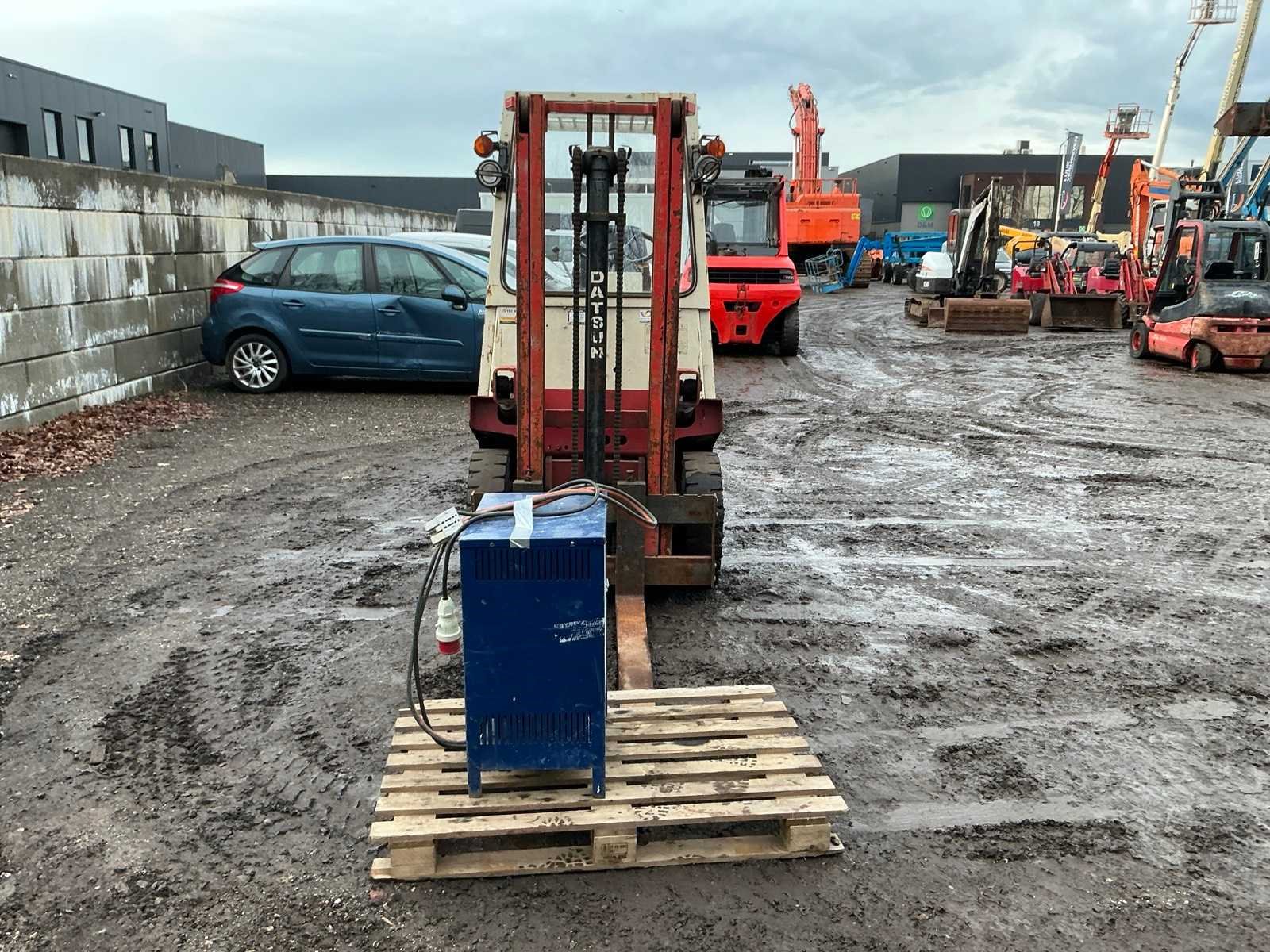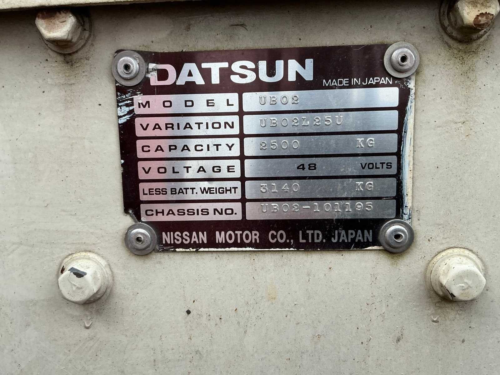 Inclusief lader, Lepels 1070mm, lepelbord 1050mm, werkverlichting, trekoog met pin 25mm, 48V accupakket, max hefhoogte 3300mm, max hefvermogen 2500kg Merk: Datsun Type: UB02 Serienummer: UB02-101195 Brandstof: Elektrisch Mast: Duplex Soort band: Volrubber banden Aantal wielen: 4 Afgelezen urenstand: 1790 Eigen gewicht: 4000kg Hefvermogen: 2500kg Lepellengte: 1070mm Max. hefhoogte: 3300mm Vol rubber banden: true Minimale doorrijhoogte: 2350mm Totale afmeting L: 3400mm Totale afmeting Breedte: 1150mm Totale afmeting Hoogte: 2300mm
