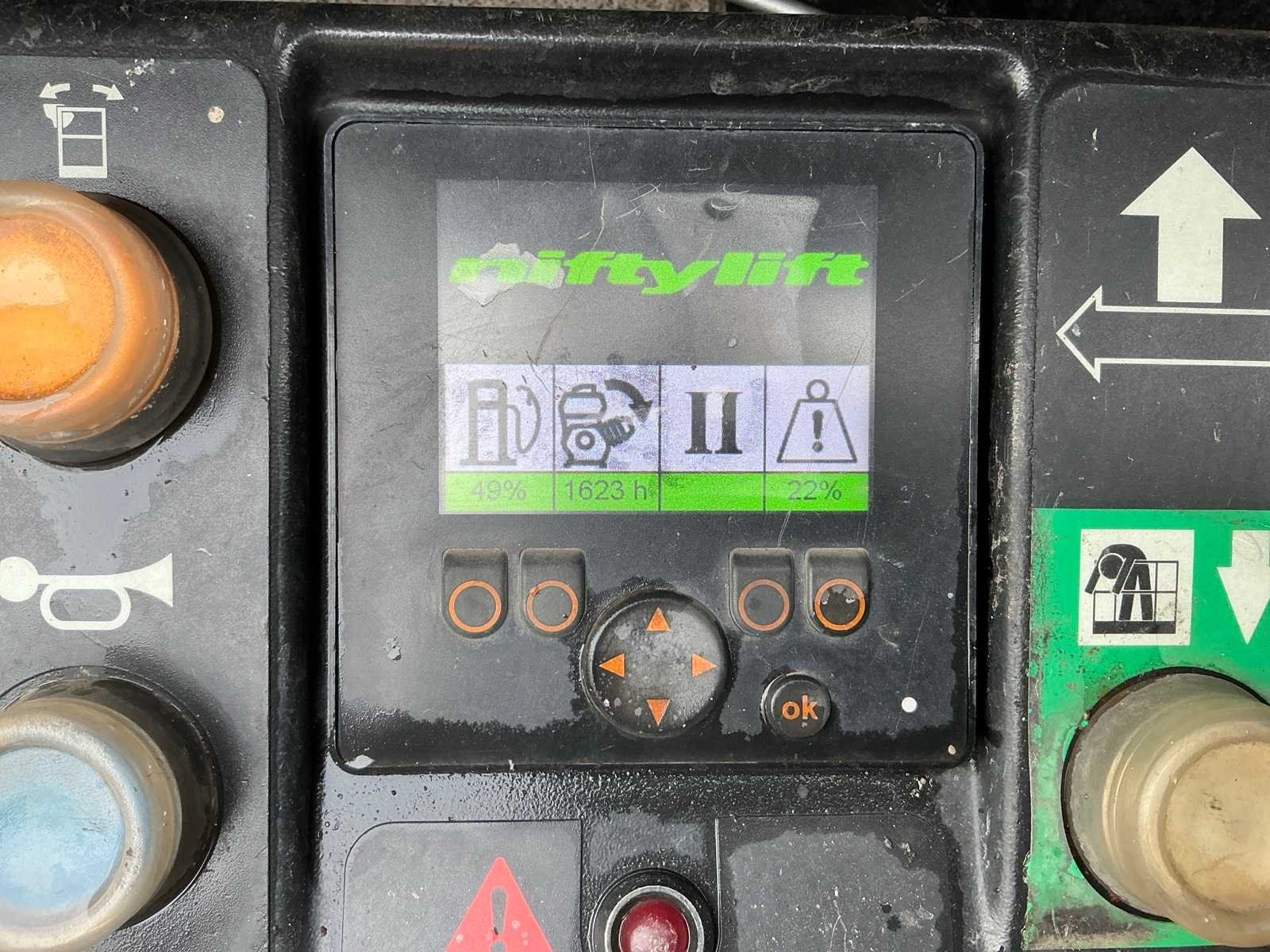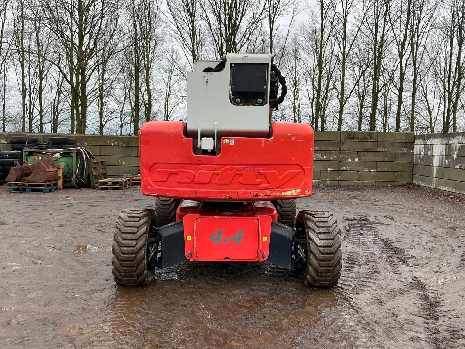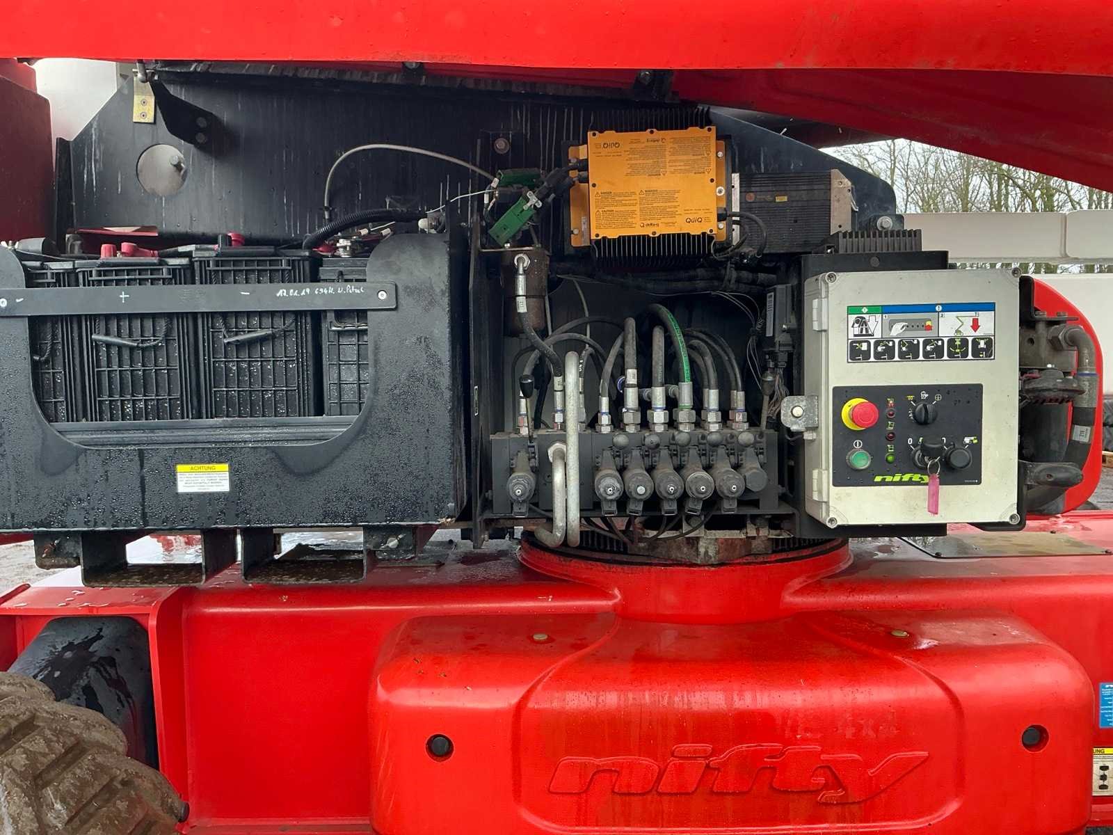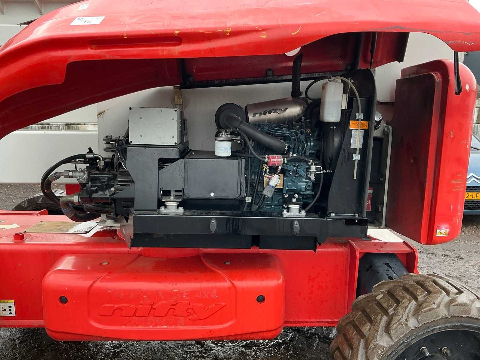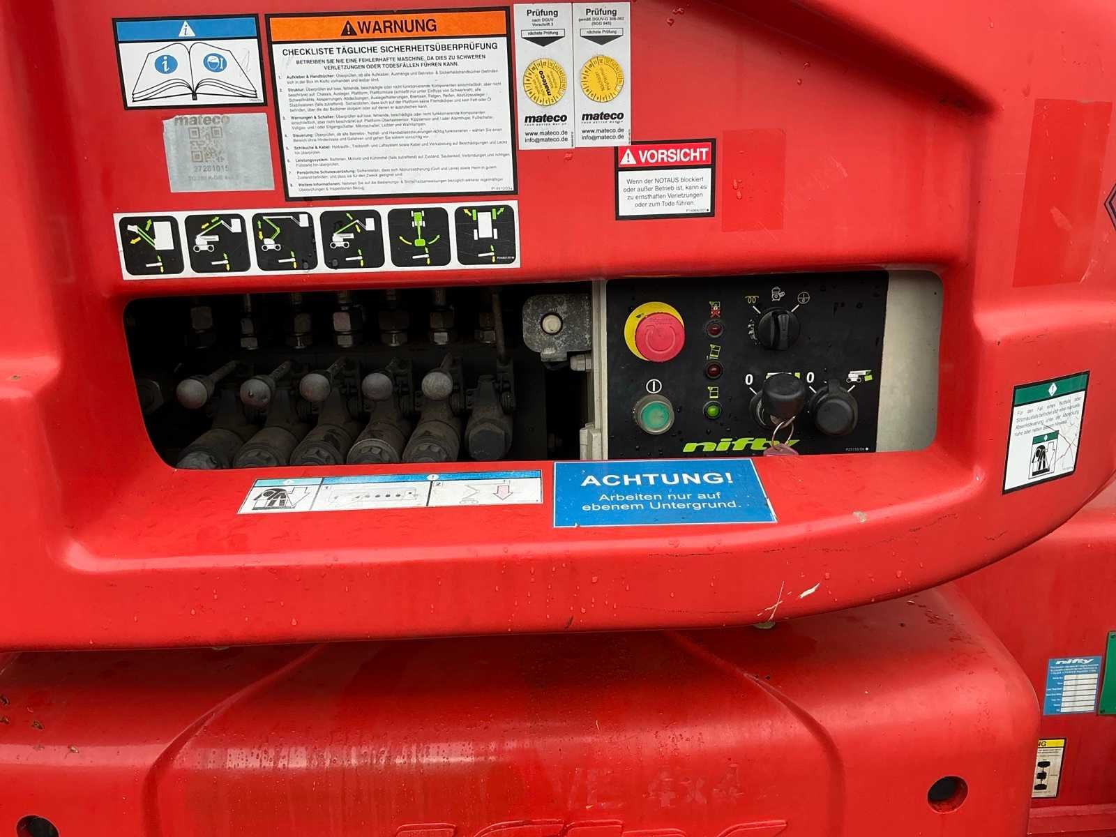 4WD, roterende opbouw, roterende werkbak, 230V stekker, 3 delig telescopische mast, 36V accupakket Merk: Nifty Type: HR28 hybride 4x4 Bouwjaar: 2016 Serienummer: 28 33434 Diesel: true Elektrisch: true Motorvermogen (kW): 18.5kW Knikarm hoogwerker: true Werkhoogte: 28000mm Horizontale rijkwijdte: 19000mm Plateau afm. l: 900mm Plateau afm. b: 2400mm Platform capaciteit: 280kg Accu lader: true Afgelezen urenstand: 1623 Eigen gewicht: 14660kg Totale afmeting L: 9300mm Totale afmeting Breedte: 2500mm Totale afmeting Hoogte: 2700mm