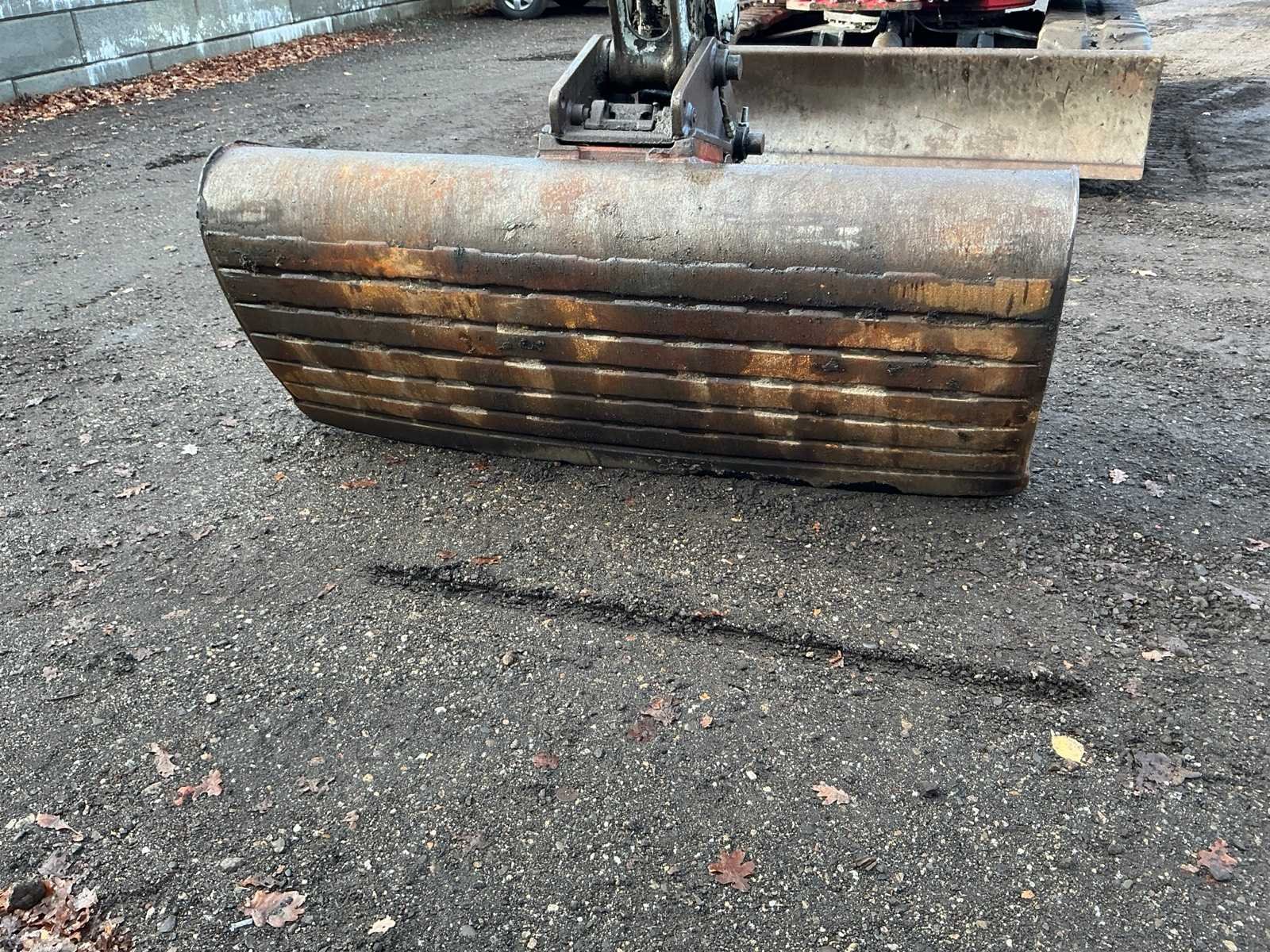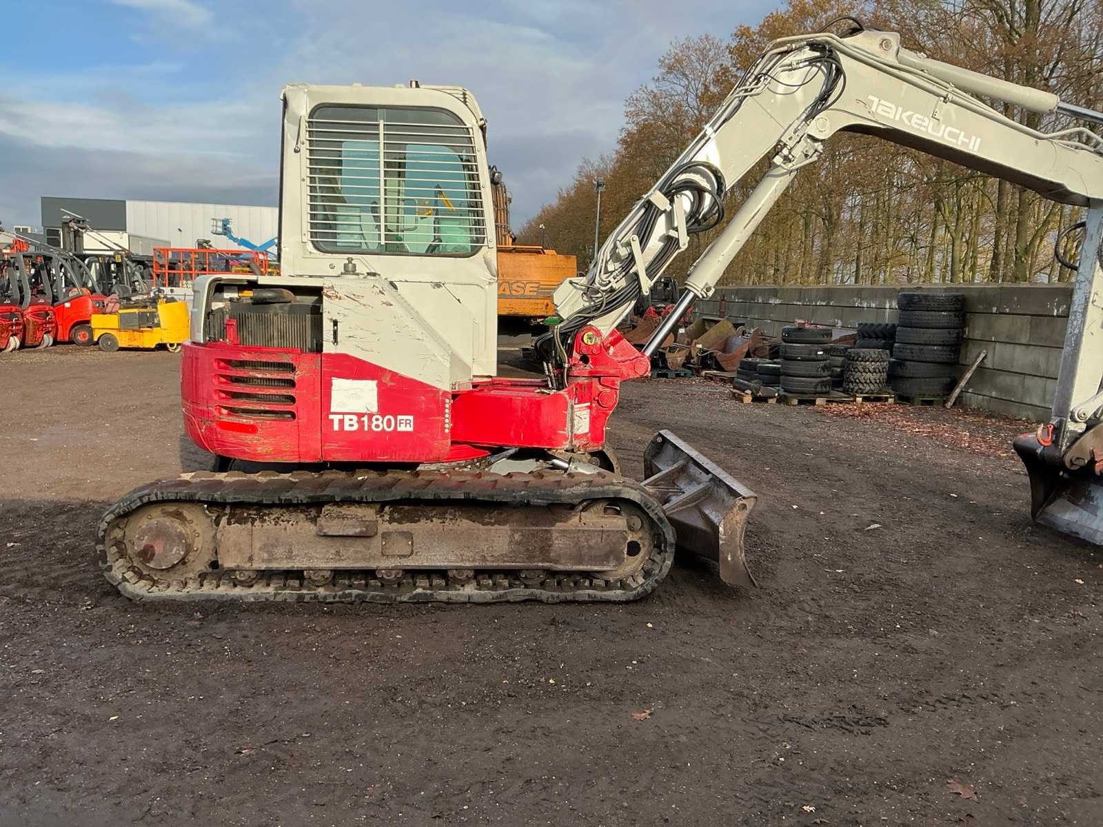 Let op; mast is een beetje krom, Dichte bak 1700mm, vaste pennen, 3e functie, verstelbare giek, blad 2300mm, verwarming, auto idle, radio, Merk: Takeuchi Type: TB 180FR Bouwjaar: 2008 Serienummer: 17830731 Merk motor: Yanmar Motorvermogen (kW): 45kW Aantal cilinders: 4 Brandstof: Diesel Bedrijfsgewicht: 8333kg Max. graafdiepte: 4200mm Graafbak afm. b: 1700mm Rups breedte: 450mm Afgelezen urenstand: 5775 Eigen gewicht: 8333kg Totale afmeting L: 6150mm Totale afmeting Breedte: 2300mm Totale afmeting Hoogte: 2800mm