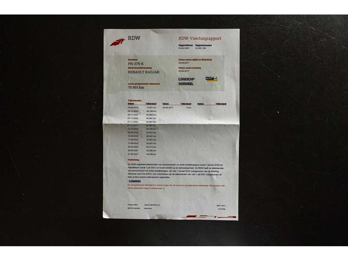 Kenteken: PH-379-K Merk: Renault Model: Kadjar Type: 1.2 TCe Intens Bouwjaar: 2017 Afgelezen kilometerstand: 93765km Cilinderinhoud: 1197cc Vermogen (kW): 96kW Brandstof: Benzine Datum eerste toelating: 2017-06-30 Datum eerste toelating (NL): 2017-06-30 APK vervaldatum: 2025-11-07 Vermogen (pk): 131hp Aantal zitplaatsen: 5 Kleur: grijs Emissieklasse: 6 Aantal deuren: 5 Ledig gewicht: 1281kg Bruto BPM (NL): 5701€ Aantal cilinders: 4 Carrosserie: stationwagen Nationaliteit documenten: NL