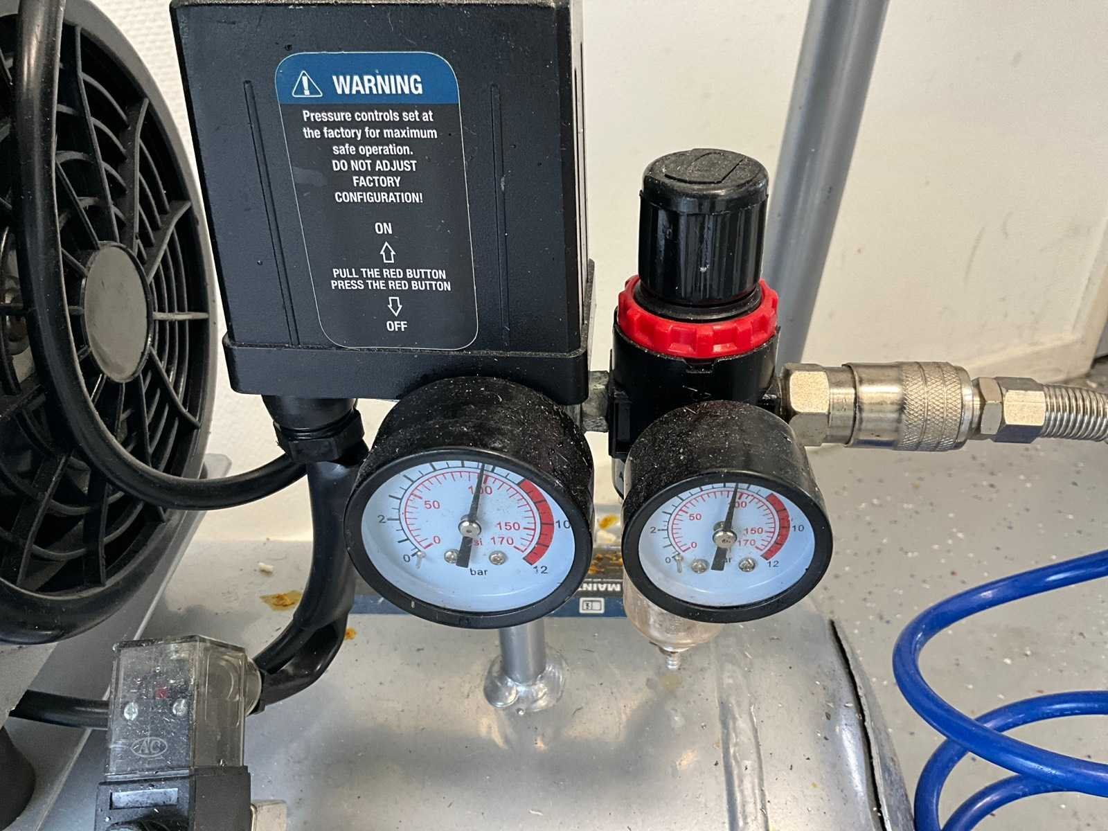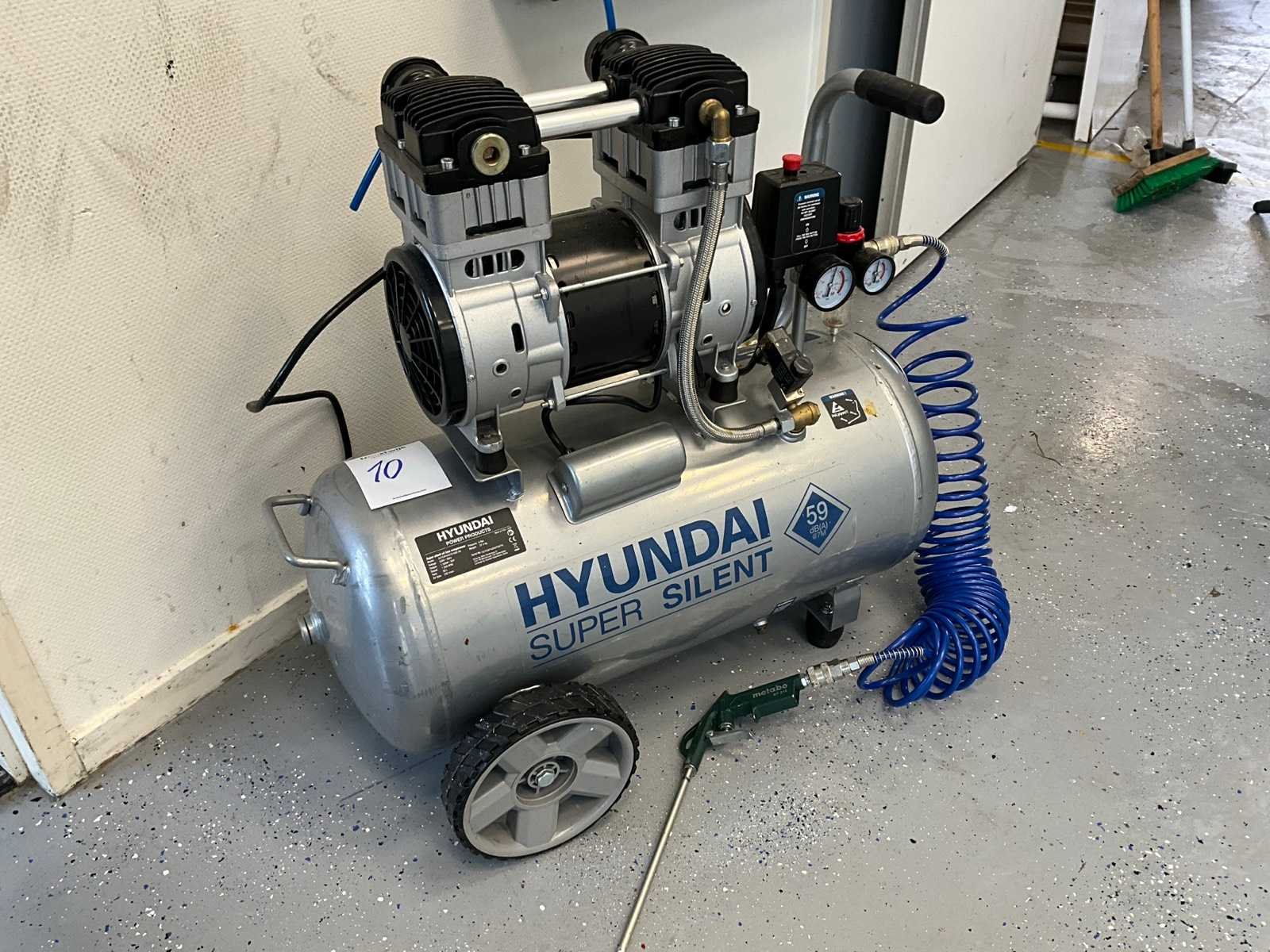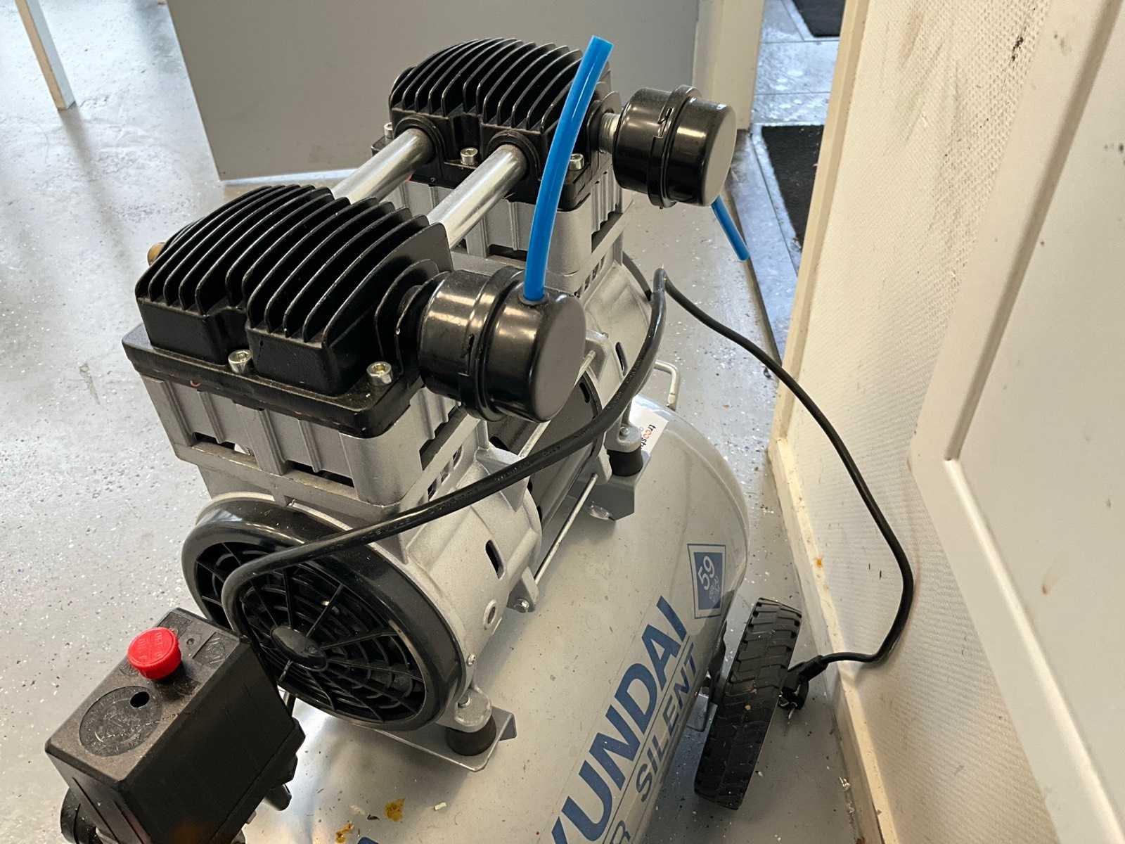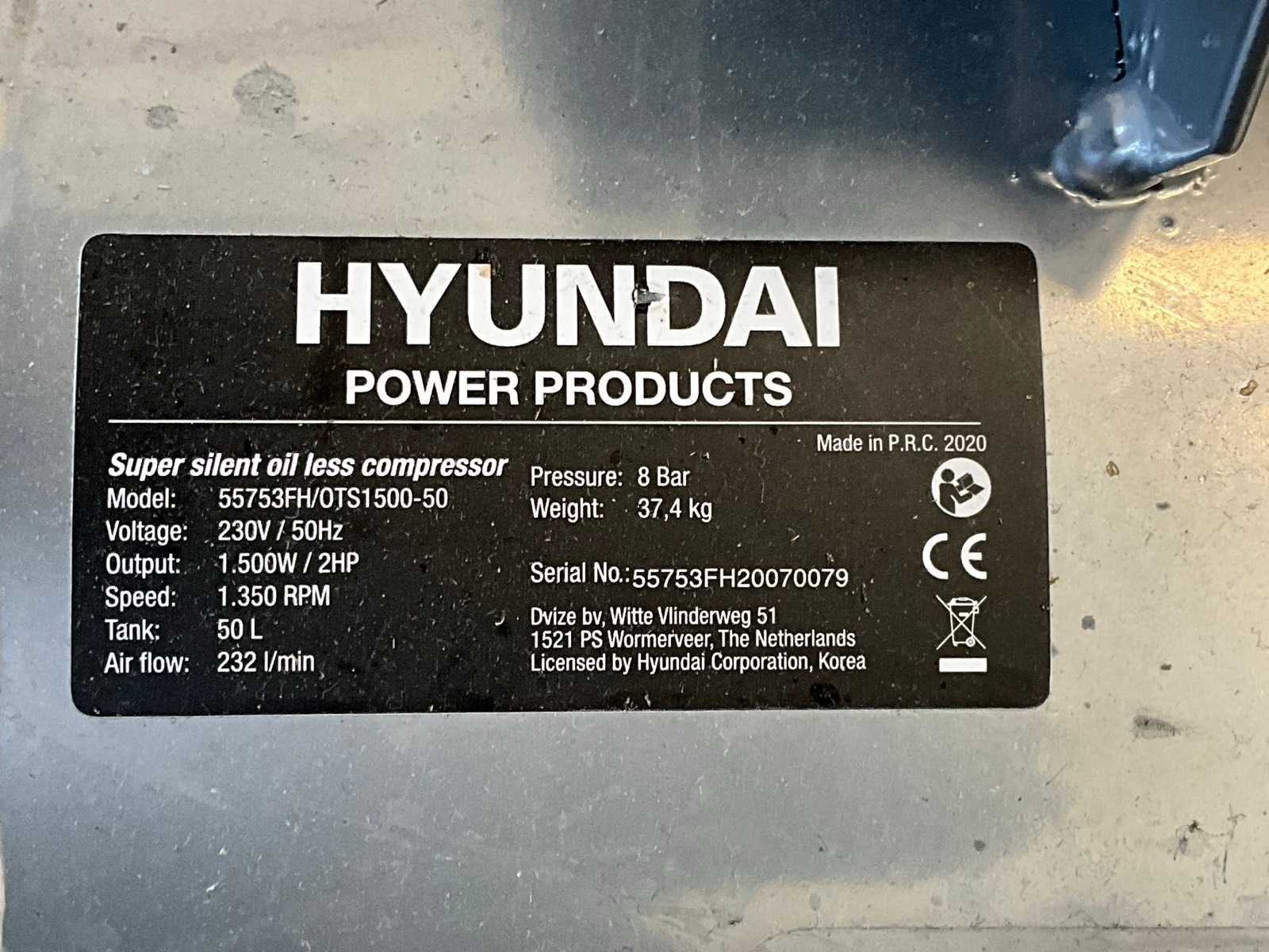 Merk: Hyundai Type: OTS1500-50 Bouwjaar: 2020 Serienummer: 55753FH20070079 Capaciteit.: 8bar Luchtstroom: 232l/min Vermogen: 1.5kW Buffertank inhoud: 50l Aansluiting: 230V Eigen gewicht: 37.4kg Totale afmeting L: 640mm Totale afmeting Breedte: 450mm Totale afmeting Hoogte: 600mm