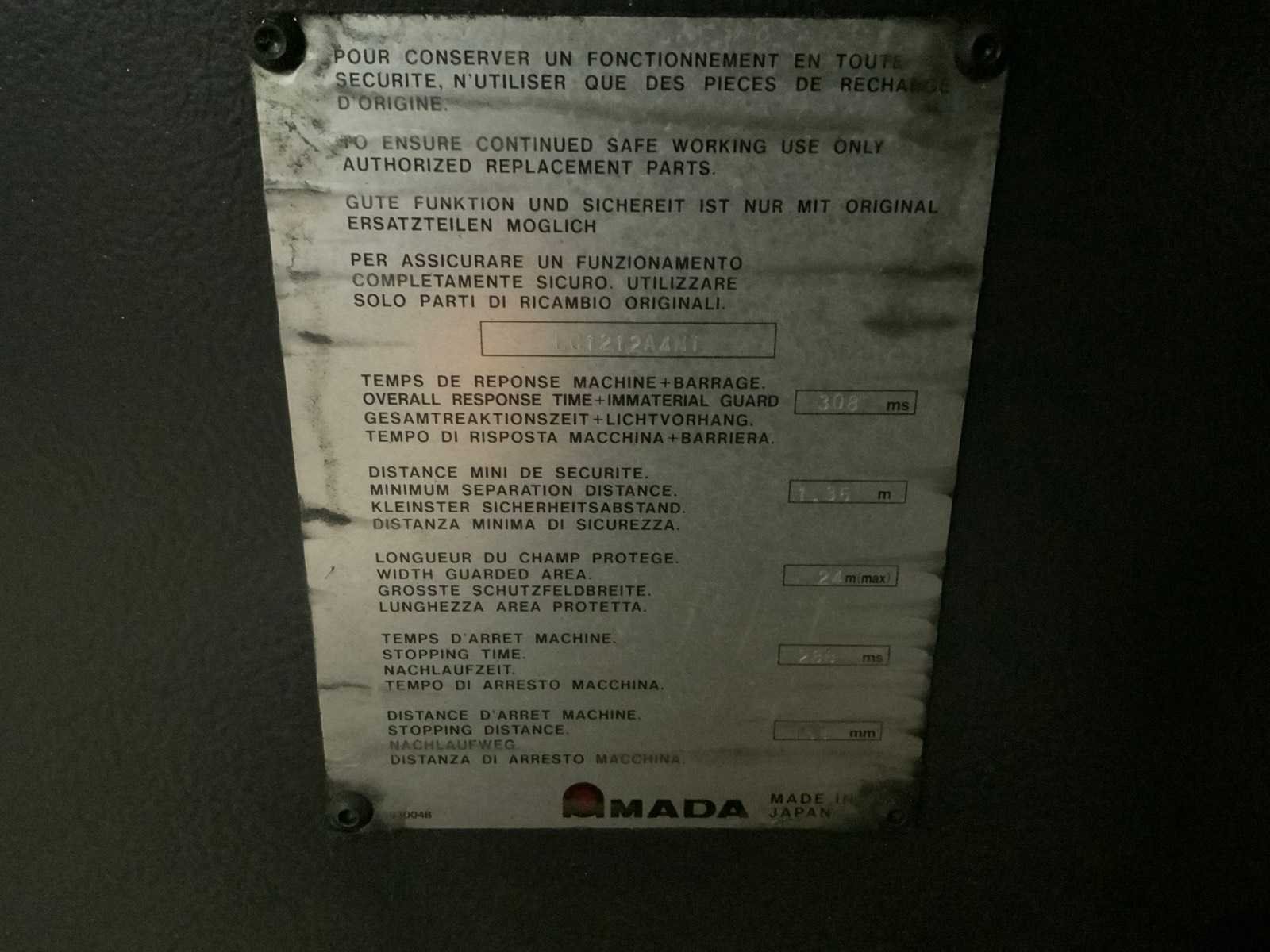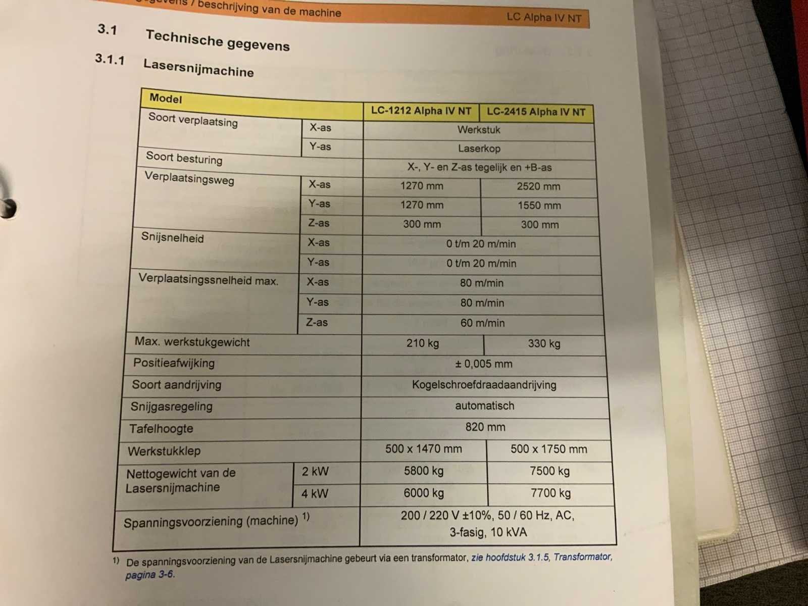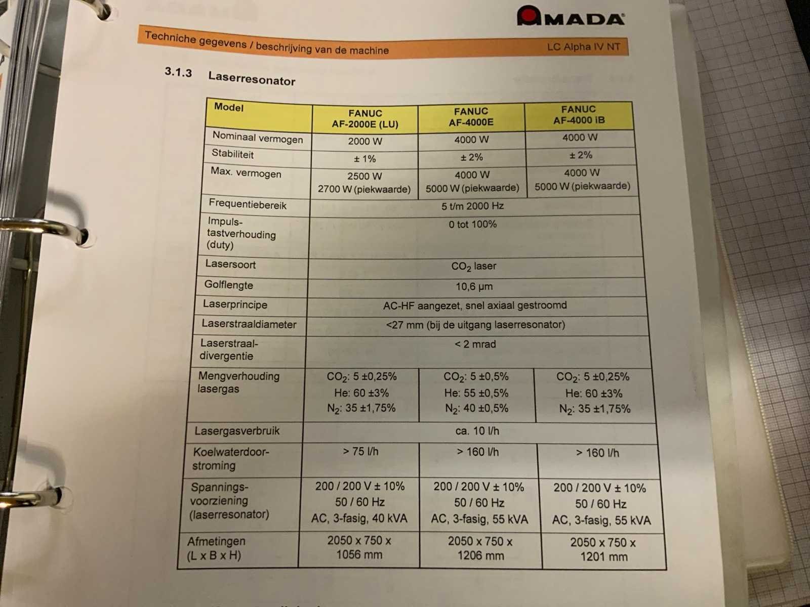 V.v. “Fanuc” laser; type AF4000E; A048-B13-B311; model C4000 815; bouwjaar 2007; 69 kVA; “Amada” wisselportaal; type MP 1225; met “Amada” CNC-besturing; invoerunit; vacuümbeladingsunit; overspanning ca. 7 meter; (2x) palletbunker; max. belasting 3000 kg; “Herding” afzuigunit met filterkast type DELTAComp 1500-5/9 SB (2006), “Riedel” koelinstallatie type PC 315.21-NE-LAS (2006) t.b.v. laserbron; “Atlas Copco schroefcompressor type GA11 (1998) met buffertank en luchtverzorgings unit incl. machine hekwerk Merk: Amada Type: LC1212A4NT Bouwjaar: 2006 Serienummer: 45441494 Laservermogen: 4kW Werkbereik x: 1270mm Werkbereik y: 1270mm Werkbereik z: 300mm Tafel afmeting l: 4600mm Tafel afmeting b: 1800mm Digitale uitlezing: true Aansluiting: 400V Machinegewicht: 6000kg Afmeting l: 10000mm Afmeting b: 4200mm Afmeting h: 2300mm