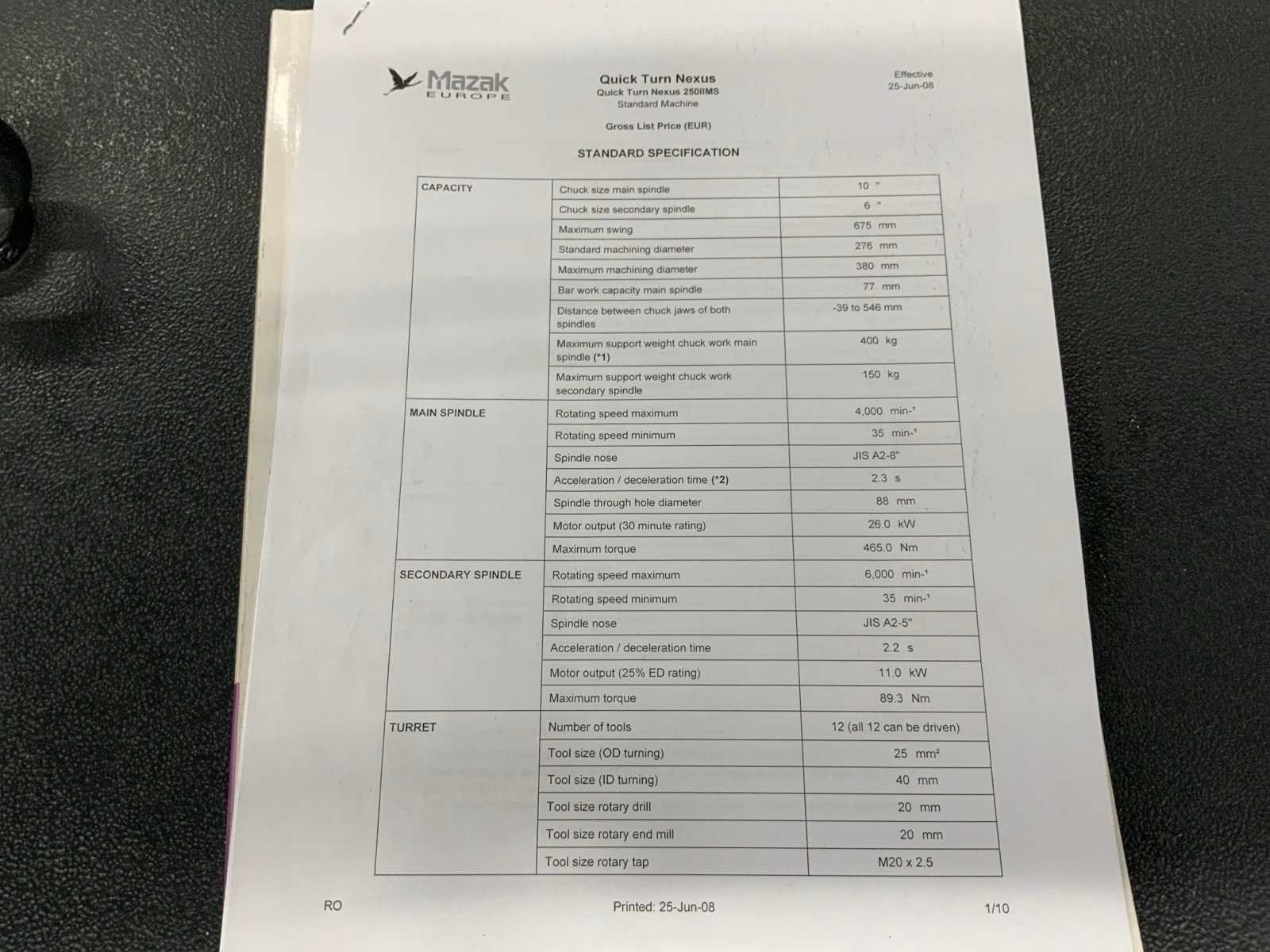 Voorzien van 12 positie revolver gereedschapshouder Merk: Mazak Type: Quick turn 250 1000L Bouwjaar: 2004 Serienummer: 167725 Draai: 675mm Draailengte: 546mm Holle spil Ø: 77mm Snelheid tot n =: 4000rpm Aantal gereedschapwisselstations: 13 Spanentransporteur: true CNC-besturing, merk, type: Matrasol 640T Nexus Aansluiting: 400V Machinegewicht: 5200kg Afmeting l: 4350mm Afmeting b: 1950mm Afmeting h: 1830mm