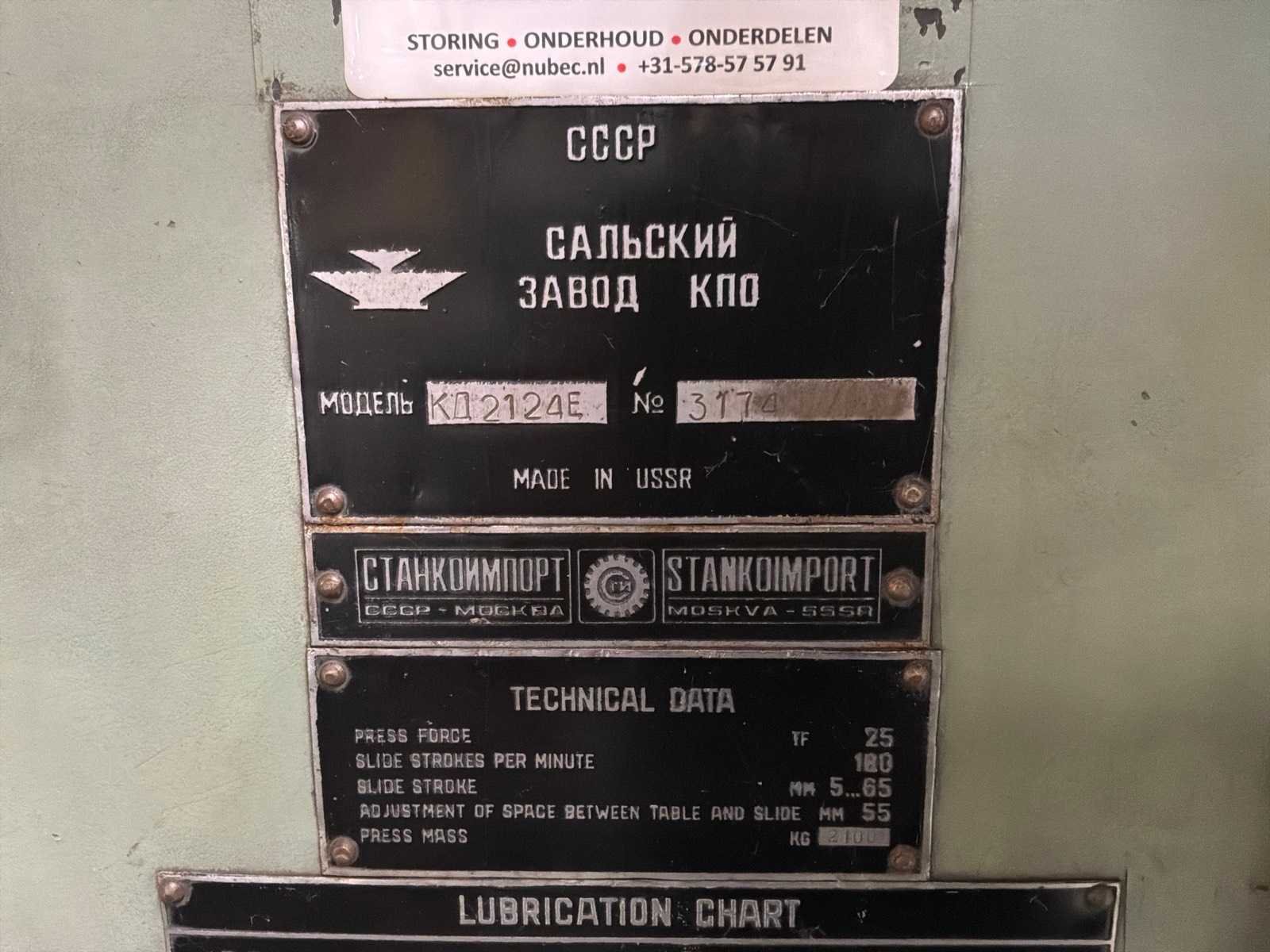 Met diverse toebehoren op meeretagerek en stalen tafel Merk: Stankoimport Type: K 2124E Capaciteit.: 25t Uitlading: 200mm Aansluiting: 400V Afmeting l: 1100mm Afmeting b: 1250mm Afmeting h: 2400mm