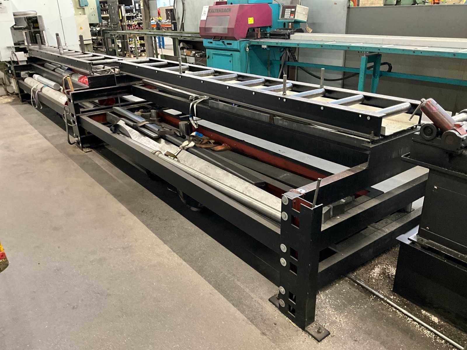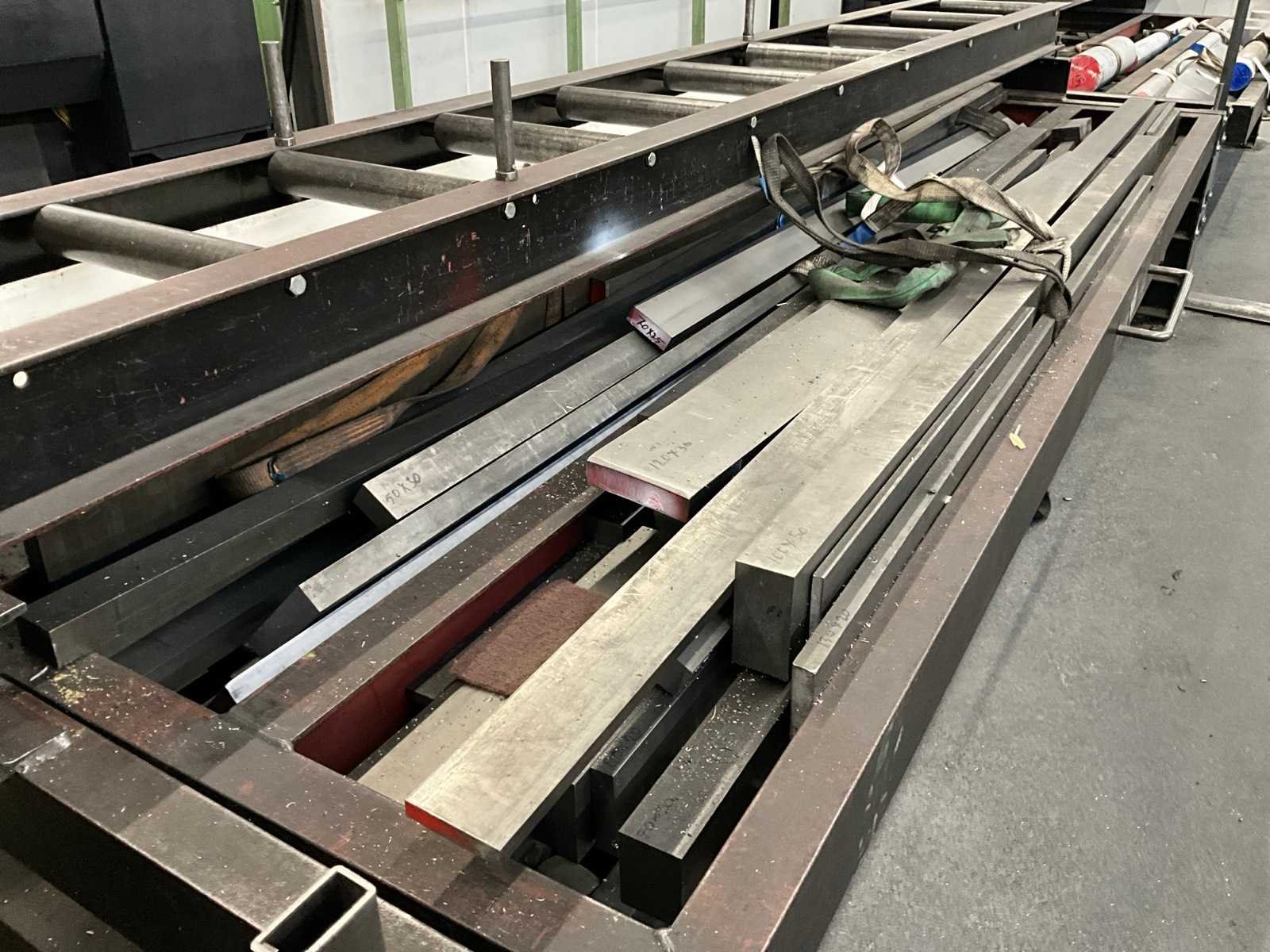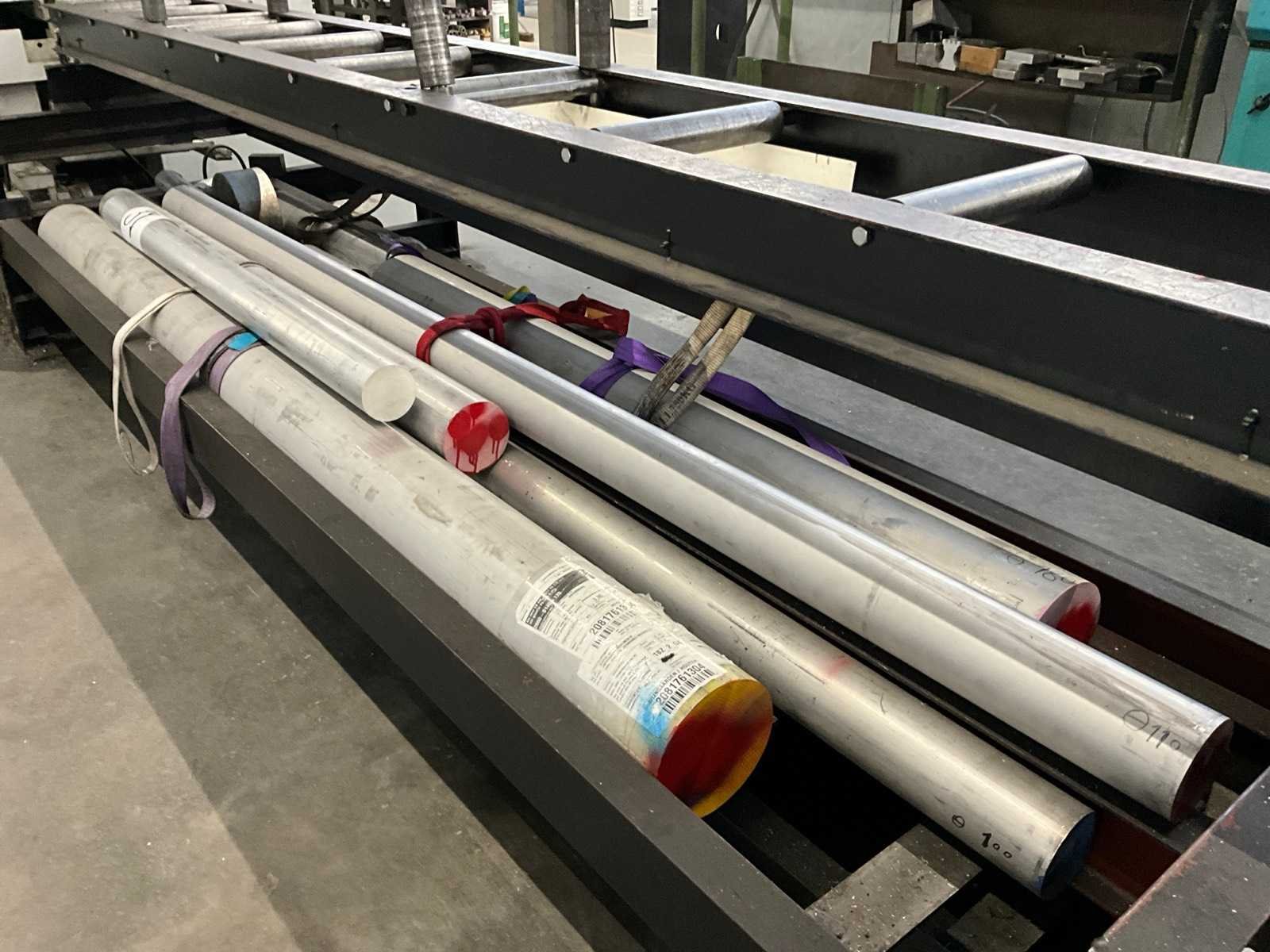 Waaronder aluminium rondstaven Ø van 90 mm tot 170 mm; zaagstukken; stalen balken lengtes tot circa. 320 cm en reststukken; voorzien van stalen materiaalbakken met lades en rollenbaan totale afmeting 715x150x100 cm