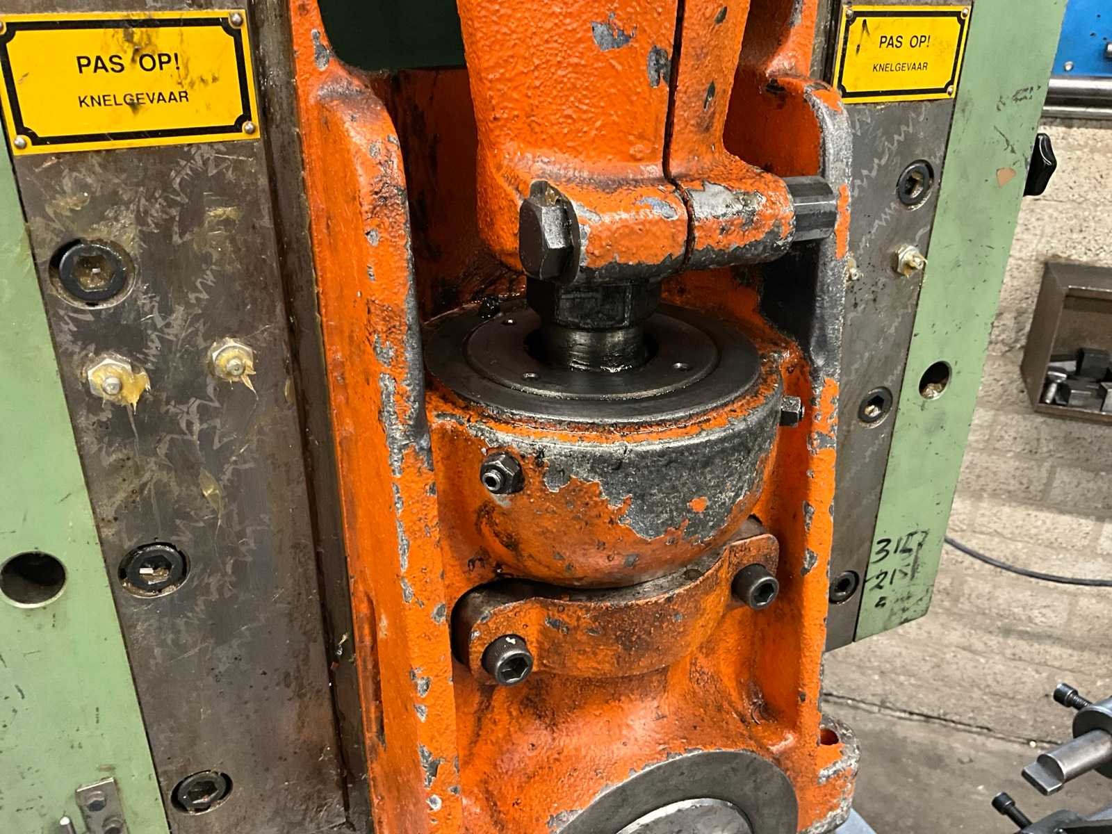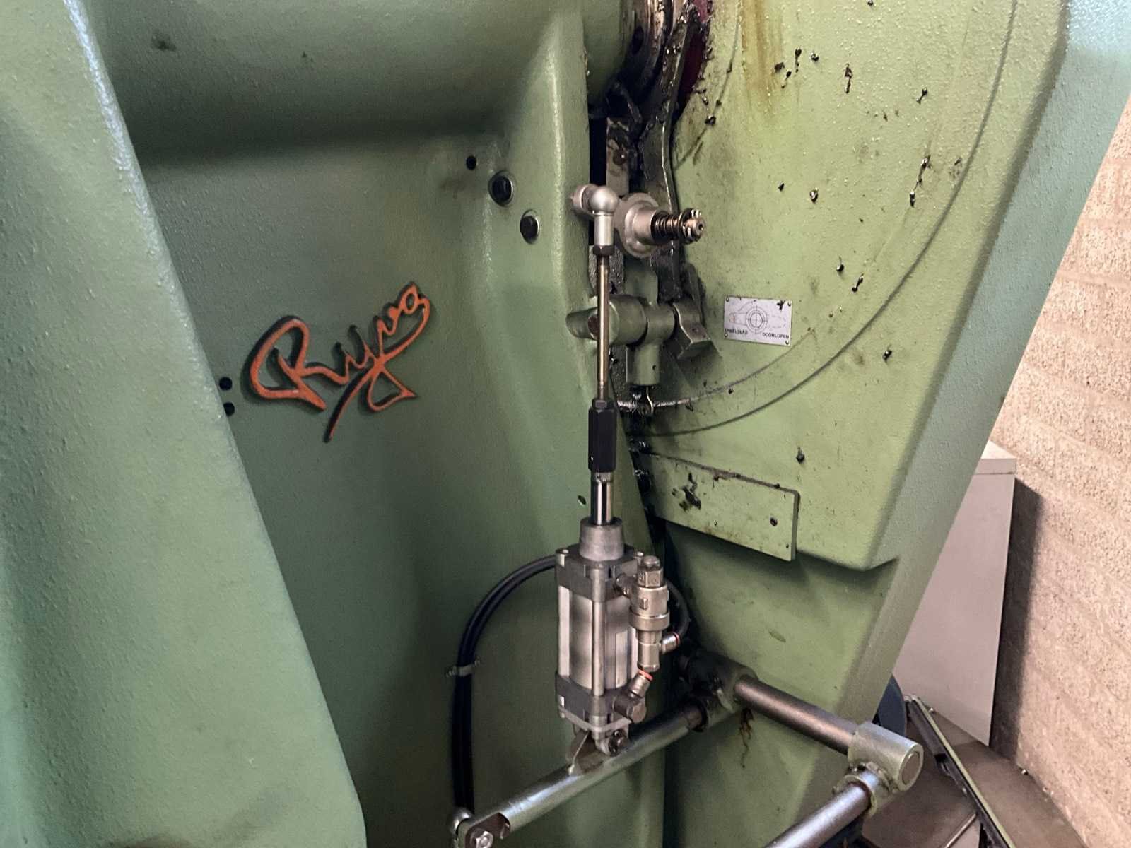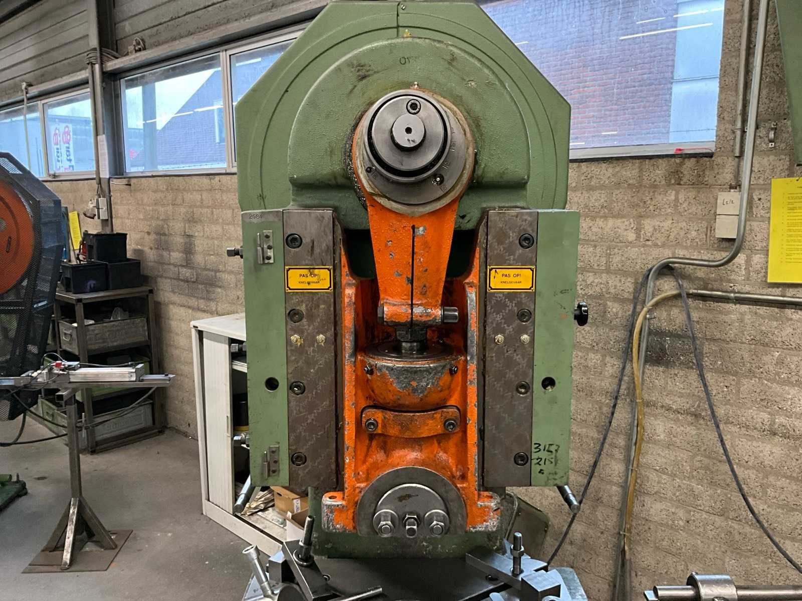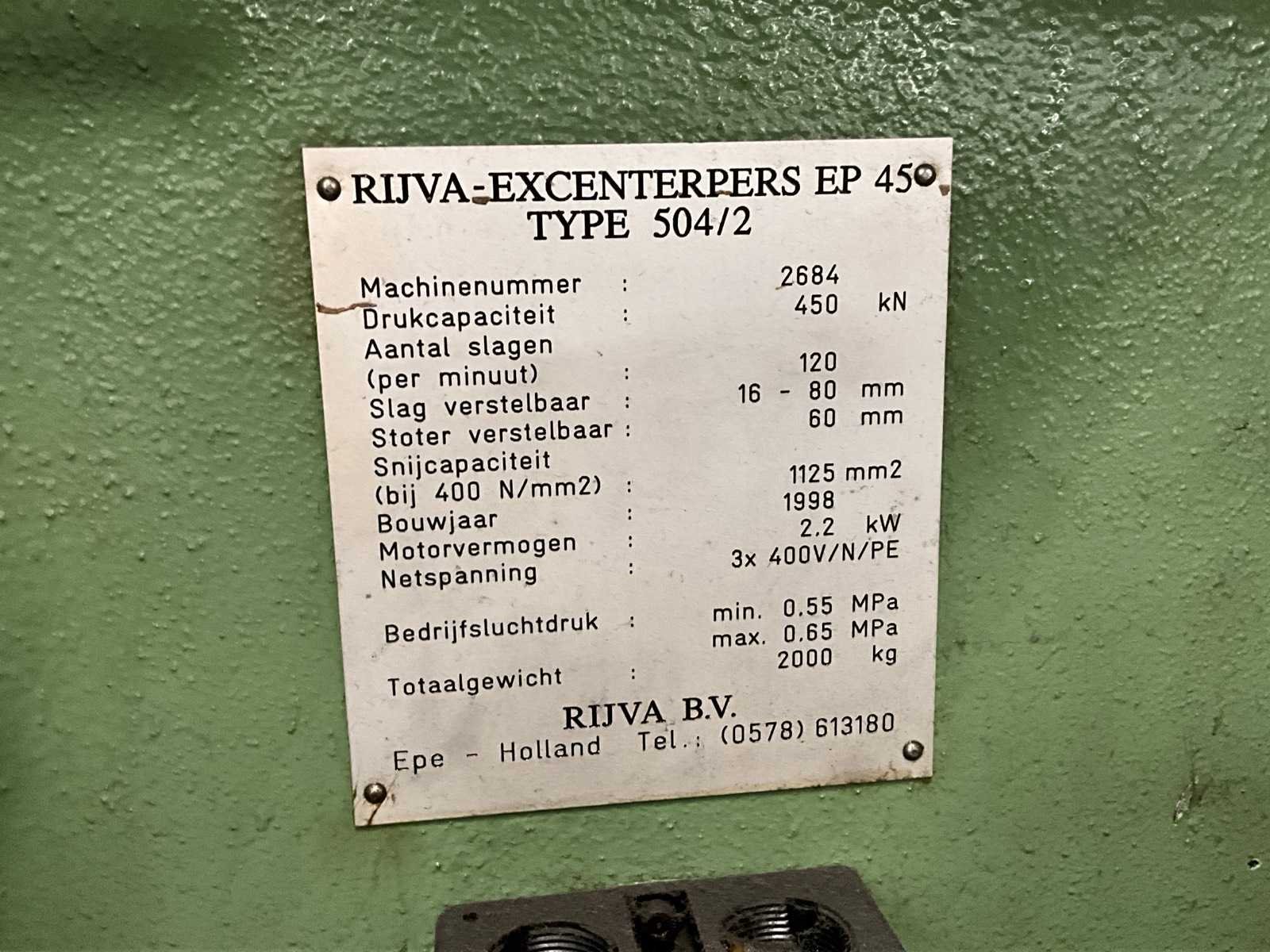 Snij cap. 1125 mm2, slag verstelbaar van 16 - 80 mm, stoter verstelbaar 60 mm; voorzien van voetbediening en pneumatische kleminrichting Merk: Rijva Type: 504/2 Bouwjaar: 1998 Serienummer: 2684 Capaciteit.: 45t Uitlading: 230mm Tafel afmeting l: 600mm Tafel afmeting b: 440mm Motorvermogen (kW): 2.2kW Aansluiting: 400V Machinegewicht: 2000kg Afmeting l: 1500mm Afmeting b: 900mm Afmeting h: 2200mm