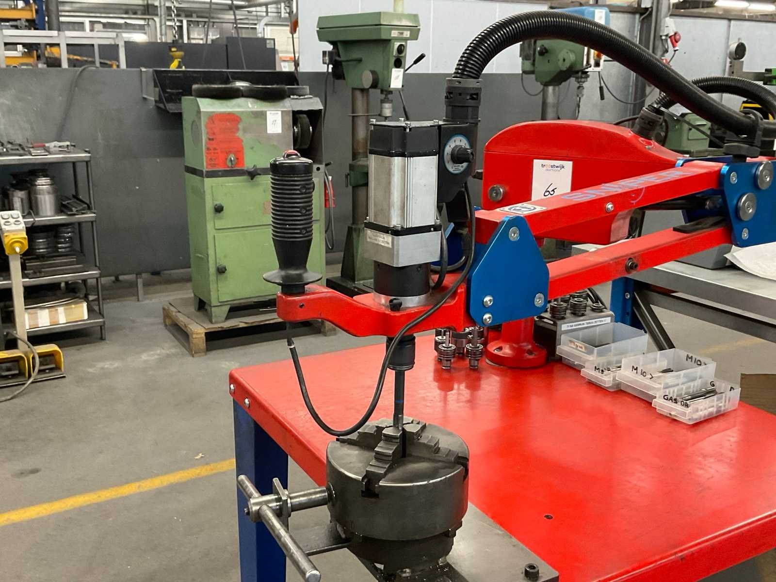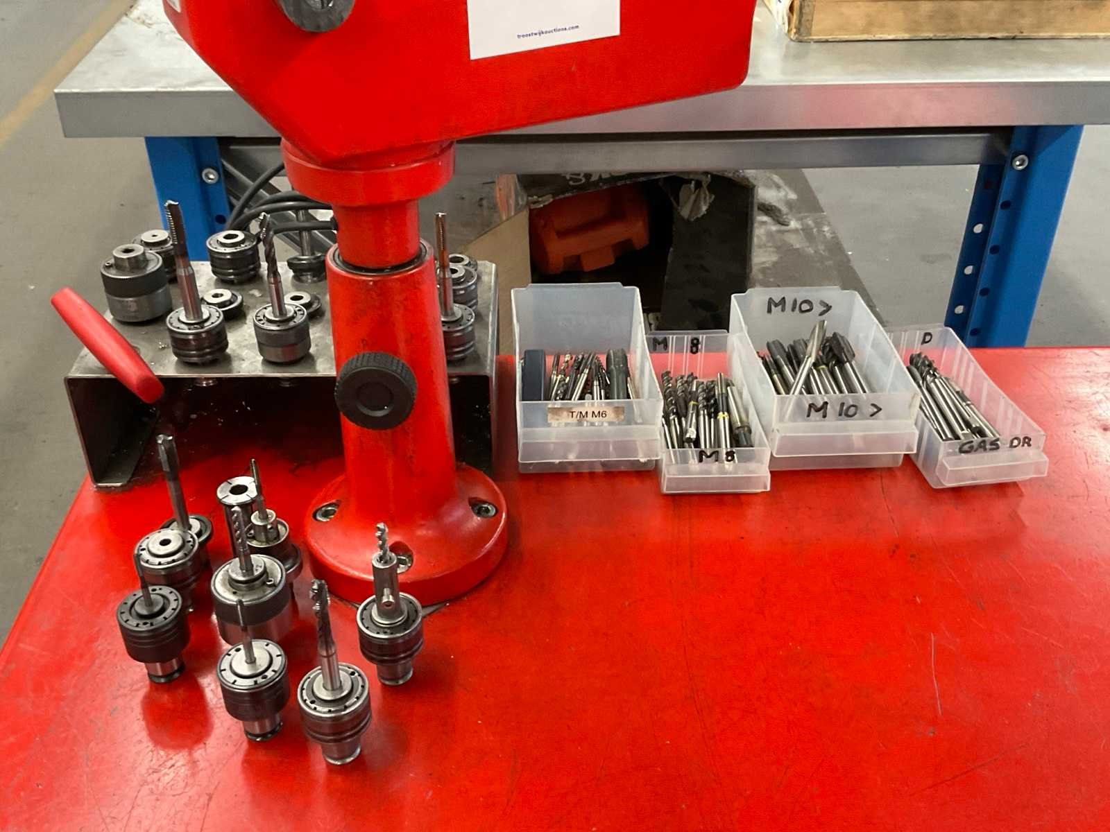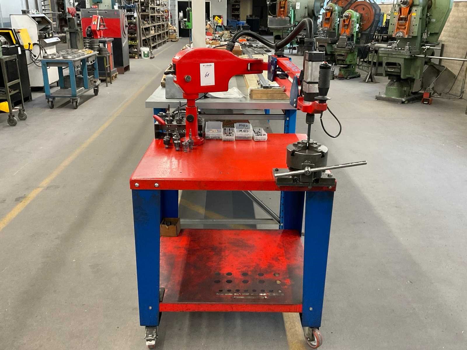 Cap. staal M2 - M14; cap. aluminium M2 - M16; snelheid 40-450 RPM; max. kracht 39 Nm; werkbereik 1100 mm; incl. snelwissel tapadapters, tappen, op verrijdbare tafel Merk: Volumec Type: SNP400 Bouwjaar: 2018 Aansluiting: 230V Totale afmeting L: 900mm Totale afmeting Breedte: 800mm Totale afmeting Hoogte: 1400mm