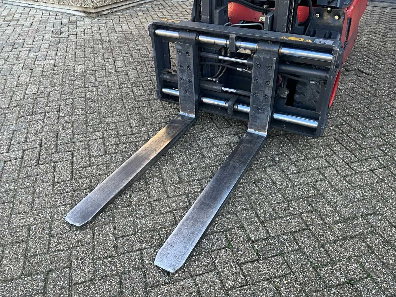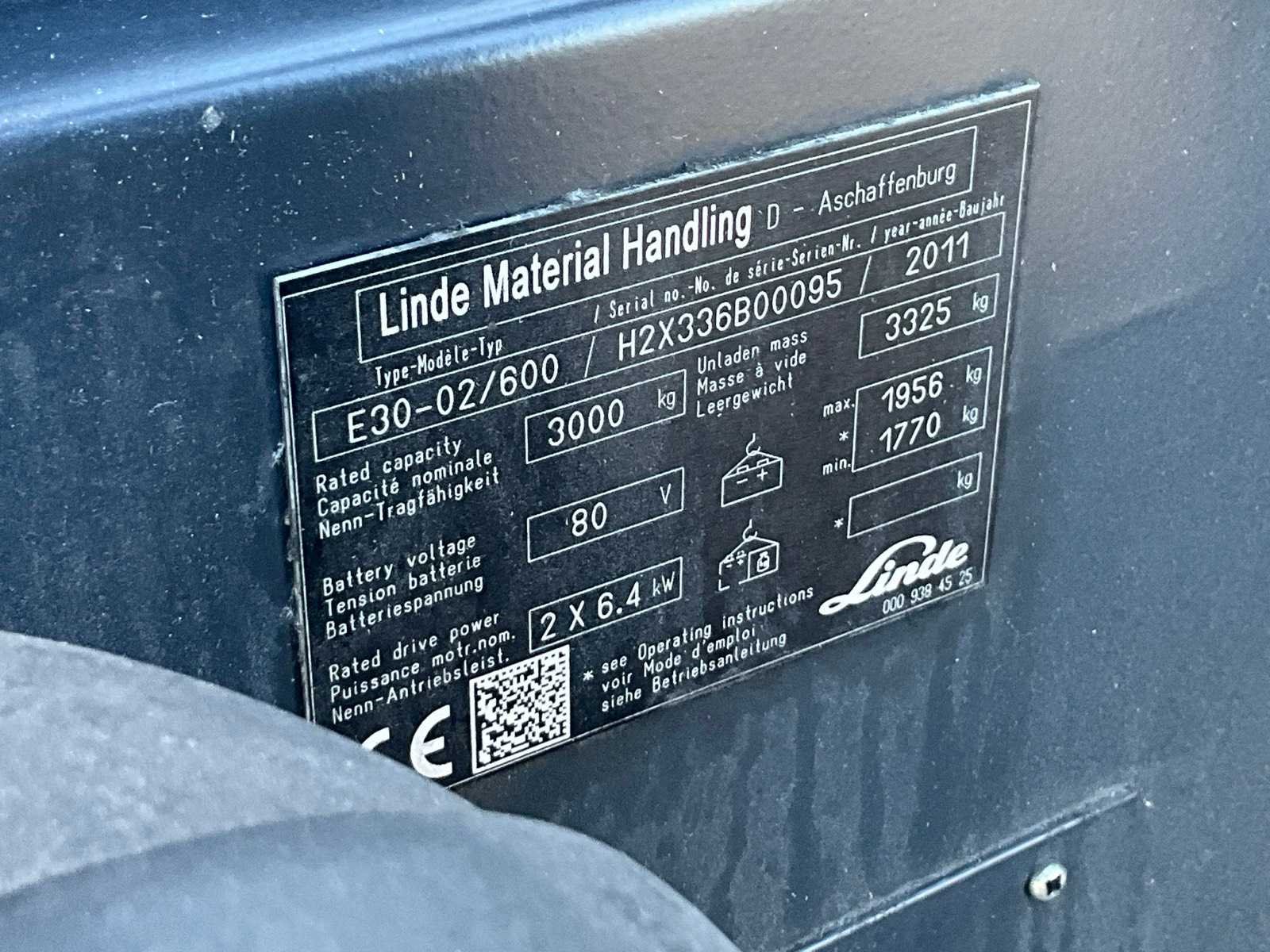 Merk: Linde Type: E30-02/600 Bouwjaar: 2011 Serienummer: H2X336B00095 Brandstof: Elektrisch Mast: Duplex Soort band: Volrubber banden Aantal wielen: 4 Afgelezen urenstand: 3361 Accu lader: true Side-shift: true Hydraulisch verstelbare lepels: true Duplex mast: true Eigen gewicht: 5281kg Hefvermogen: 3000kg Lepellengte: 1190mm Hefhoogte: 3250mm Vol rubber banden: true Minimale doorrijhoogte: 2250mm Totale afmeting L: 3750mm Totale afmeting Breedte: 1300mm Totale afmeting Hoogte: 2250mm