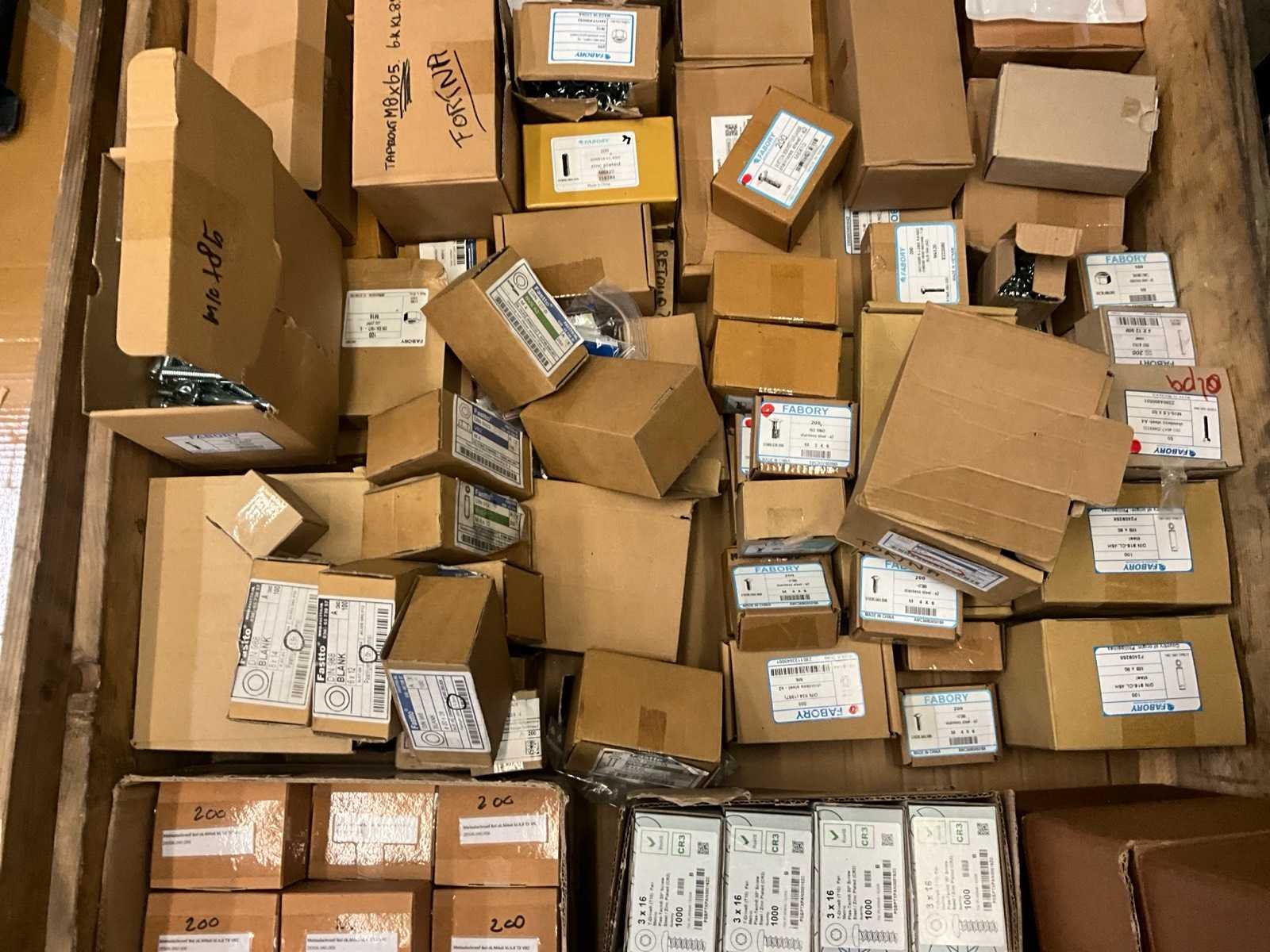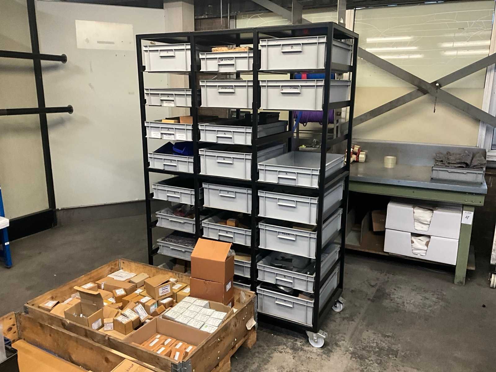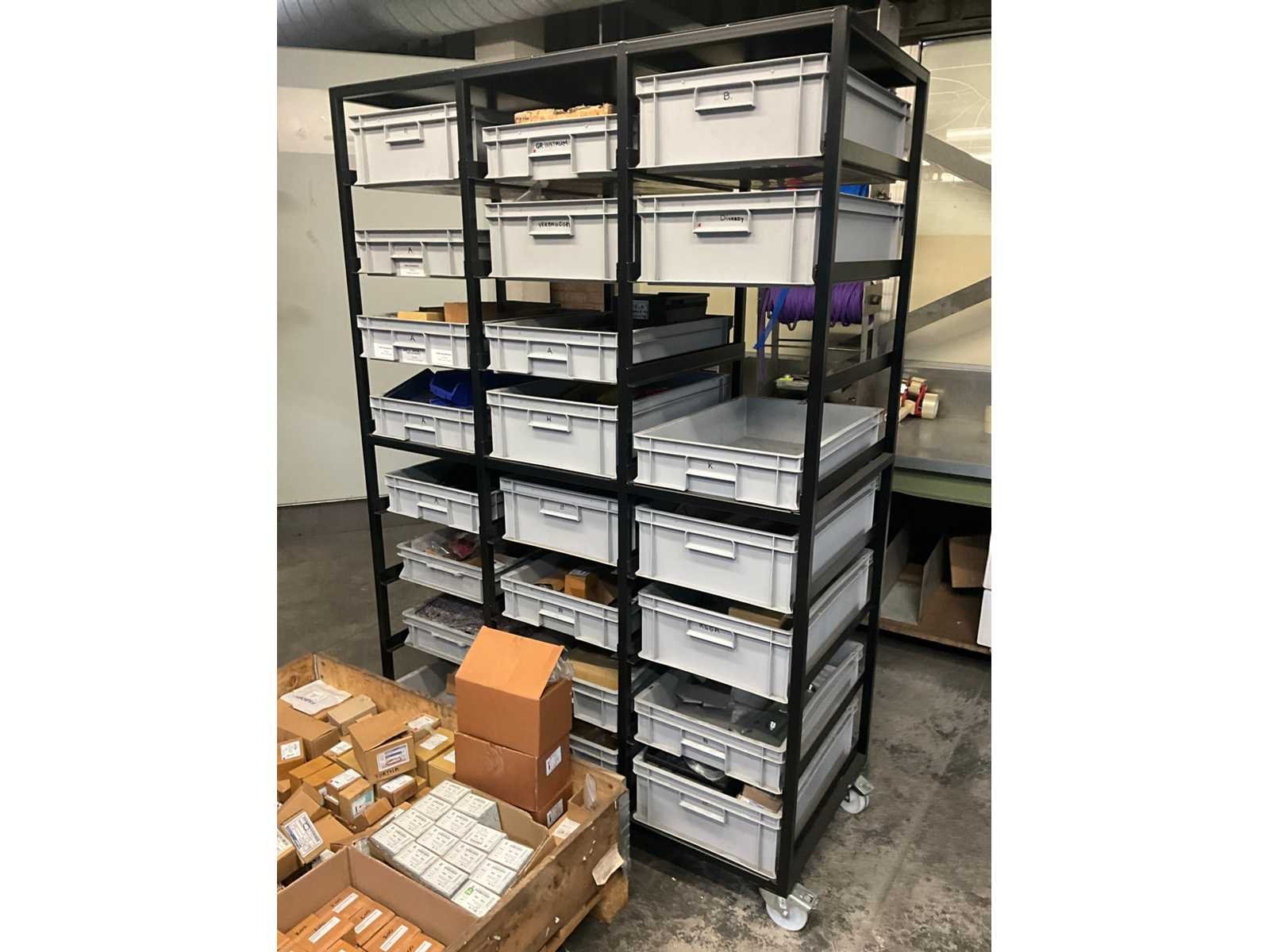 Bestande uit 2 pallets met diverse schroeven; inclusief verrijdbare stelling met inhoud 133x61x195 cm