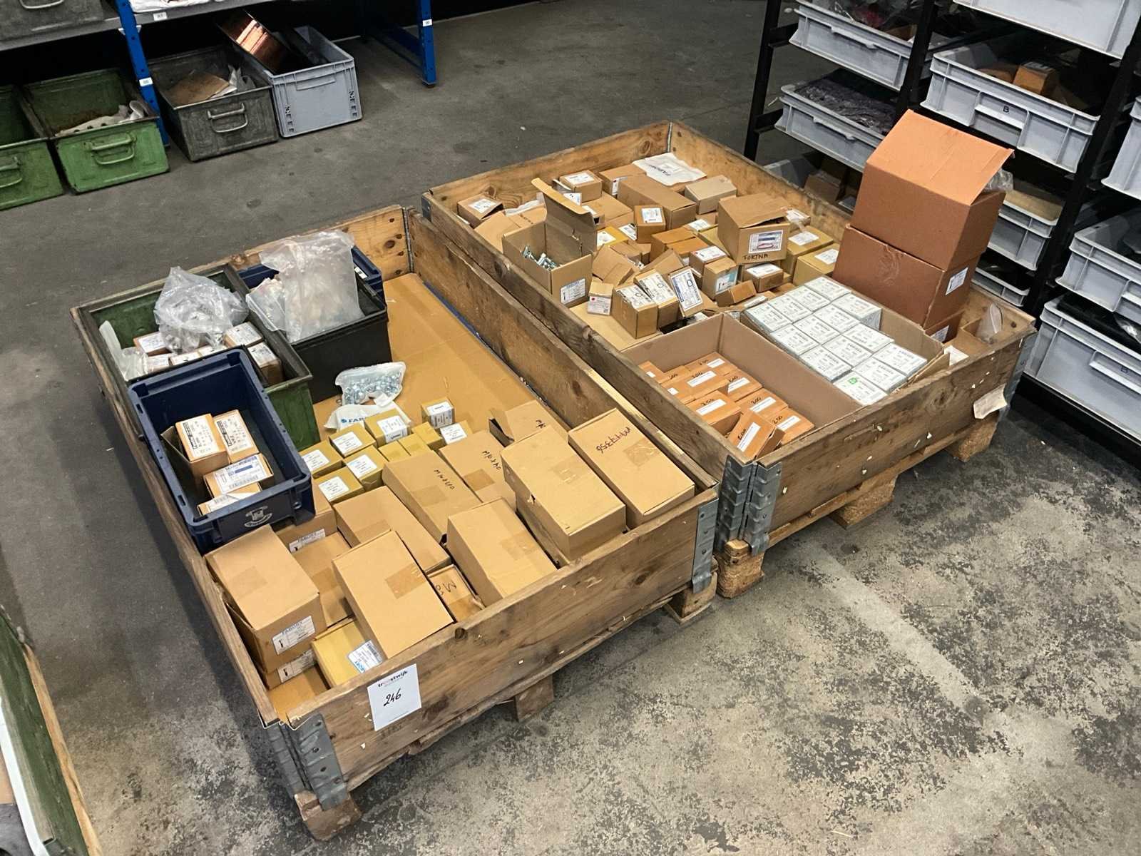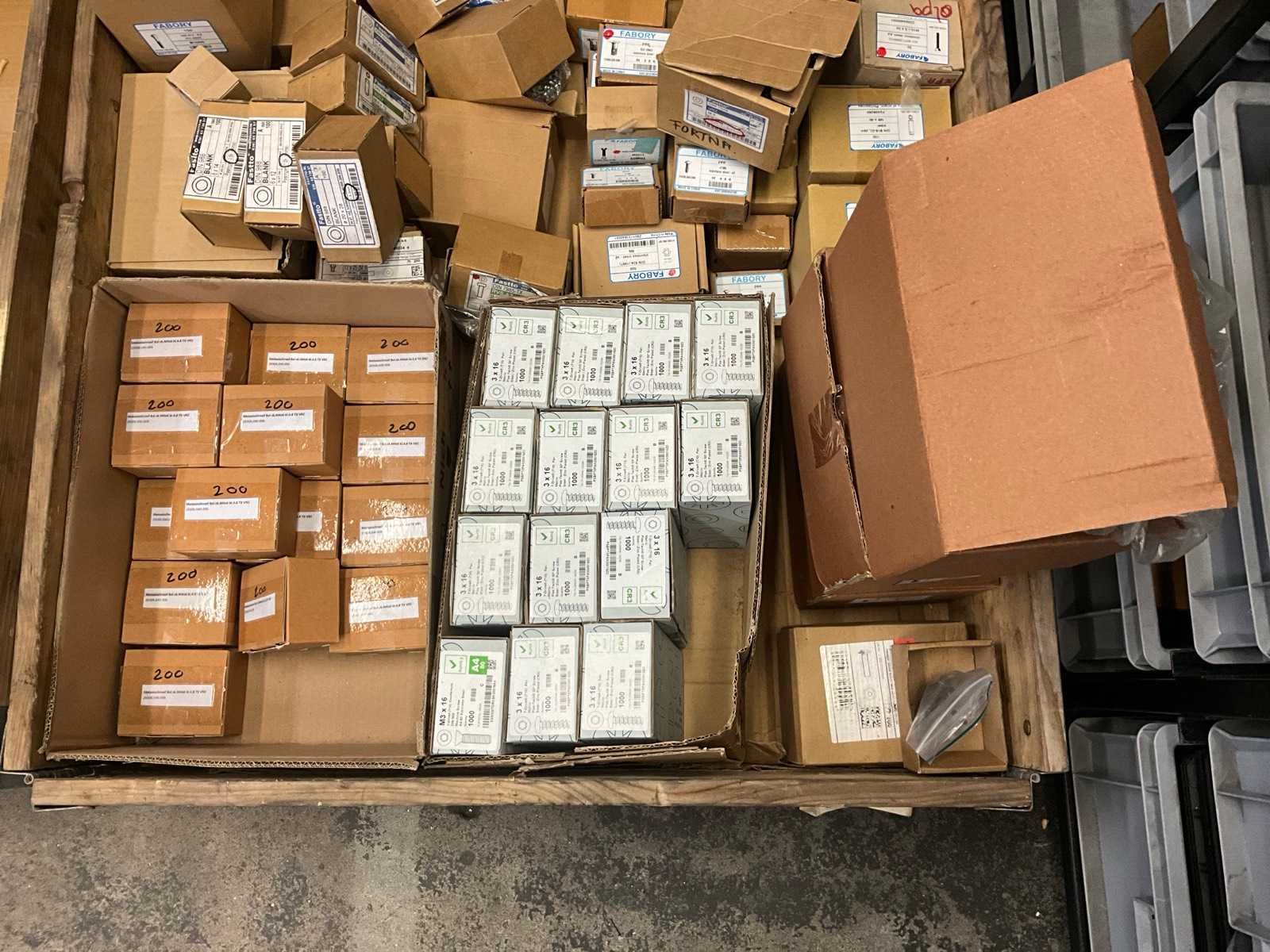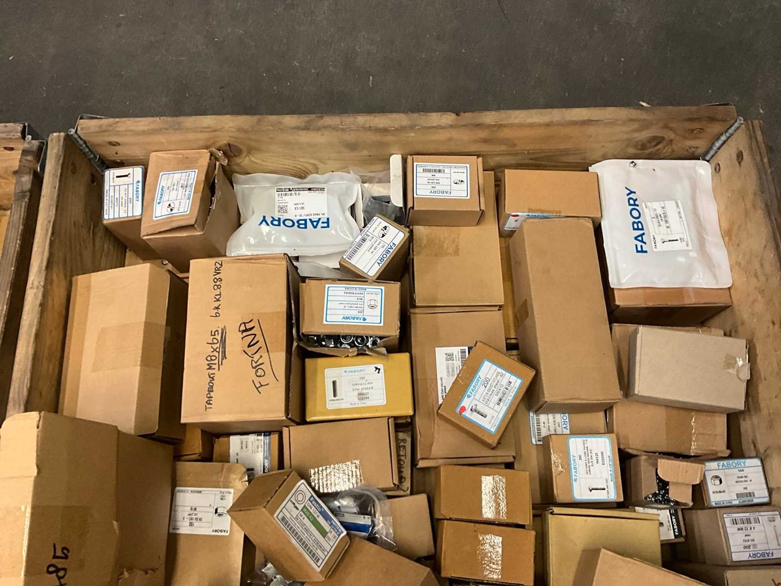 Bestande uit 2 pallets met diverse schroeven; inclusief verrijdbare stelling met inhoud 133x61x195 cm