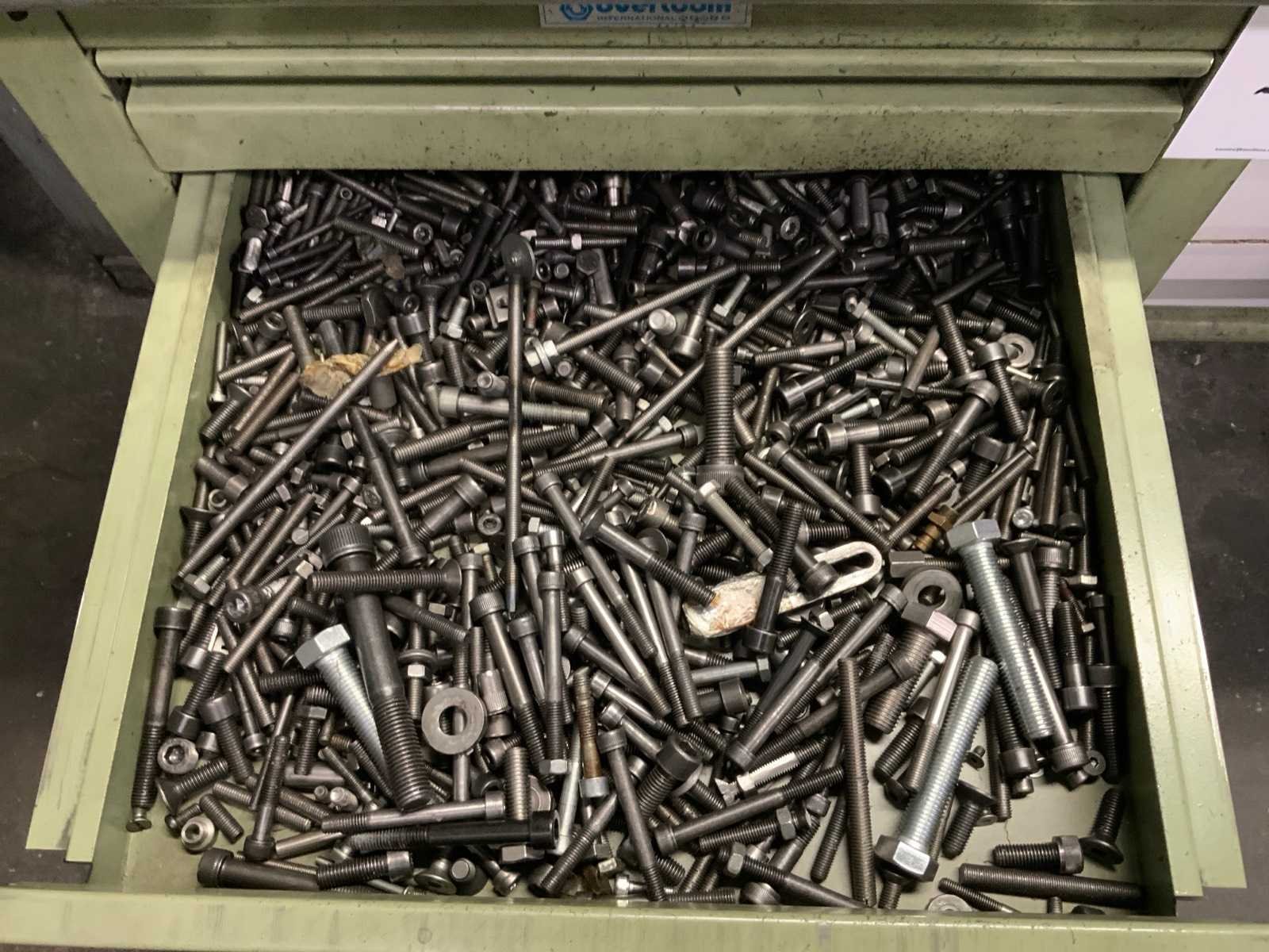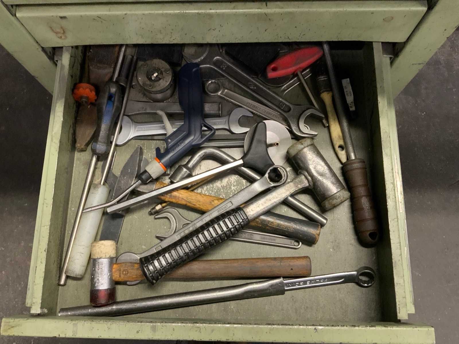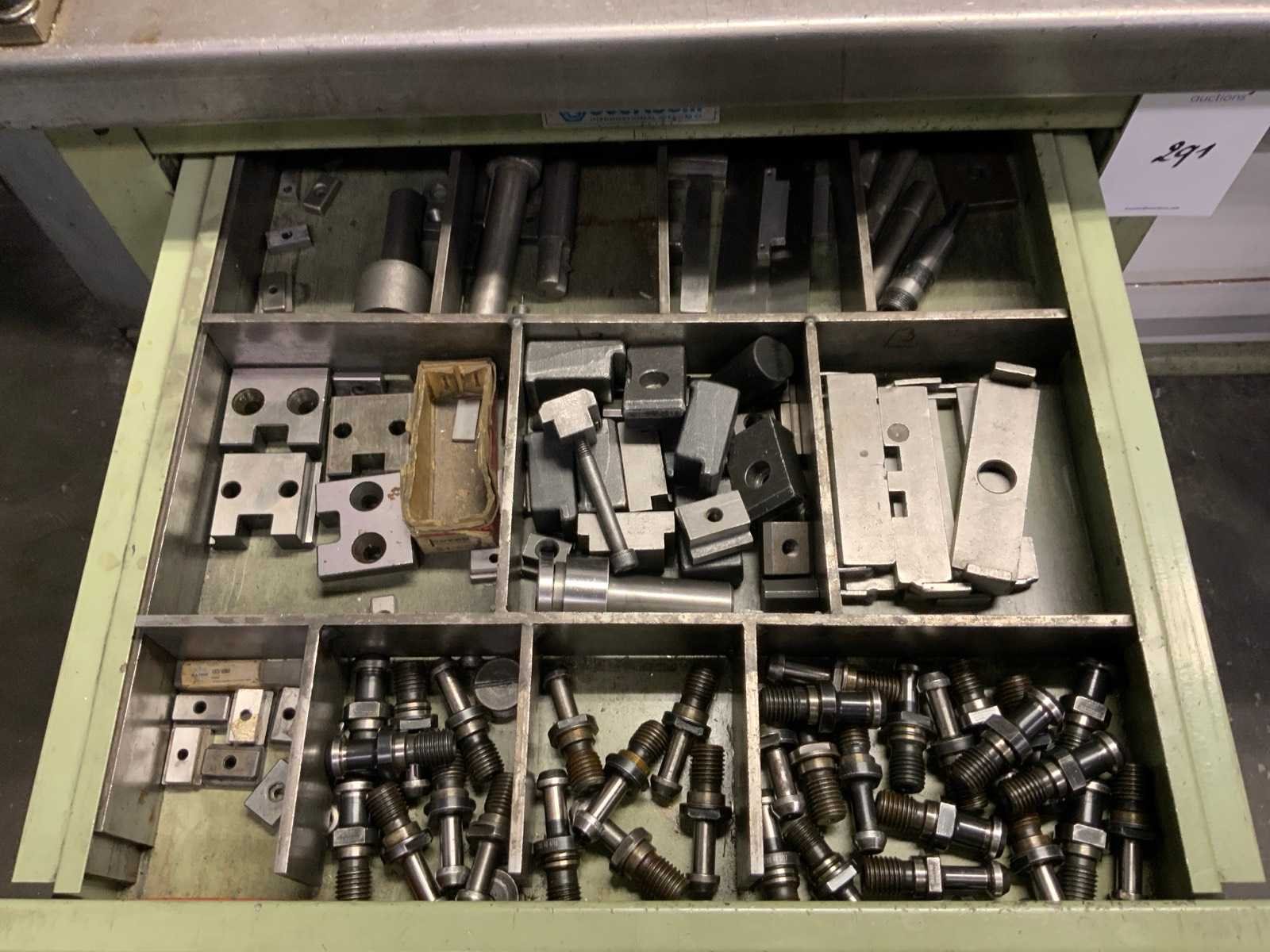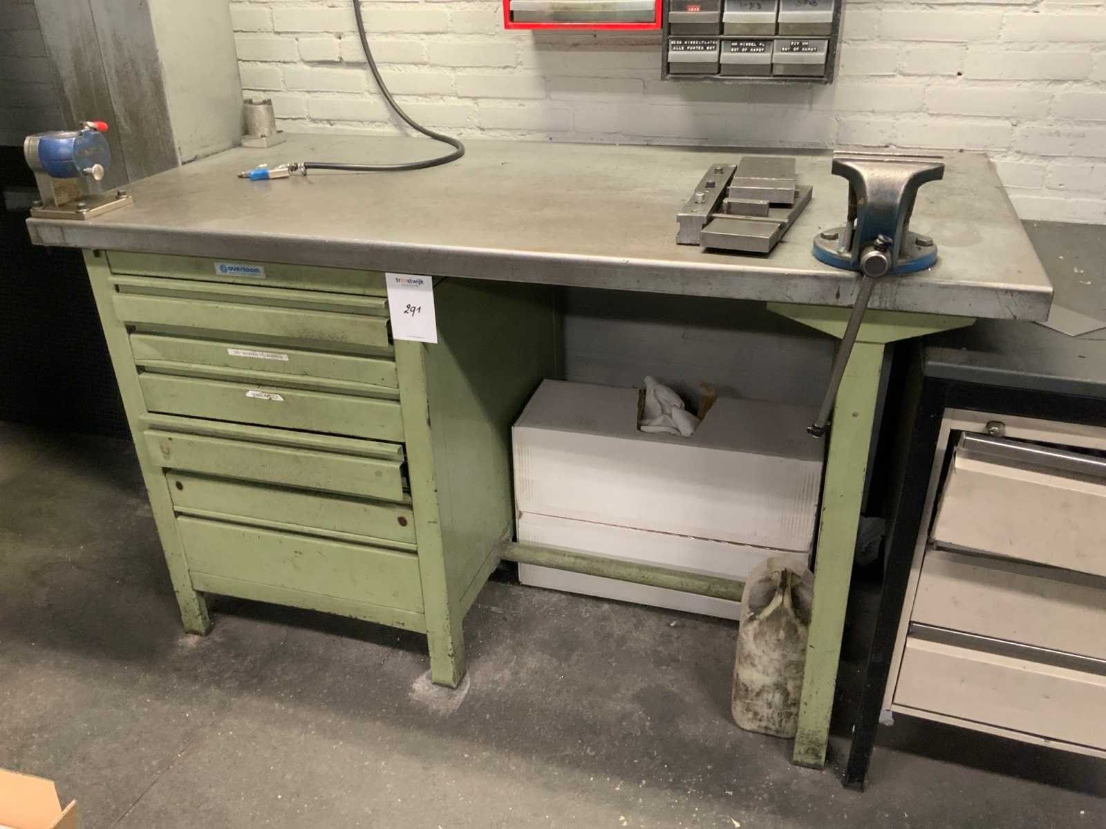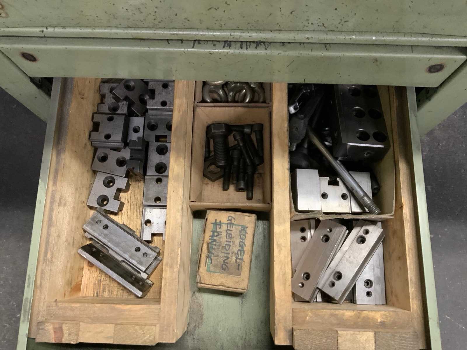 Waaronder: 1 Overtoom werkbank en 1 bureau, blad afmeting: L1500 x B755 mm, met inhoud, waaronder klikplaatjes, aantrekbouten, spantangen, opspangereedschap. inclusief 2 assortiment ladekastjes met tappen en boren