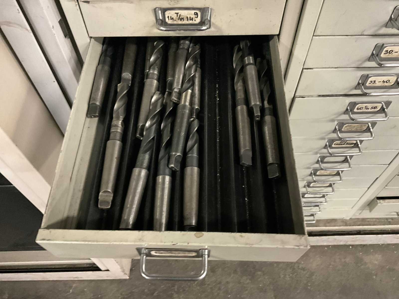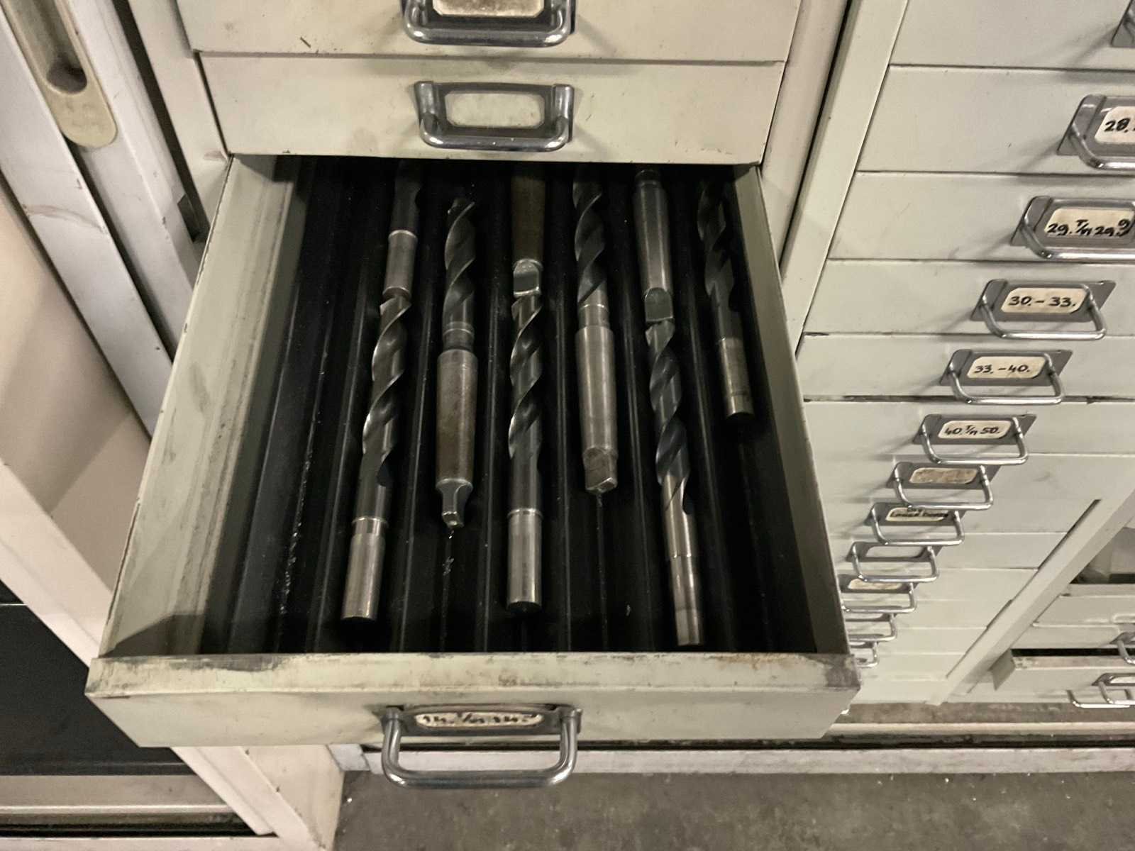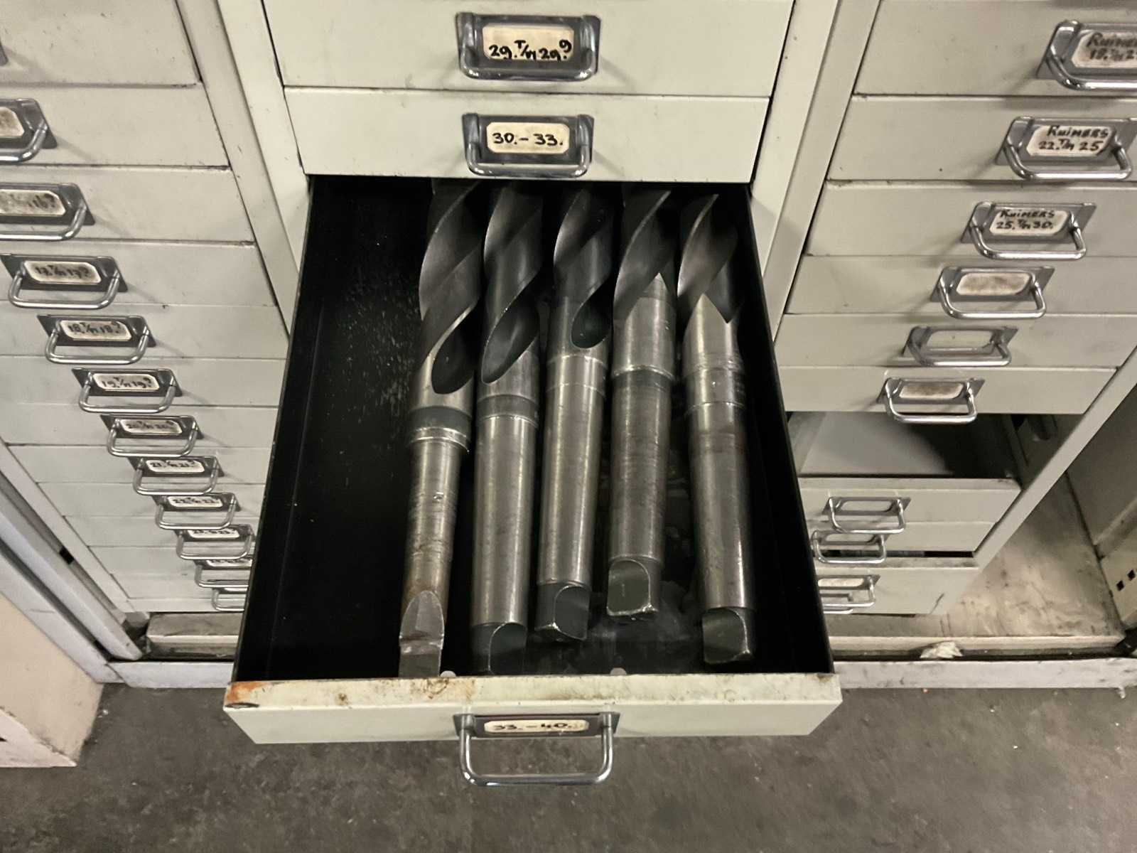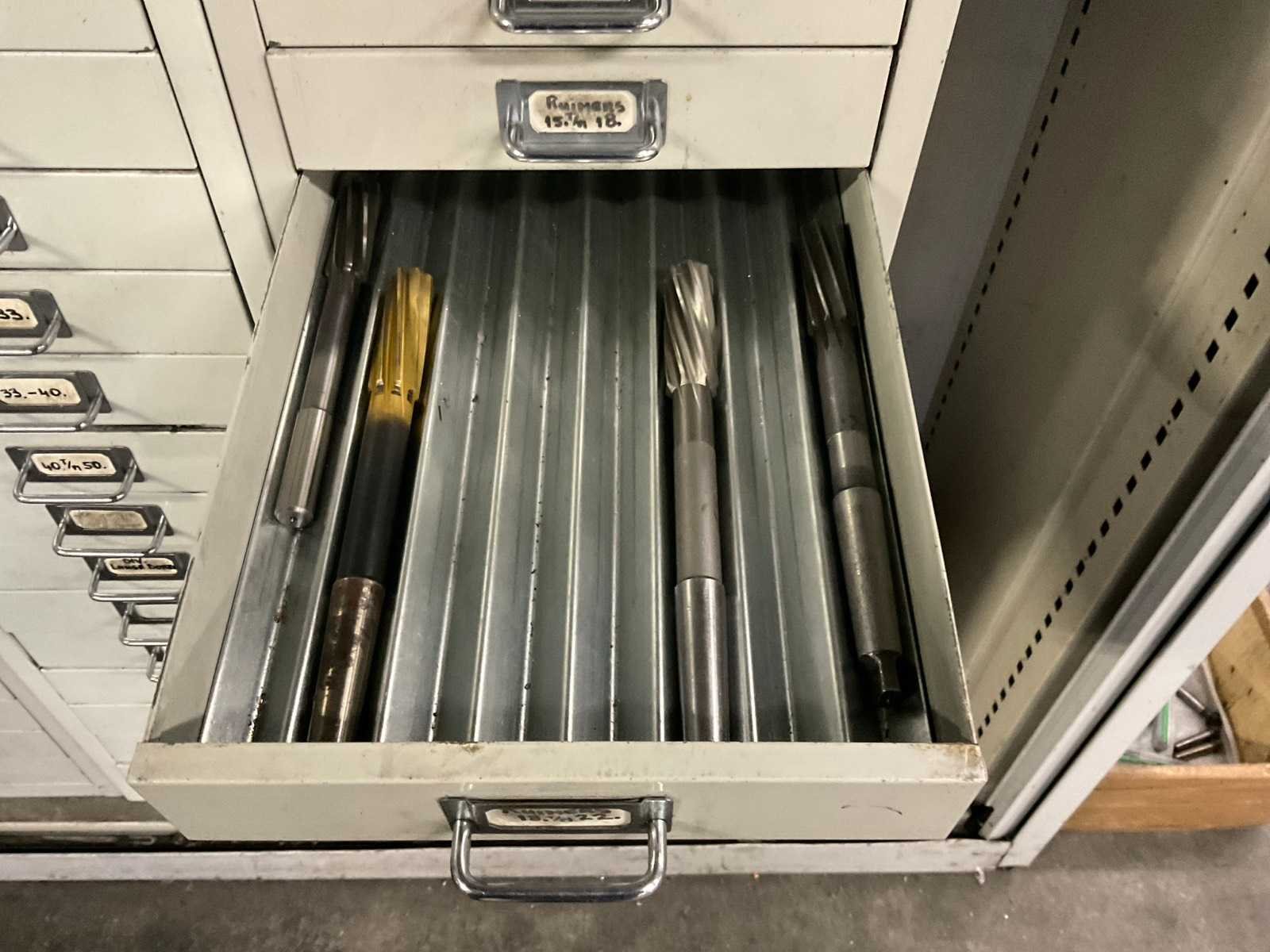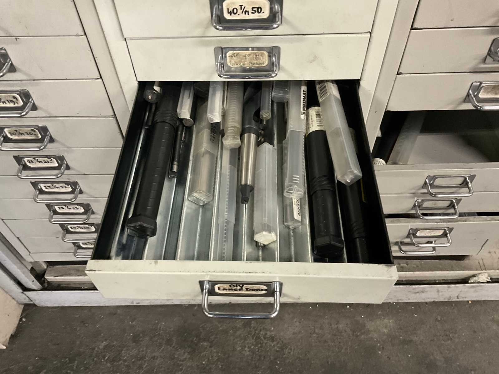 Waaronder: vaste ruimers, wisselsnijplaatjes, verzinkboren. incl. werkplaatskast; afm. ca. 120x47x195 c,m
