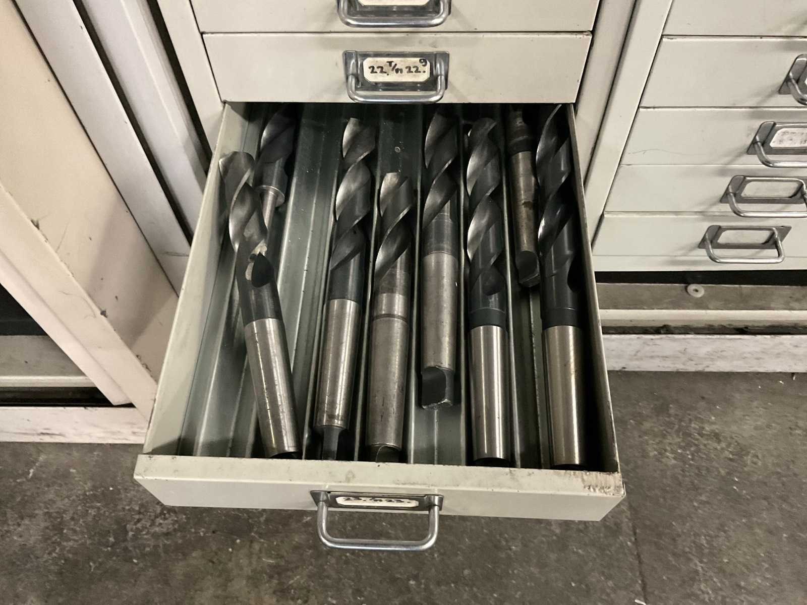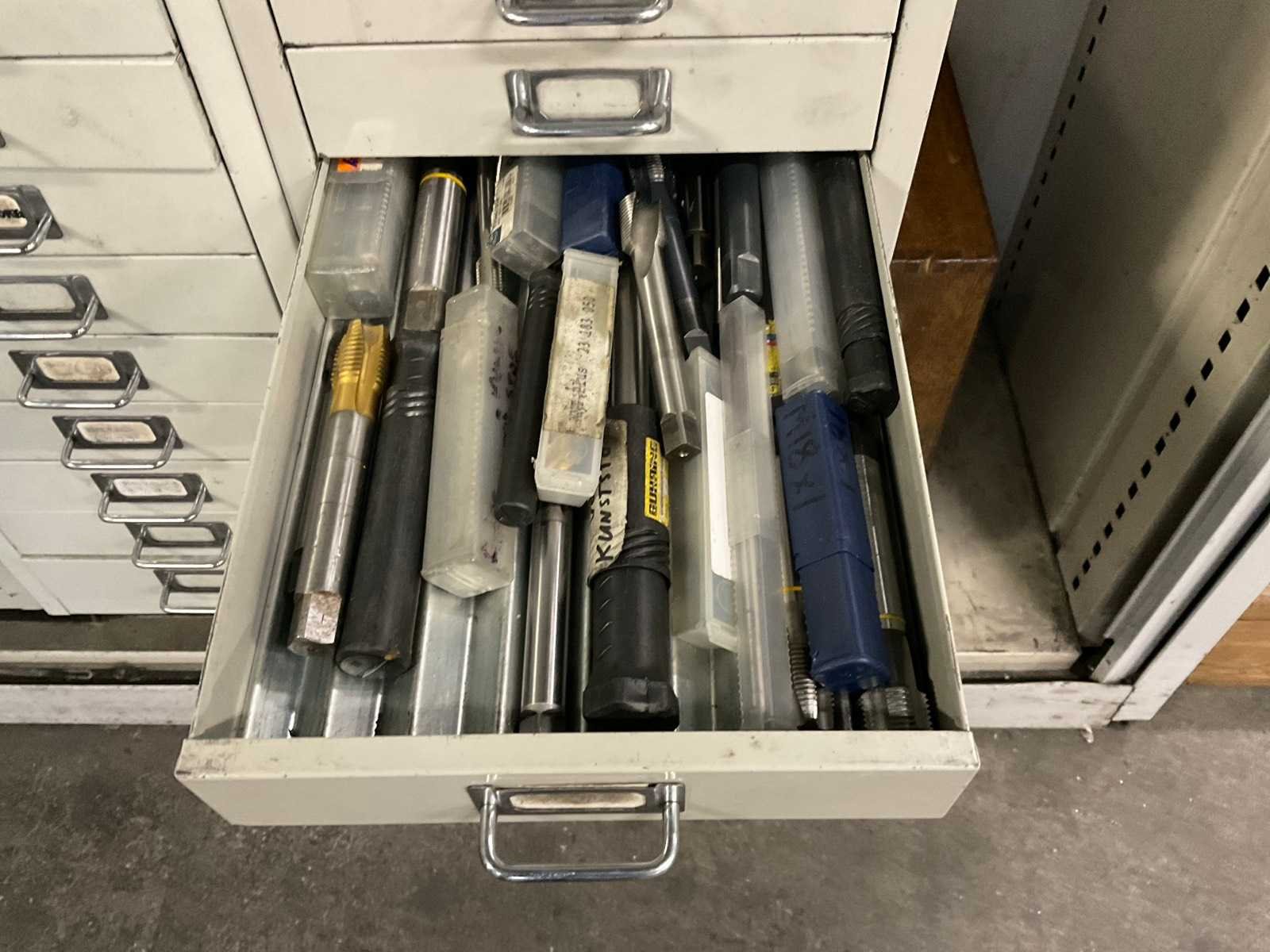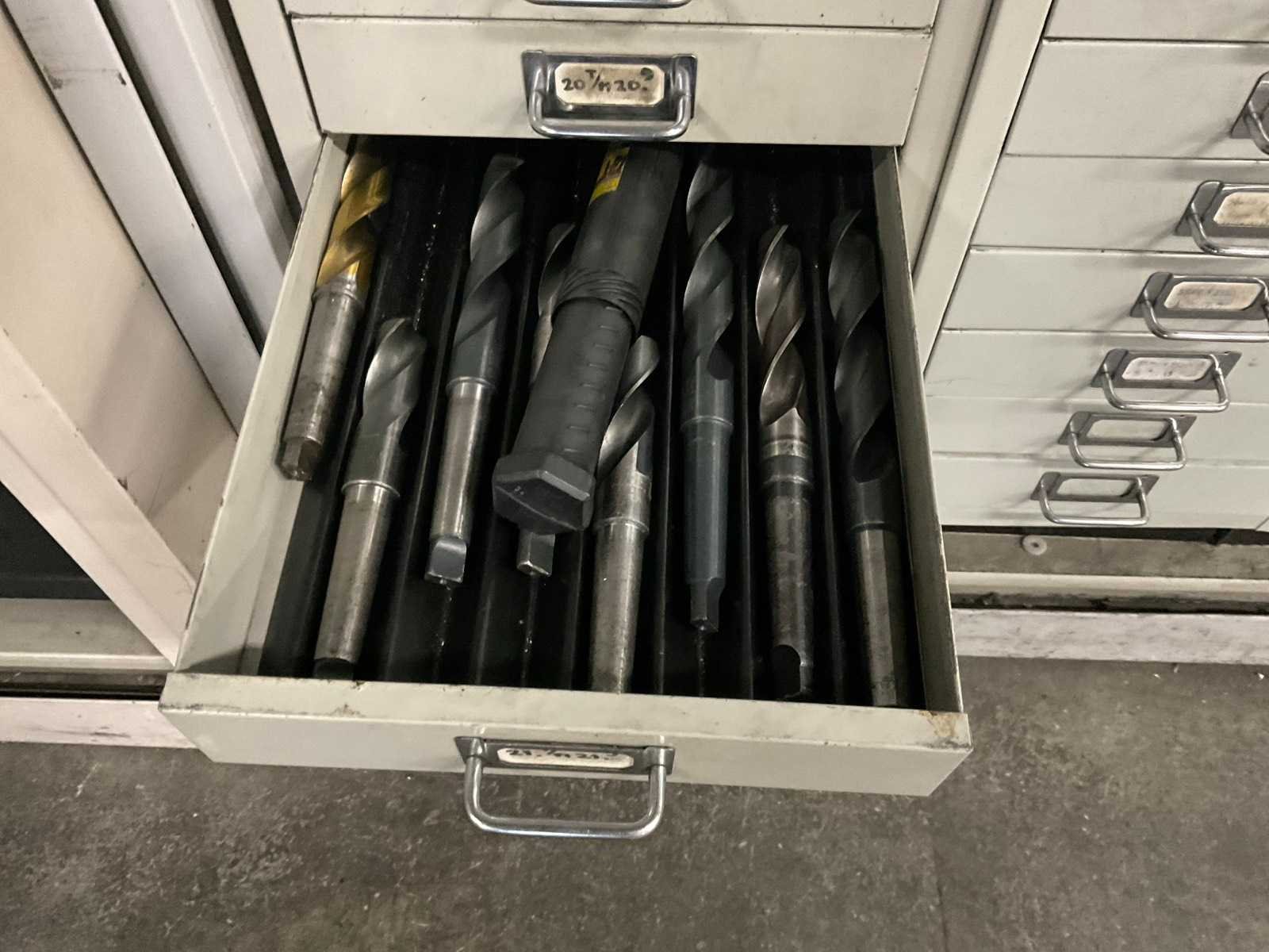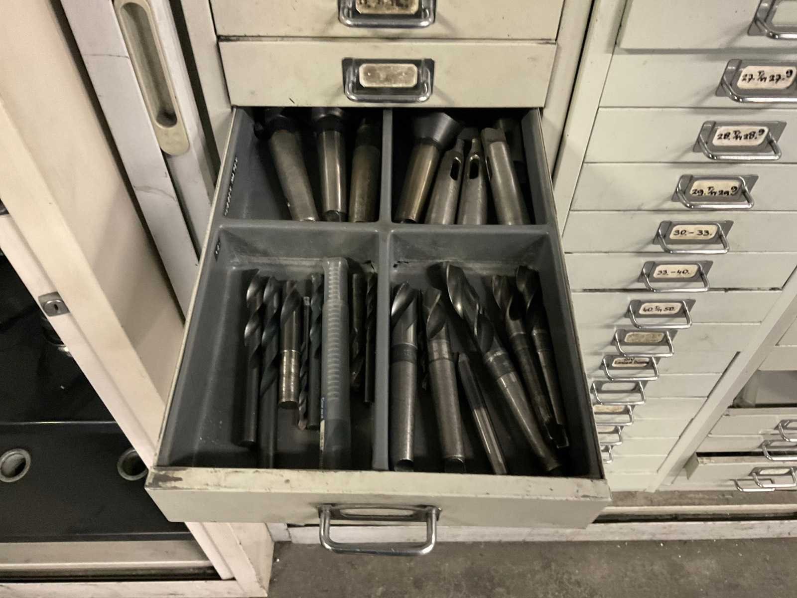 Waaronder: vaste ruimers, wisselsnijplaatjes, verzinkboren. incl. werkplaatskast; afm. ca. 120x47x195 c,m