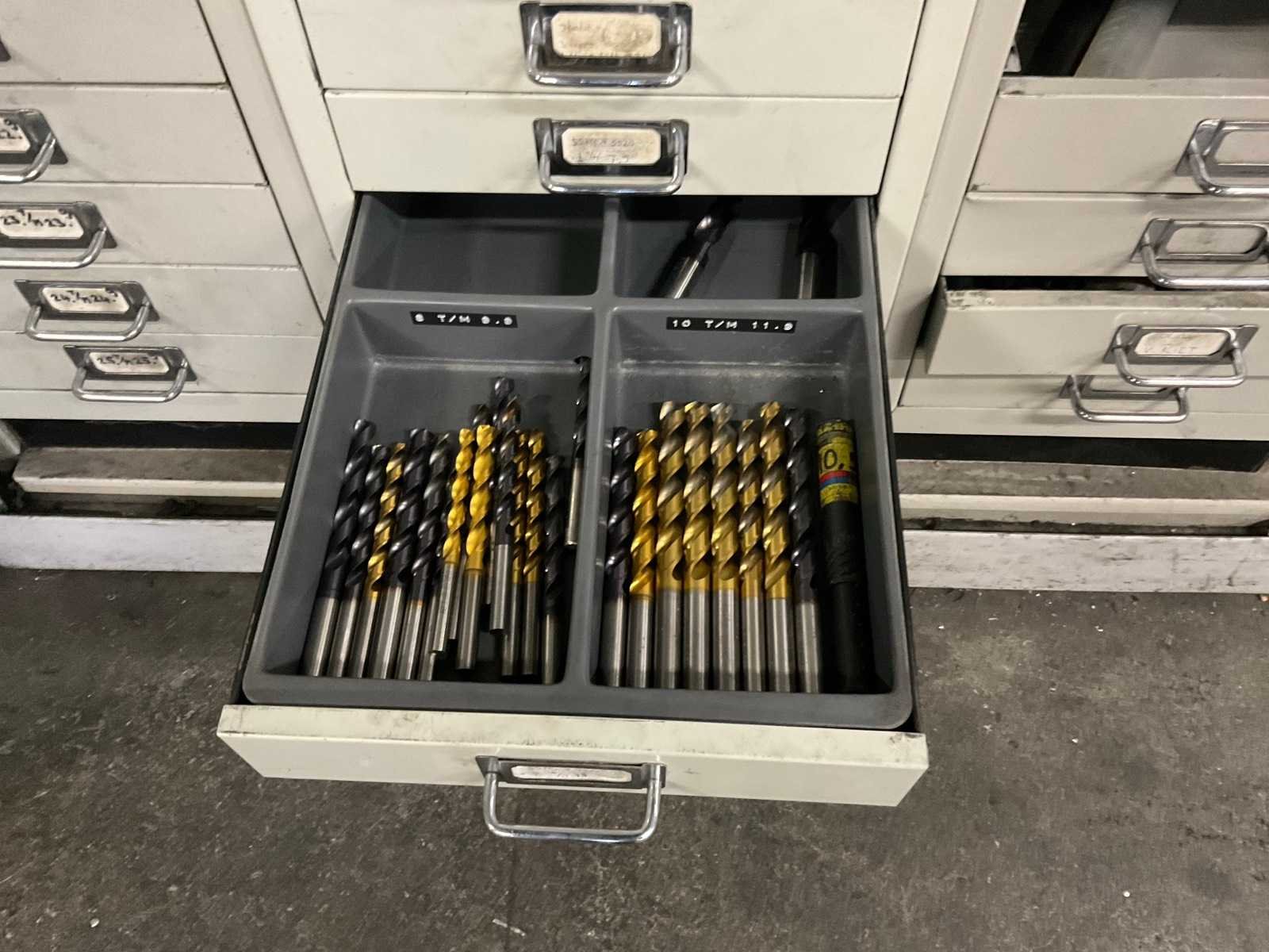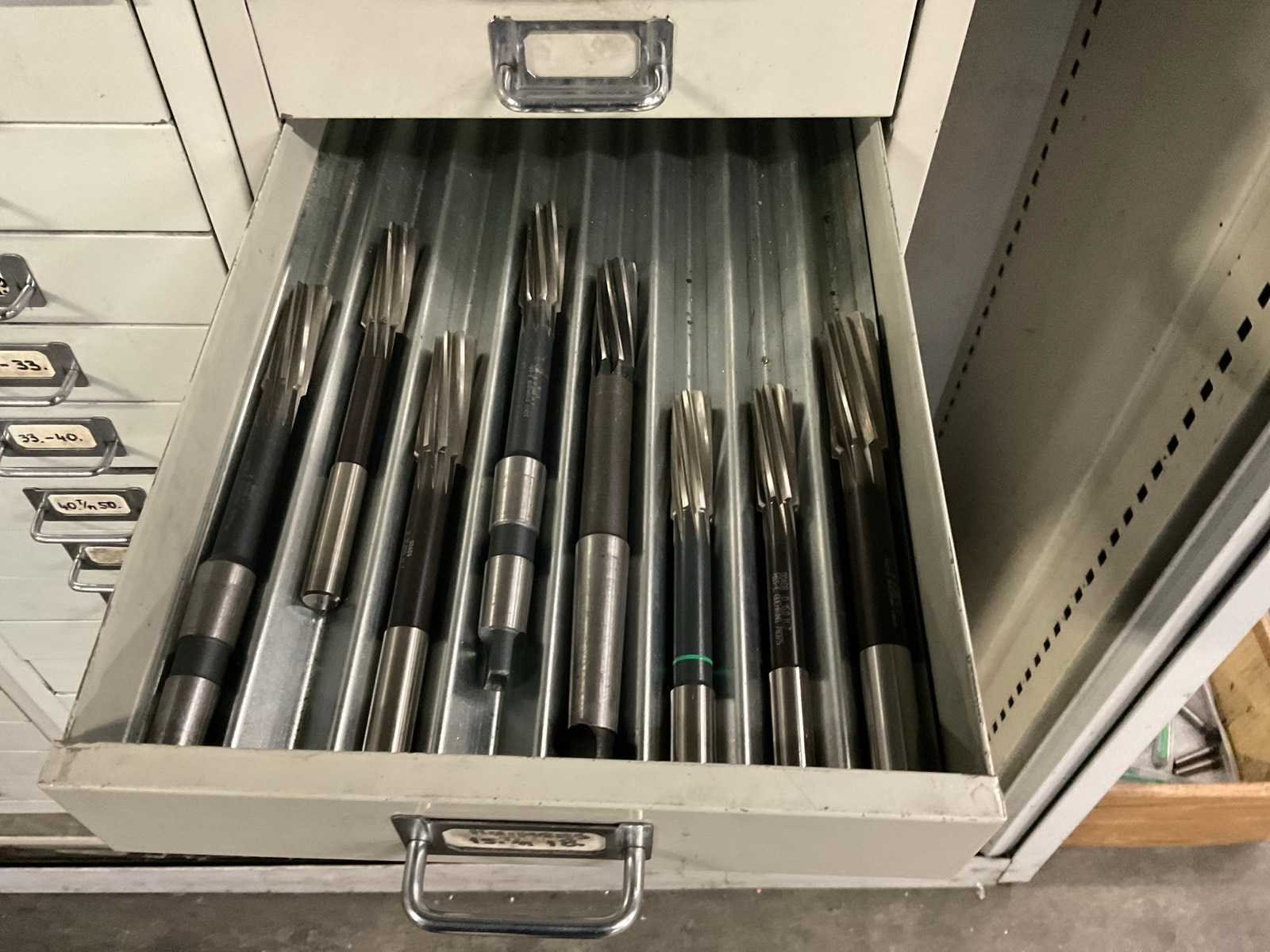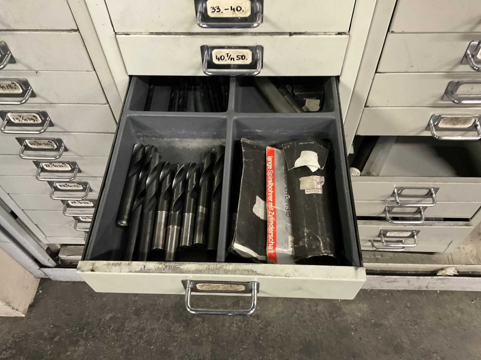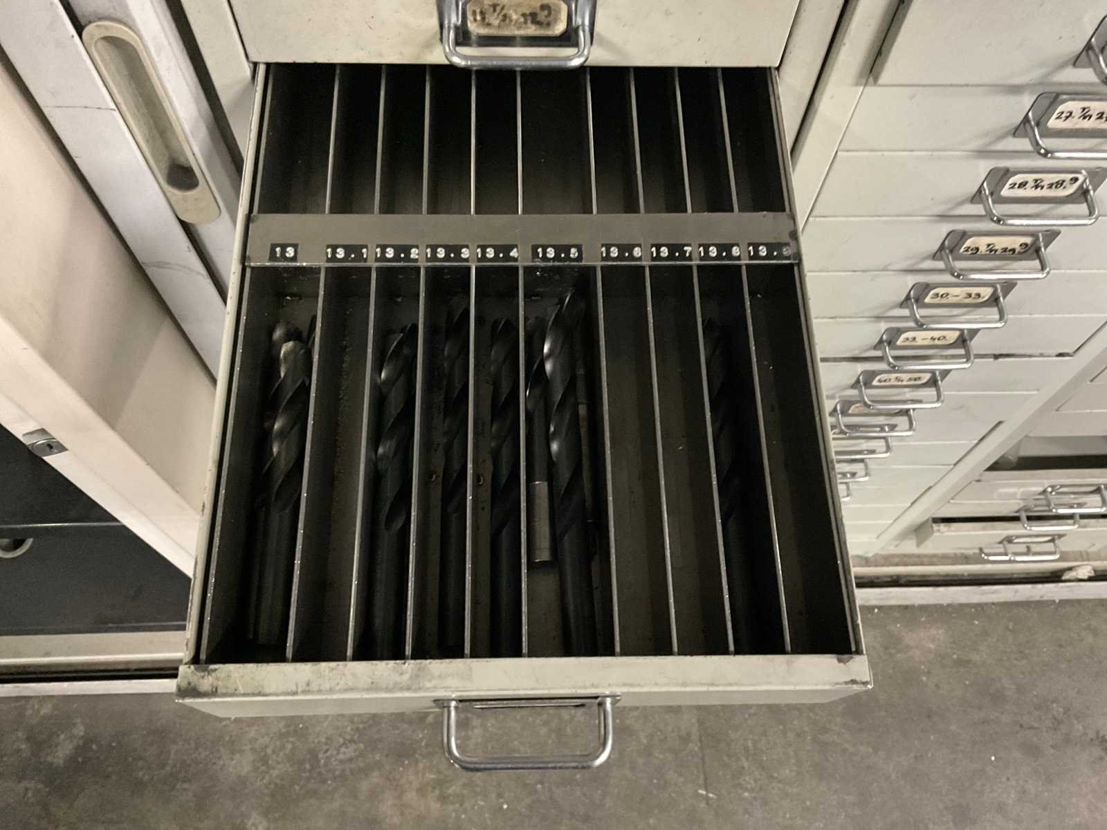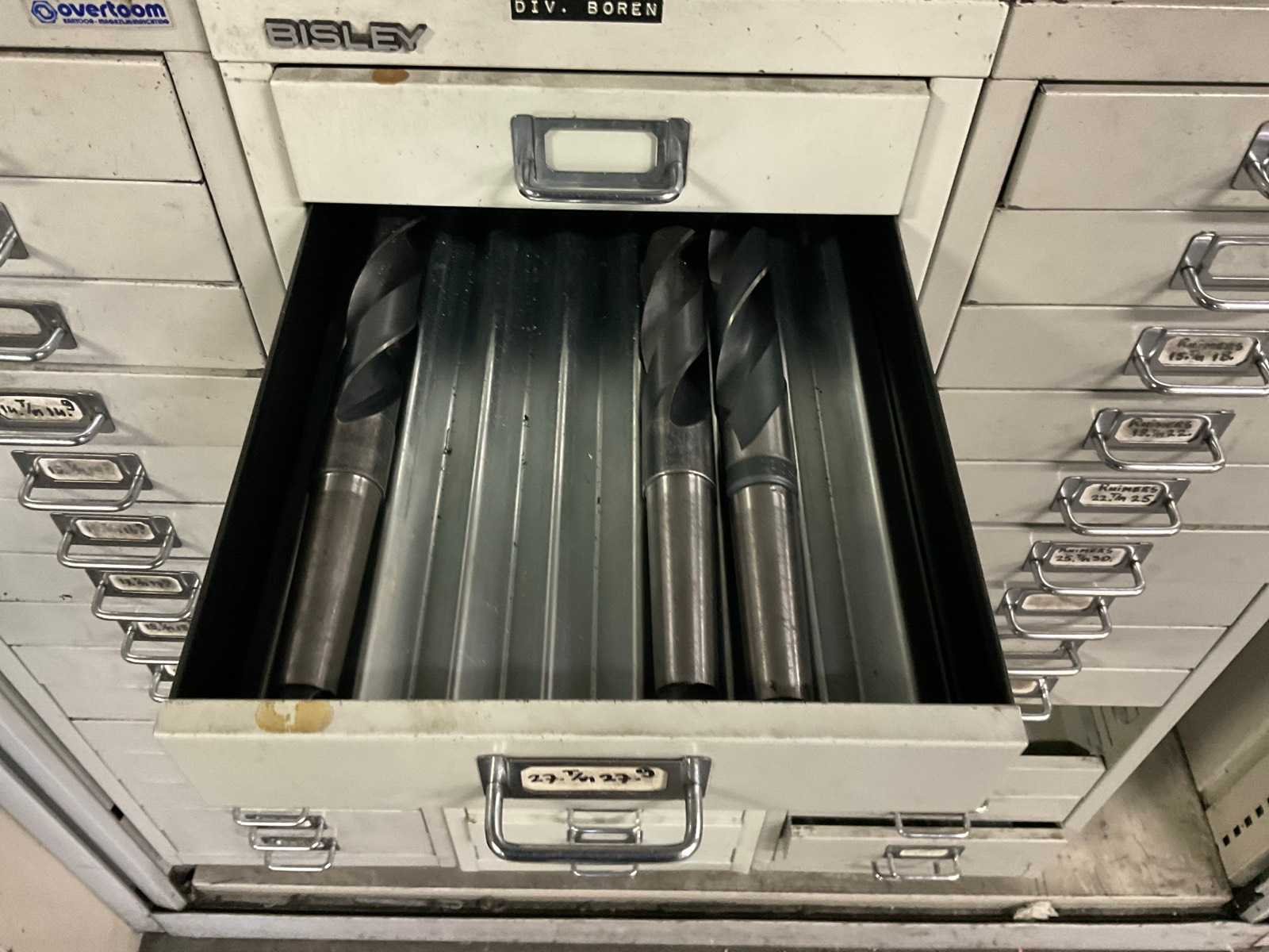 Waaronder: vaste ruimers, wisselsnijplaatjes, verzinkboren. incl. werkplaatskast; afm. ca. 120x47x195 c,m