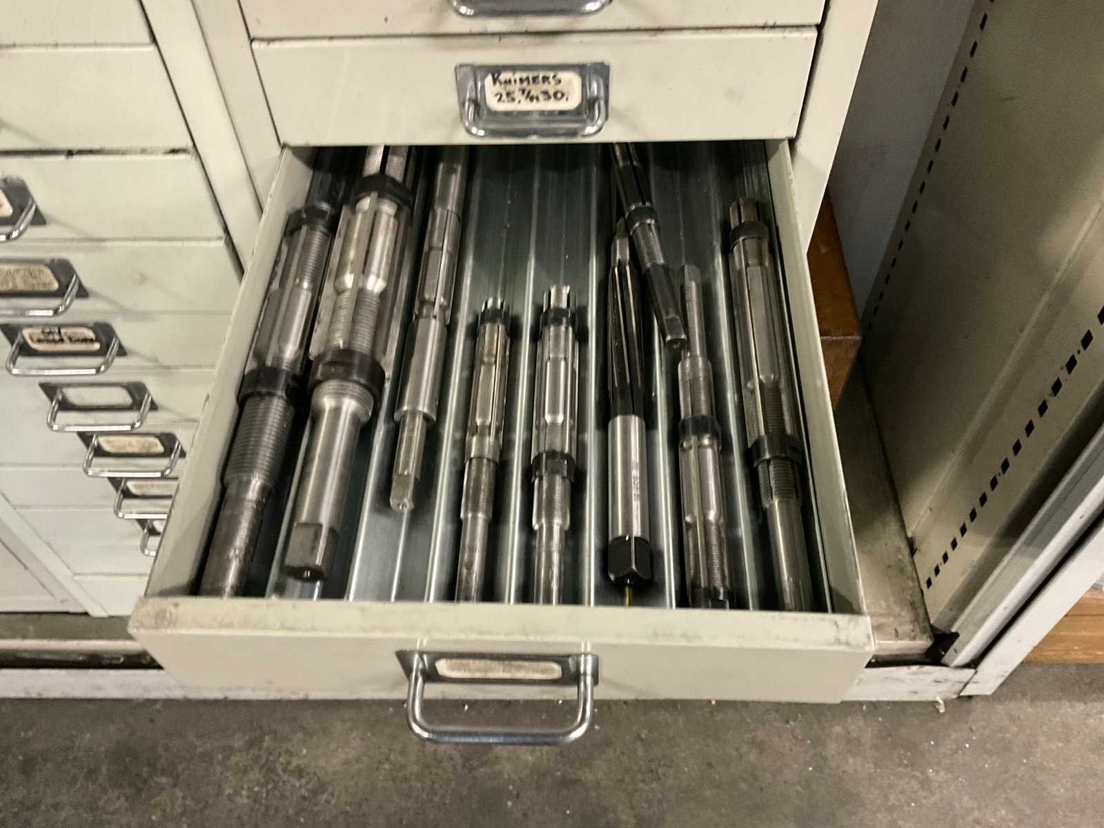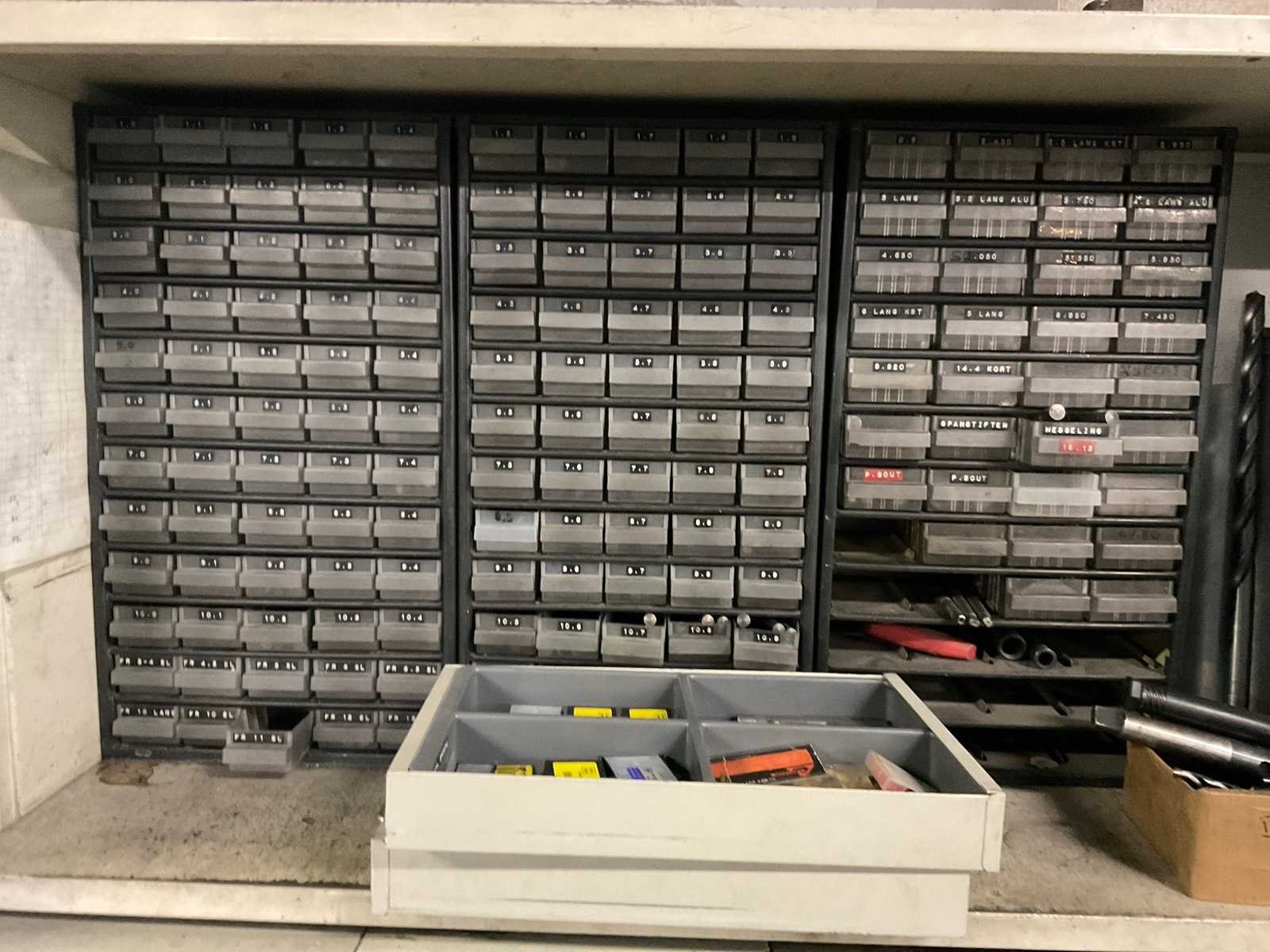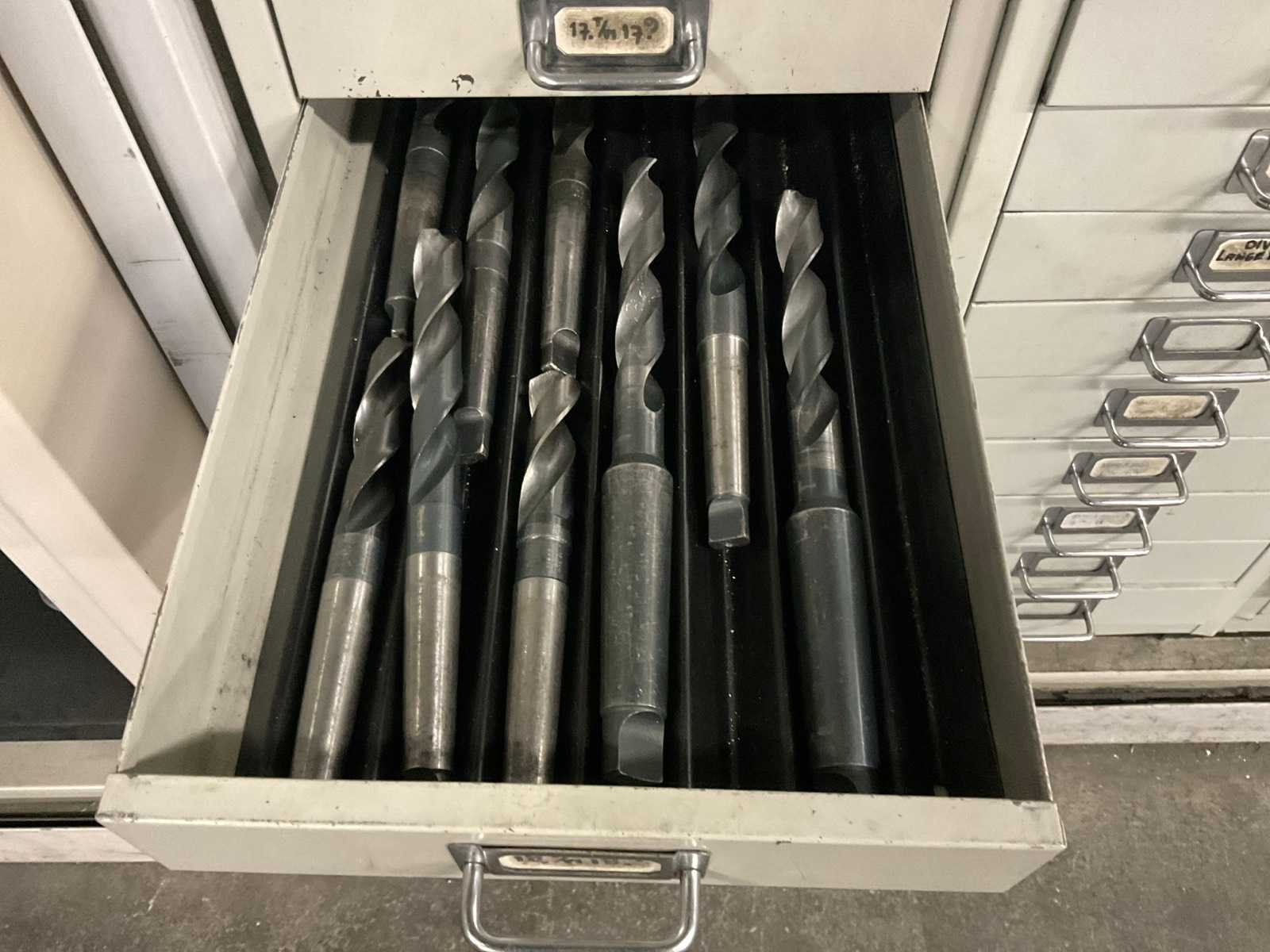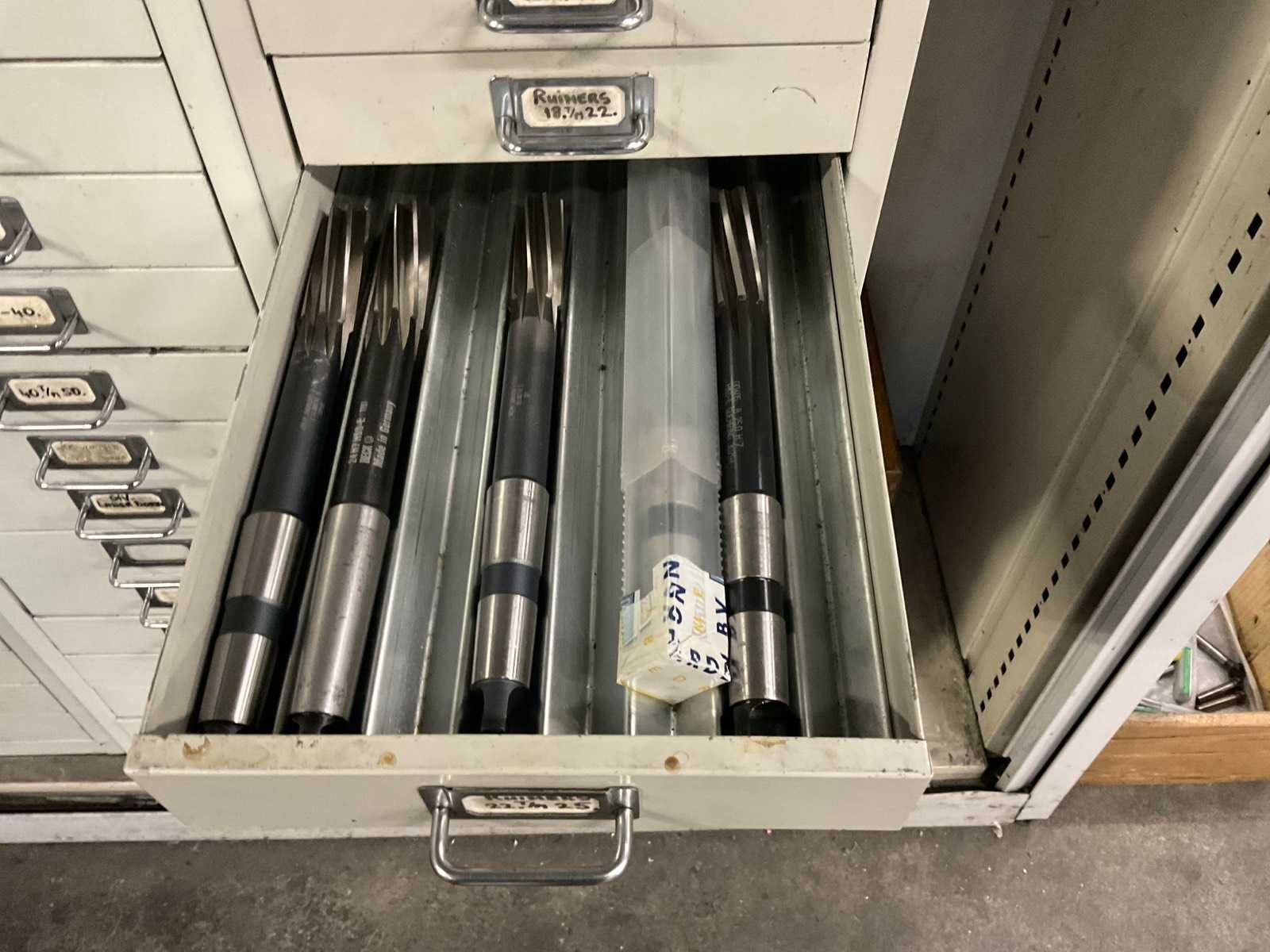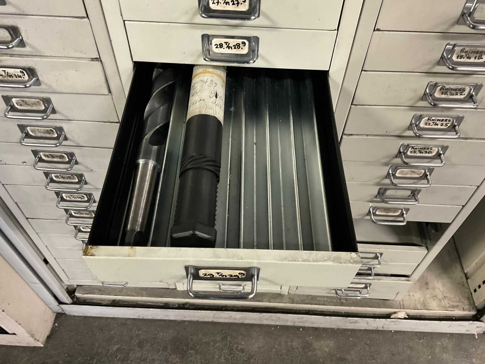 Waaronder: vaste ruimers, wisselsnijplaatjes, verzinkboren. incl. werkplaatskast; afm. ca. 120x47x195 c,m